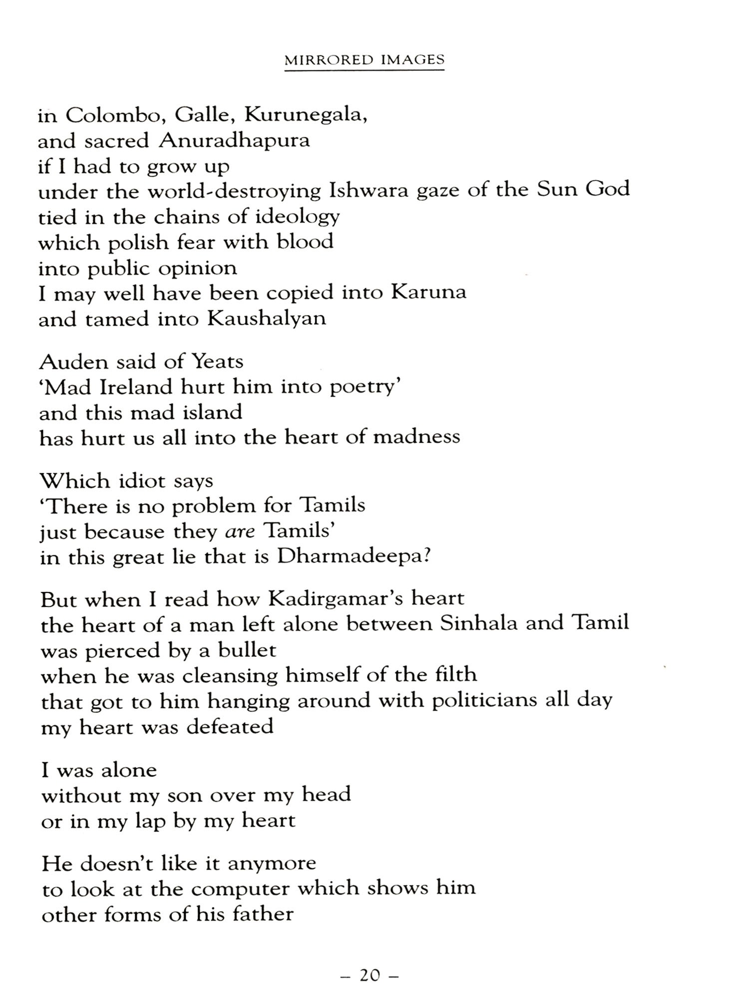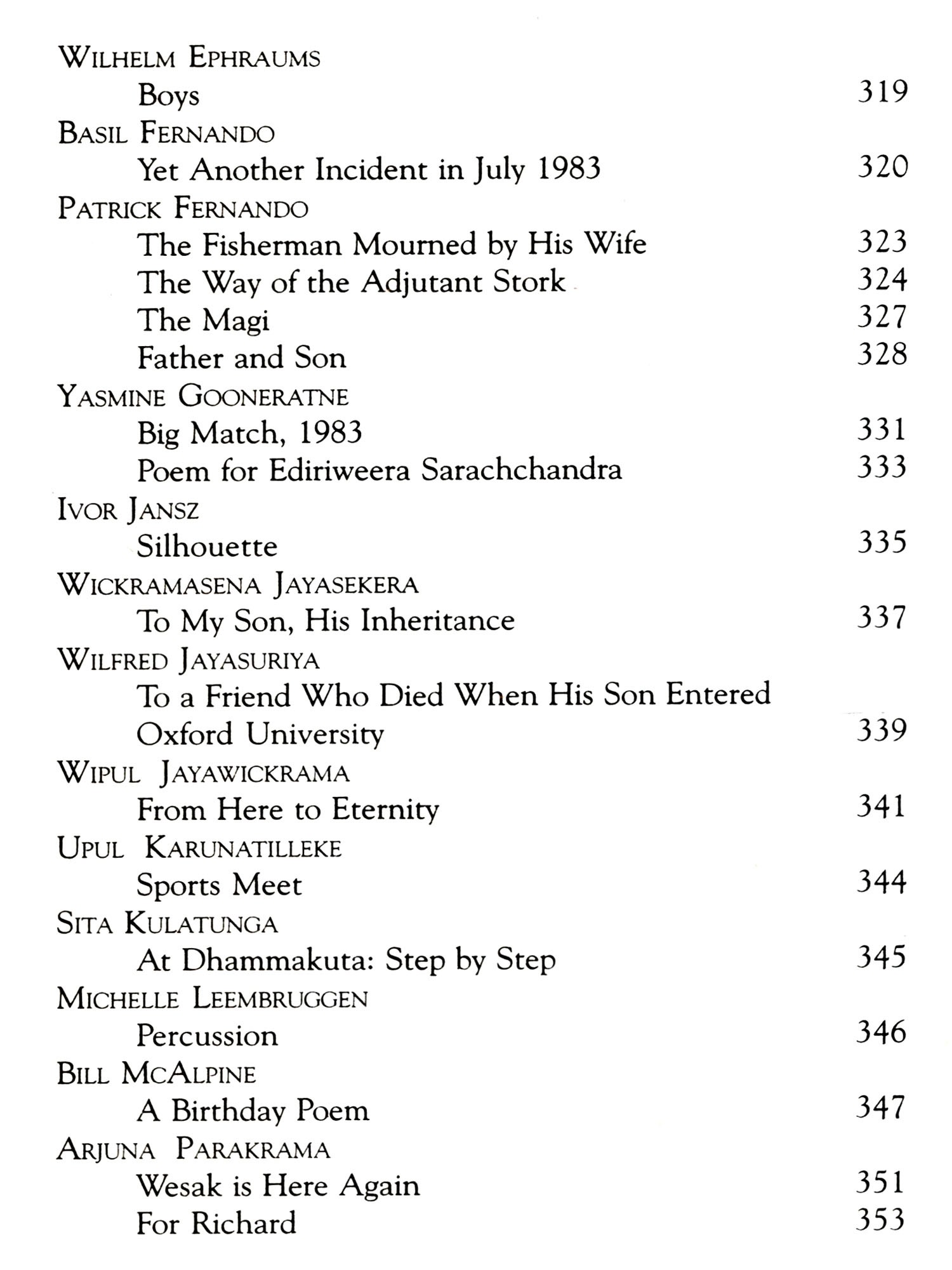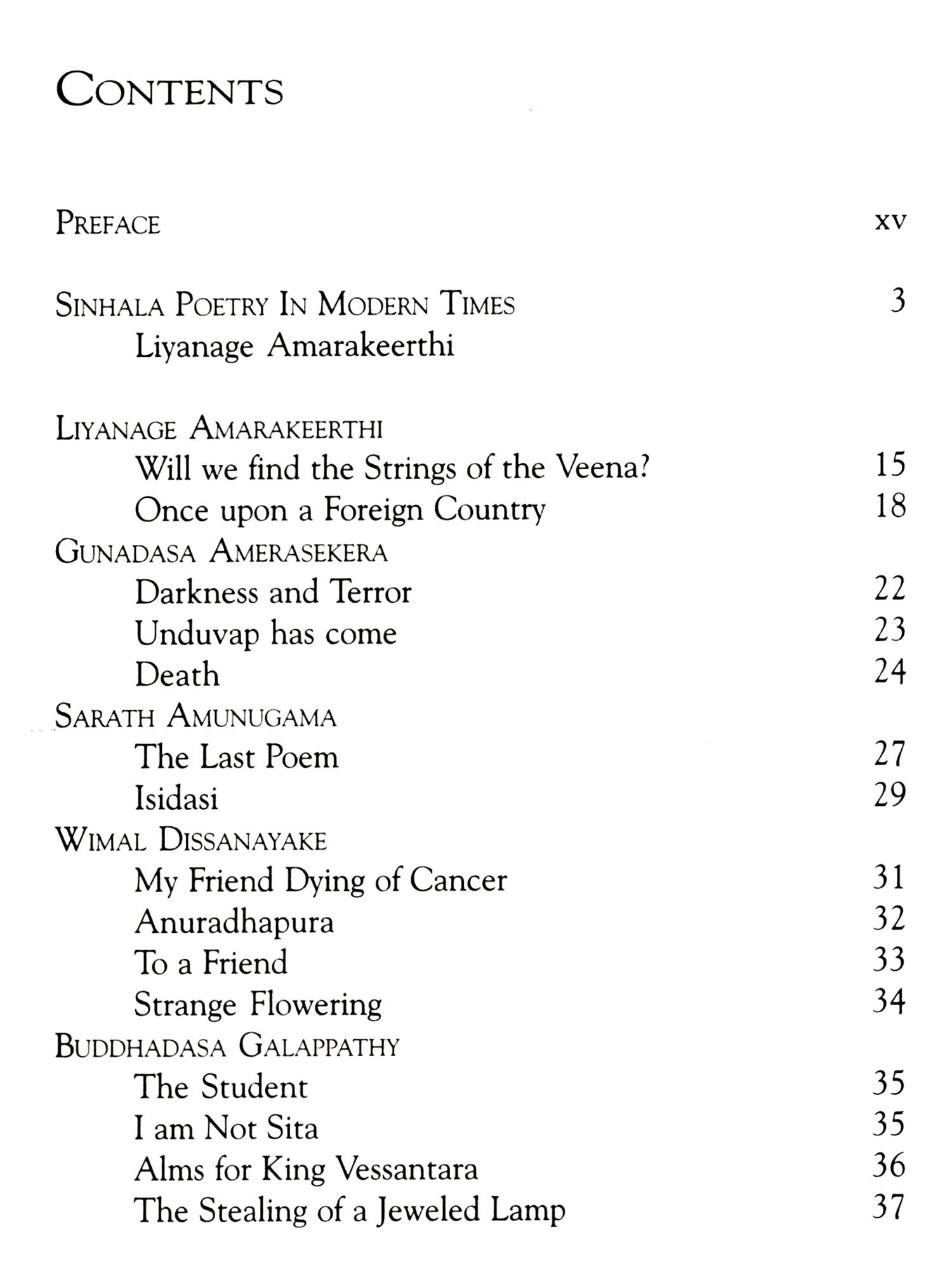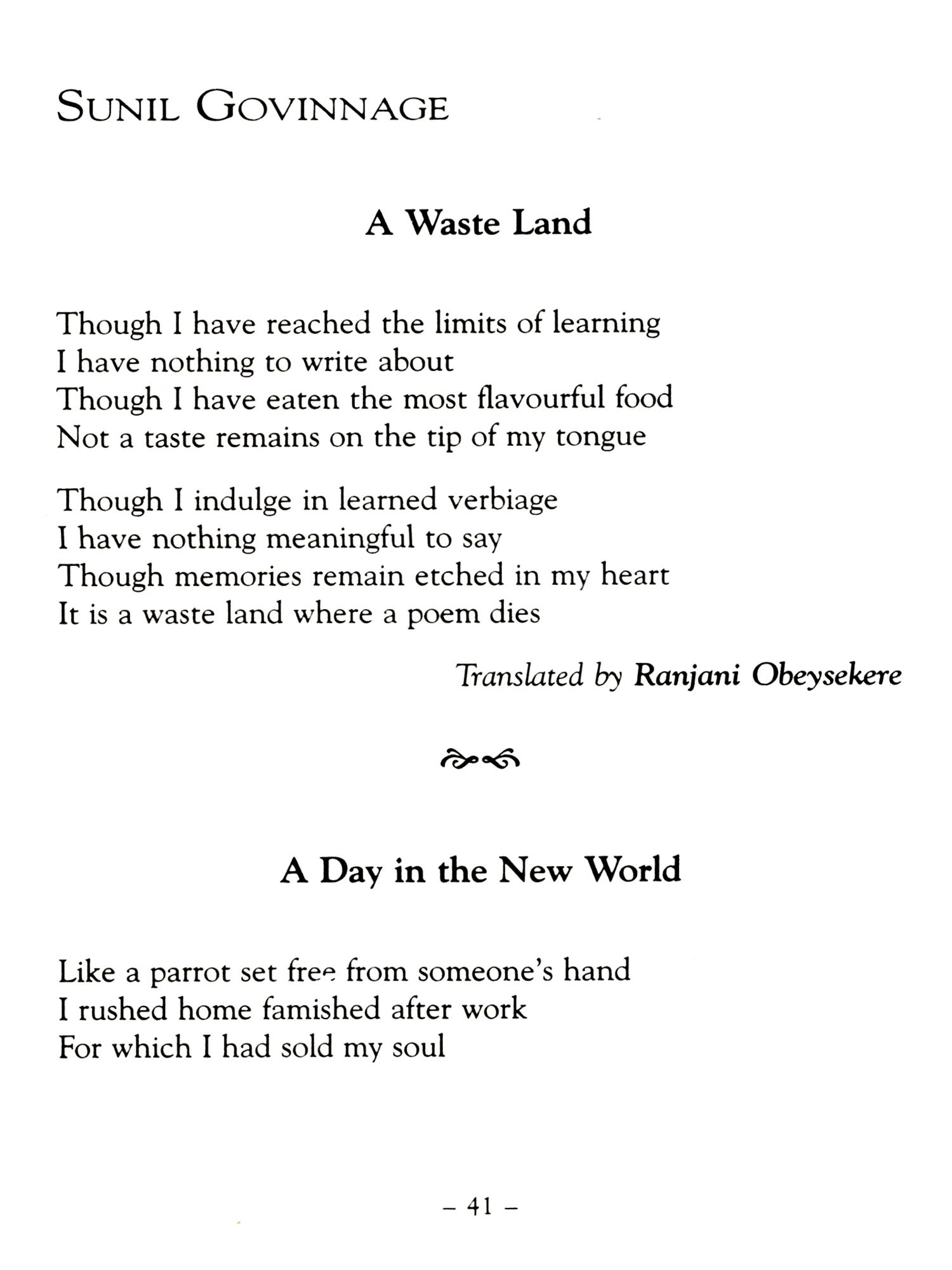 I am indebted too to all the others who provided translations, some specially commissioned for this book, in particular my colleagues at Sabaragamuwa University, Manoj Ariyaratne and Mahinda Pathirana. I should also mention the doyenne of translators, Ranjini Obeysekere, who responded promptly to my requests in the midst of other preoccupations whilst abroad. Needless to say, I am grateful too to all the poets, and the other translators, who so graciously gave me permission to use their work. Mr Godage of Godage Publishers and my old friend A T Dharmapriya require special mention, not least because the collection the latter produced for the former will provide a more comprehensive introduction to the field than this necessarily limited collection.