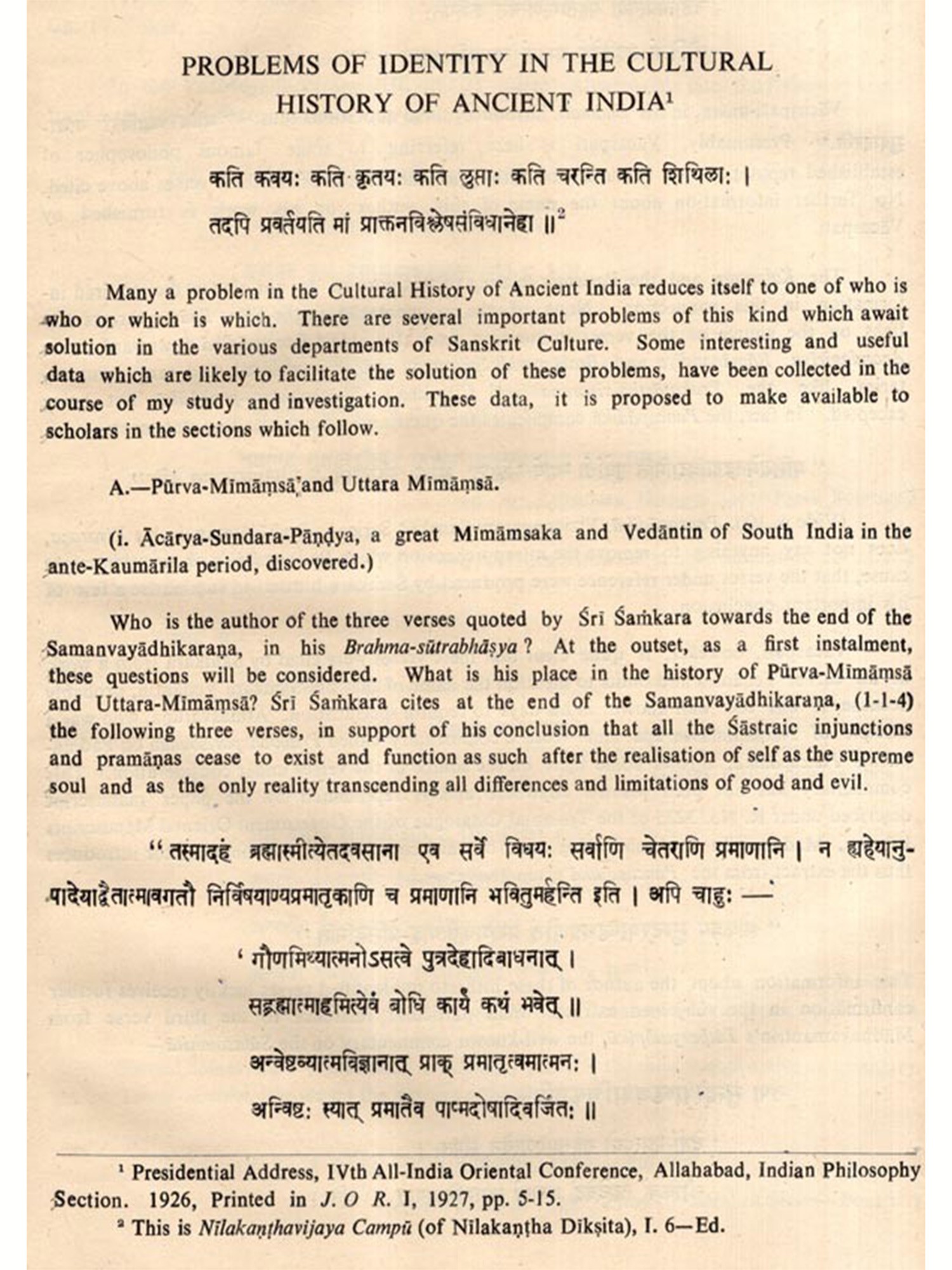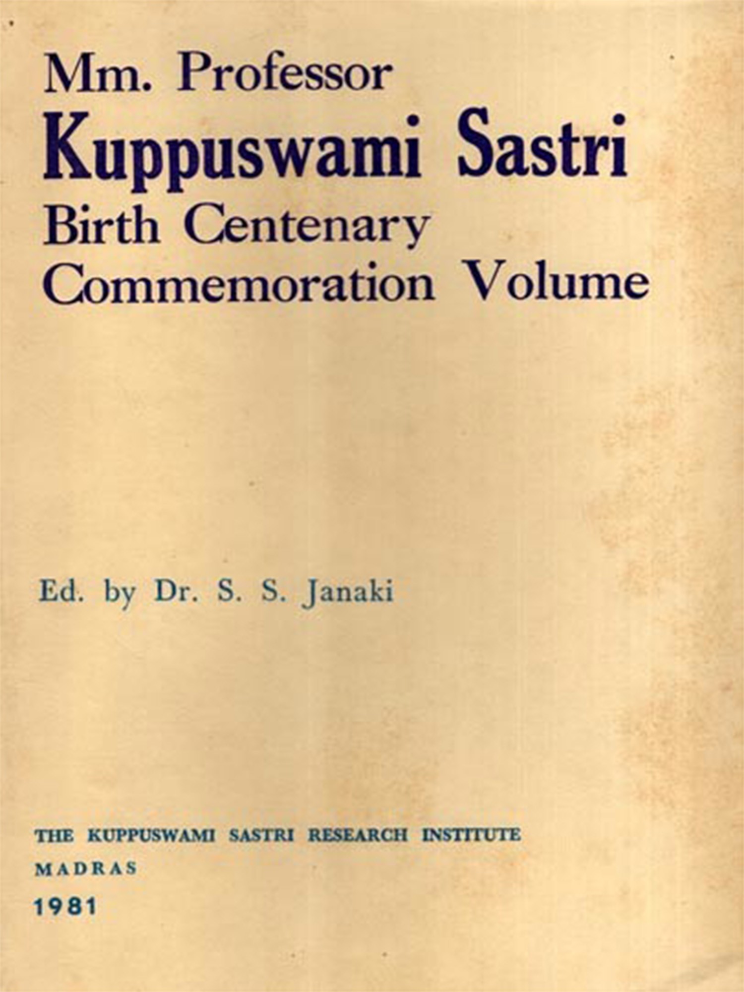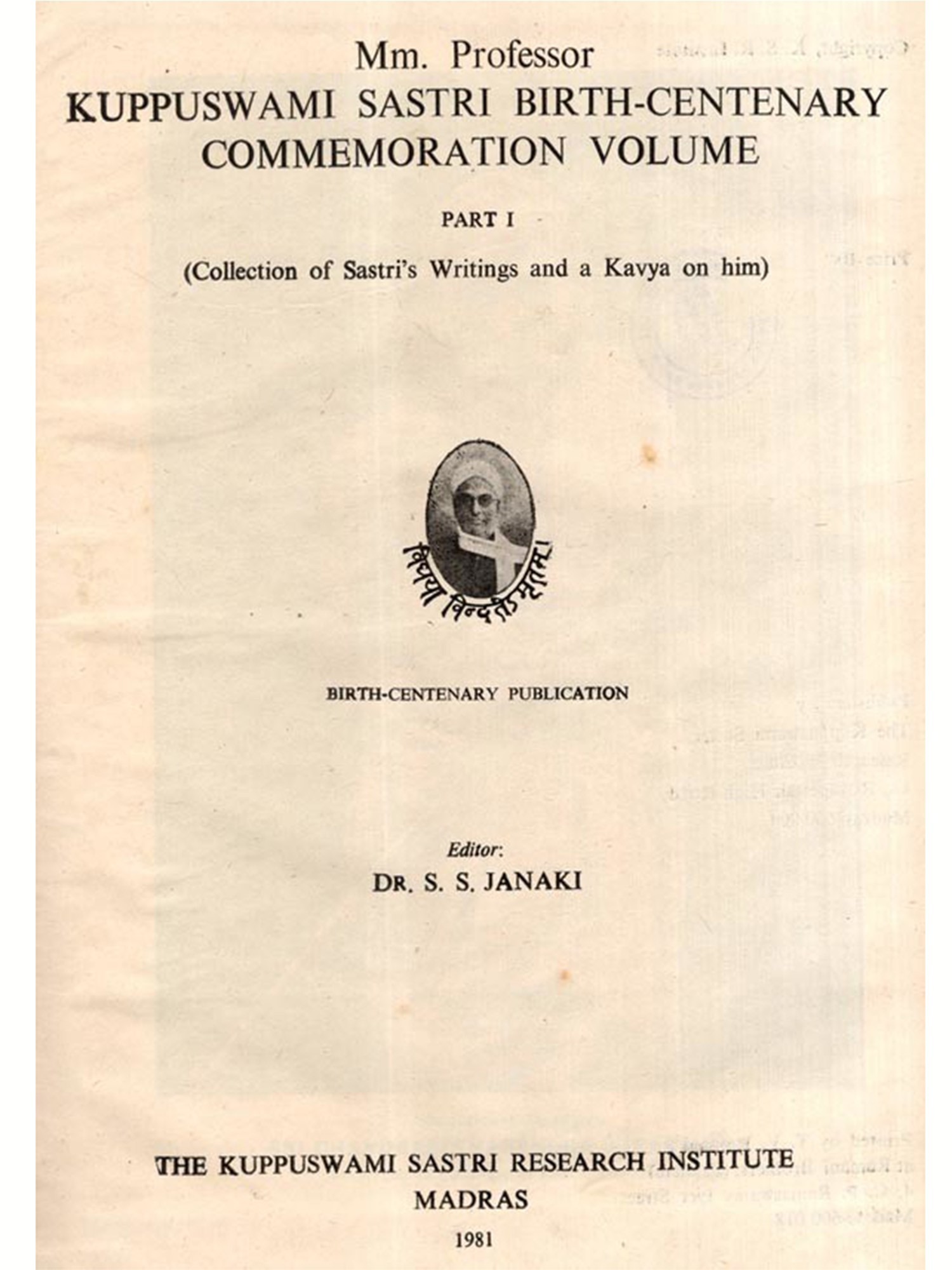 This volume is but the first part issued by the Kuppuswami Sastri Research Institute in connection with the Birth-Centenary of Sastriar on the 19th, 20th and 21st of June. The second part will follow in due course, as indicated by Dr. Janaki in her fine Preface.