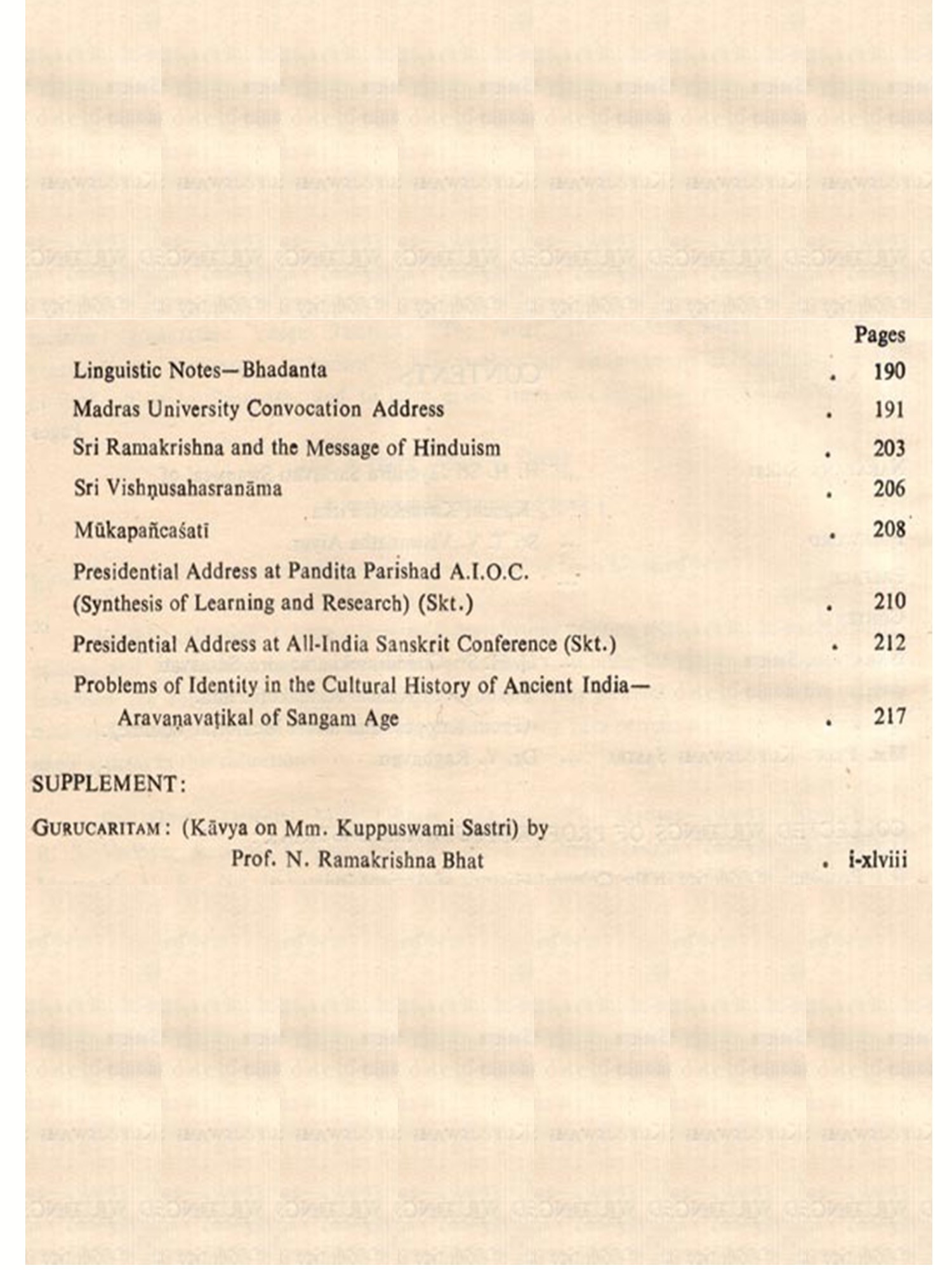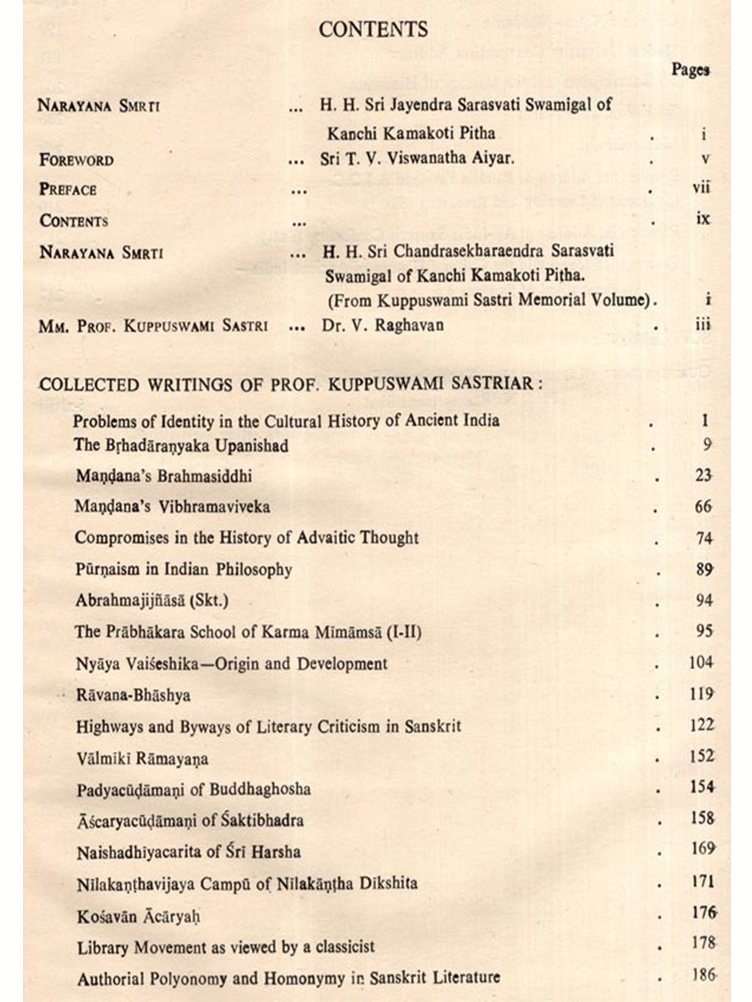 I started collecting the scattered writings on the basis of Prof. Raghavan's bibliographical account about his guru, Prof. Sastri. I am glad now that by the grace of the Almighty, it has been possible for me to get all of them after a long search and even two more gems, not listed therein, namely his foreword to Vishnusahasranama and Mukapancasati.