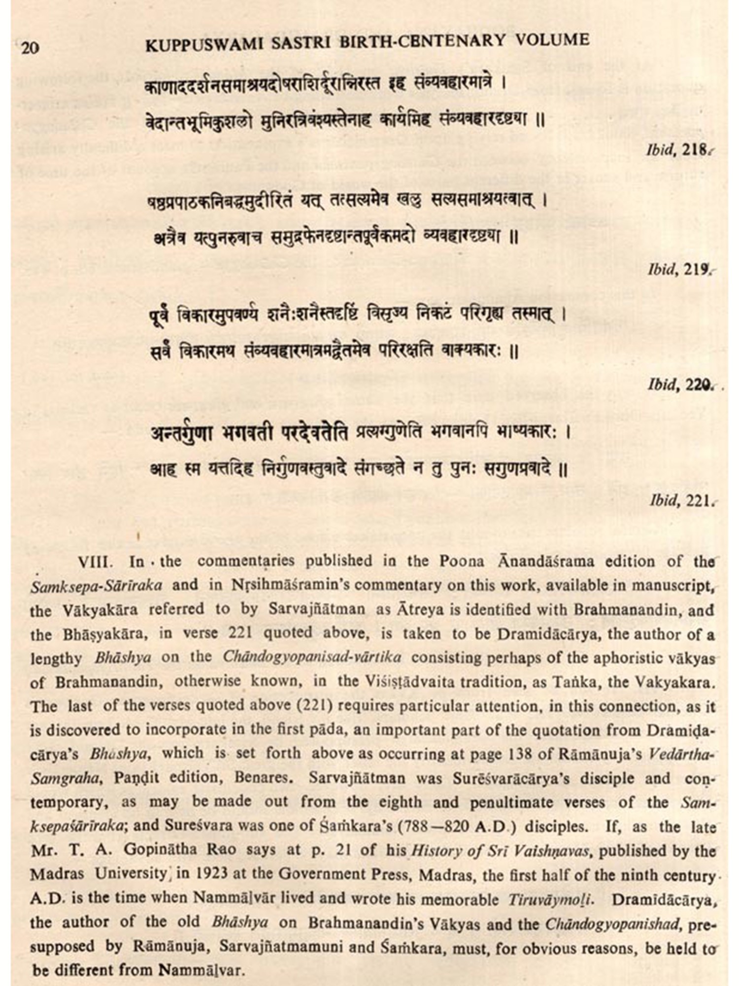 I am now delighted that it has been possible for the Kuppuswami Sastri Research Institute to bring out the valuable writings of Sastriar collected in a single volume, along with a kavya on him by a devoted disciple of his. The collection, I am sure, will be of great value to Sanskrit students and researchers. It is indeed a fitting homage to that great savant.