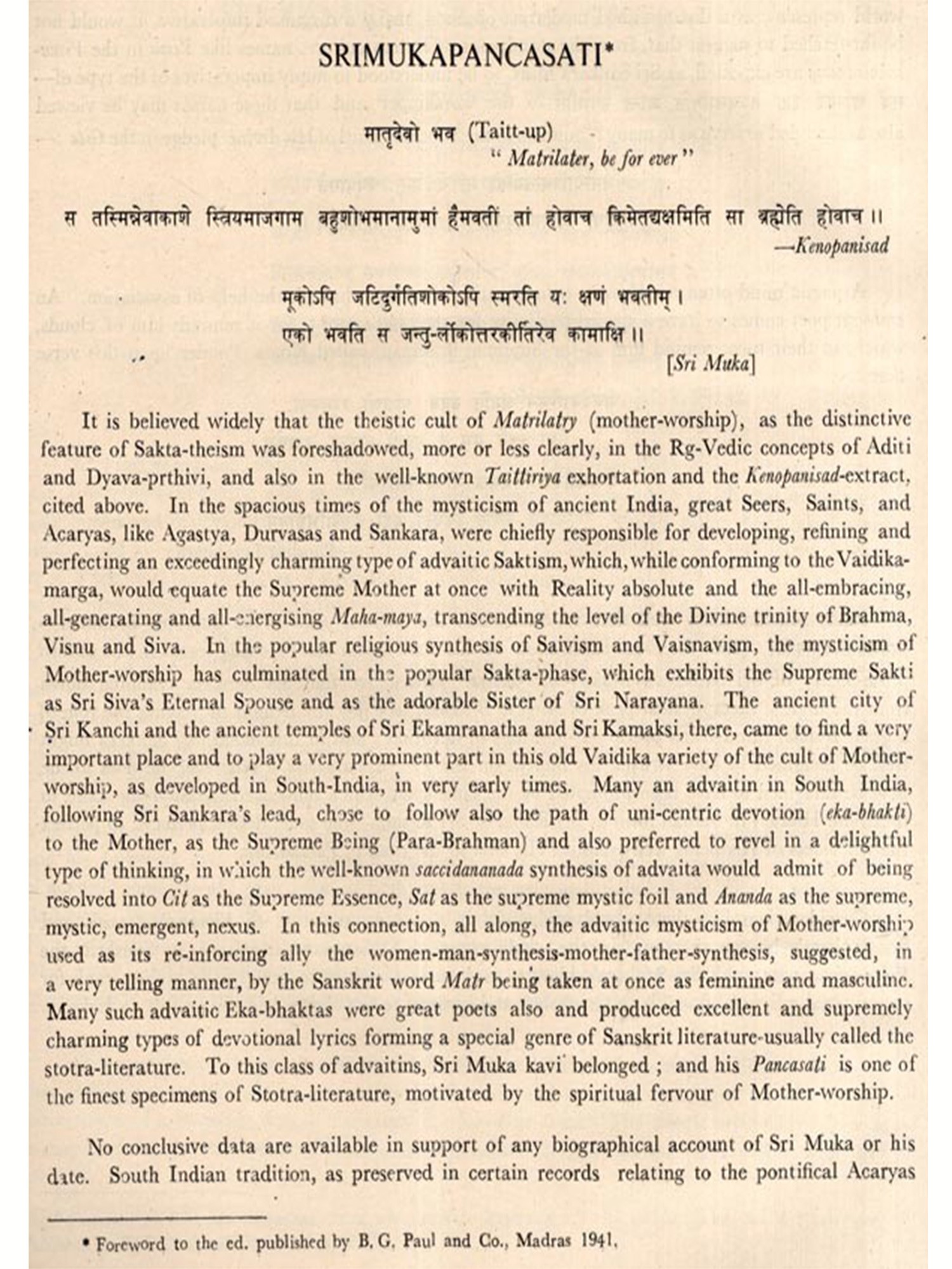 Mahamahopadhyaya Professor S. Kupposwami Sastri was a giant among Sanskritists of the present century, who gave a new life to Sanskrit Studies, moulded, nurtured and directed them for over thirty-five years. He was himself a great scholar of massive intellect and a worker of uncompromising integrity. With a solid foundation in Vyakarana, he mastered the two Mimamsas, Nyaya and Sahitya. Side by side with his education on traditional lines, he studied the present-day subjects, including Western Philosophy through the medium of English. The result was that he was steeped in Indian scholarly traditions and had also absorbed the best features of the modern, critical, comparative and historical methods. Besides all this, the uniqueness of Prof. Sastriar is that he performed everything most conscientiously and with utmost dedication.