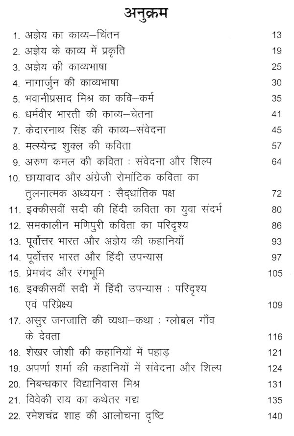 हिंदी साहित्य में पूर्वोत्तर भारत की उपस्थिति लगभग नगण्य रही है और प्रायः यह हाशिये पर रहा है। पुस्तक में पूर्वोत्तर भारतीय साहित्य से संबंधित अनेक लेख भी संकलित हैं। इक्कीसवीं सदी की हिंदी रचनाशीलता से संबंधित लेखों की भी पुस्तक में उपस्थिति है। कविता, उपन्यास, कहानी और आलोचना संबंधी लेखों को पुस्तक में संकलित कर समग्रता प्रदान करने का विनम्र प्रयास मैंने किया है।