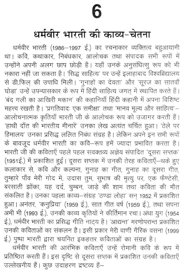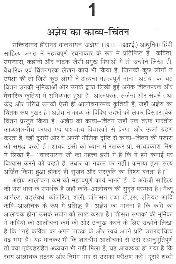 आधुनिक हिंदी कविता के क्षेत्र में अज्ञेय के संपादन में सप्तकों का प्रकाशन ऐतिहासिक महत्त्व की बात है। प्रयोगवाद के पुरस्कर्ता के रूप में अज्ञेय प्रसिद्ध हैं। पुस्तक में संकलित अज्ञेय संबंधी अनेक निबंध उनके अलक्षित पक्षों पर प्रकाश डालते हैं। भवानीप्रसाद मिश्र, धर्मवीर भारती, केदारनाथ सिंह, अरुण कमल, मत्स्येन्द्र शुक्ल की कविताओं की परख संबंधी आलेख पुस्तक में संकलित हैं।