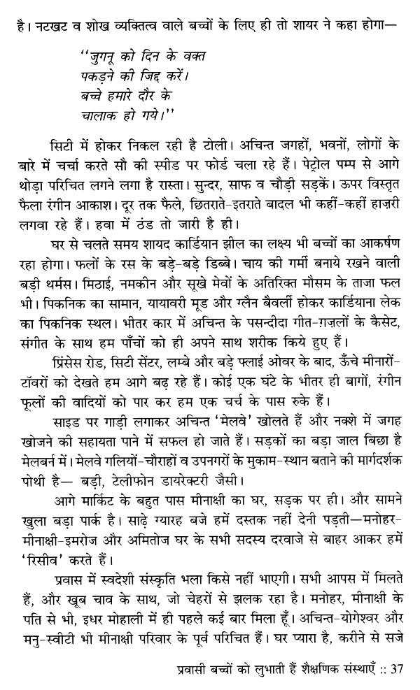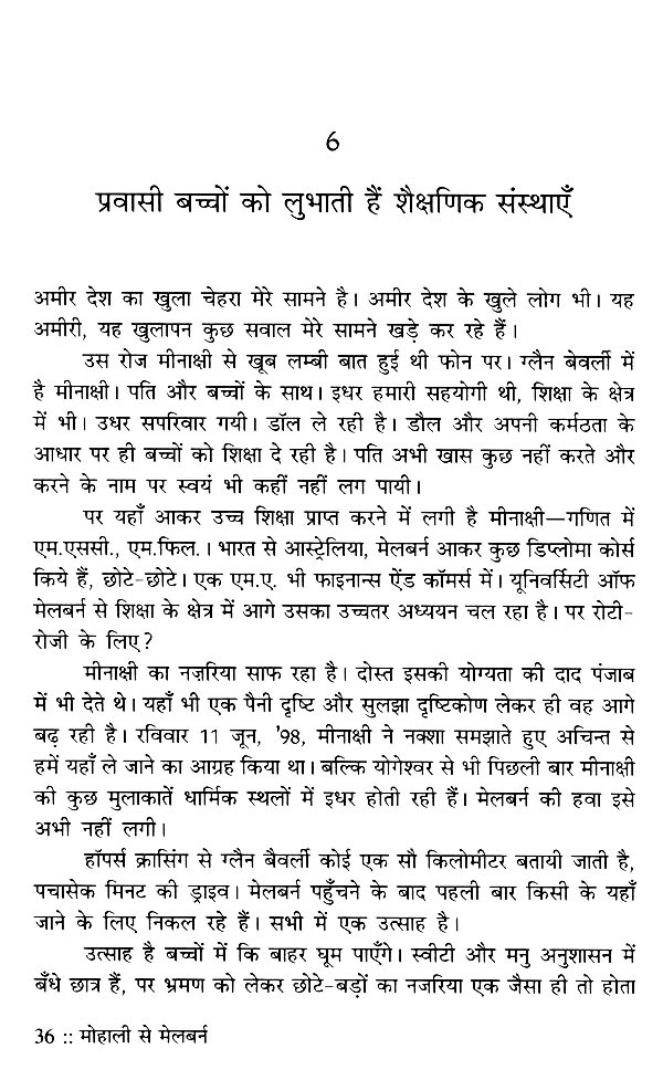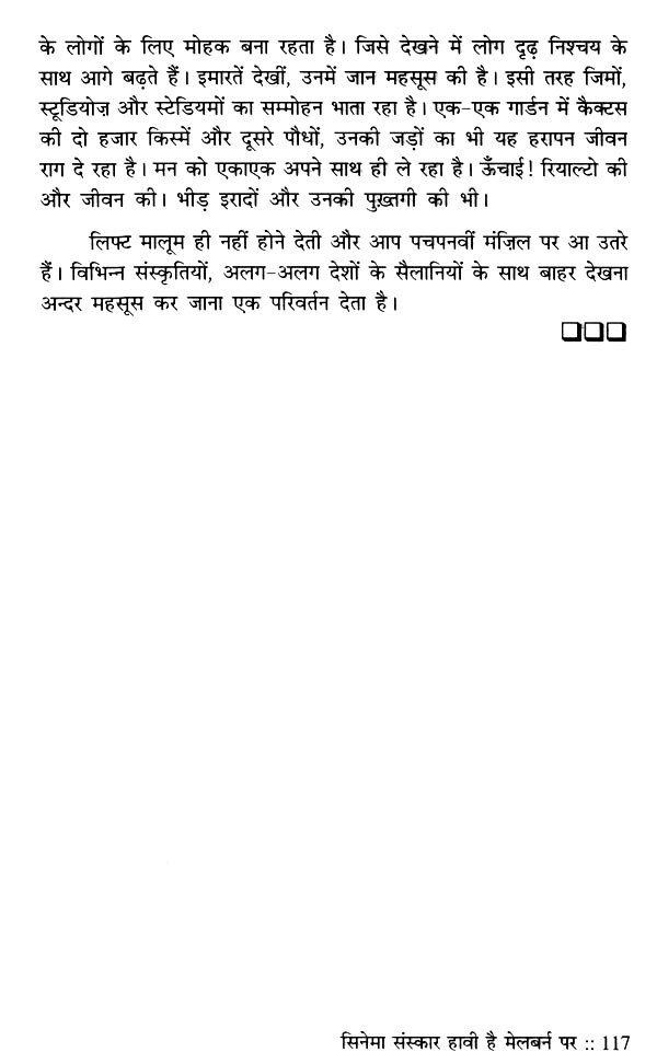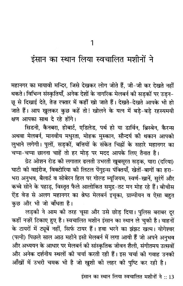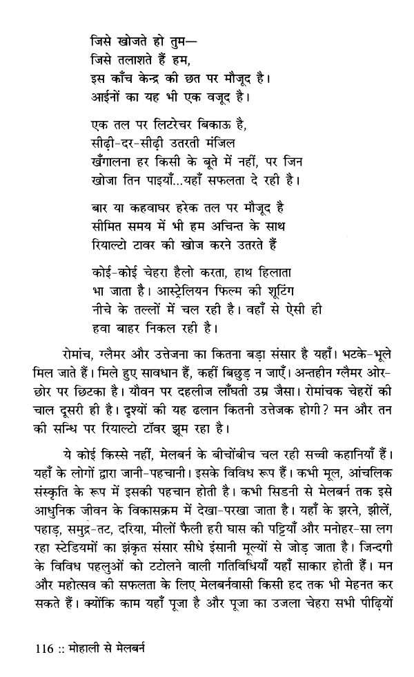 जीवन के चित्र को विविध रंगों से भरने के लिए उतने ही अनुभवों से गुजरने की जरूरत होती है। वे अनुभव व्यक्ति-व्यक्ति से मिलते हैं, देश-विदेश की यात्राओं से मिलते हैं। दृश्य पर पकड़ जितनी गहरी होती है, रंगों की विविधता उस चित्र को उतनी ही खूबसूरती प्रदान करती है। प्रो. मानव की नजर में वह पकड़ है, इसलिए उनके लेखन में साधारण-सी घटना भी असाधारण बन जाती है। मोहाली से मेलबर्न का यात्रा-वृत्तान्त इसका साक्षी है। एक उदाहरण देखिए- "थकान कुछ कम हुई है। पर संघर्ष कहीं अन्दर है। रिश्तों के रहस्य समझने की कोशिश में हूँ। अपनत्व-सा सबकुछ है, पर नहीं भी है कहीं। जहाँ नहीं है, उसी के लिए चिन्तित हूँ। व्यथा की डोर गहराती क्यों जा रही है? सोते-सोते बारह बजने को हैं। सर्दी की काटती रात के बारह। कपड़े हैं, कला है और मन! मन मेलबर्न की रोशनी-सा फैल रहा है।" इस तरह छोटी-छोटी घटनाओं के ताने-बाने ने यात्रा-वृत्तान्त को रोचक, प्रेरक और रिश्तों की सोच को पारदर्शी बना दिया है, जिसमें सुख भी है तो चुभन भी है। सुगन्ध भी है तो बदबू भी है। और इन प्रिय-अप्रिय प्रसंगों/अनुभवों में से गुजरकर ही तो हम जीवन-यात्रा को एक निश्चित अर्थ दे पाते हैं। प्रो. मानव की लेखनी में उसी सार्थकता के दर्शन आपको हर पृष्ठ पर मिलेंगे। लगेगा जैसे आप उनके साथ यात्रा पर हैं, यात्रा का आनन्द ले रहे हैं। उनकी कलम की यही खूबी है। यात्रा करें, आप यात्रा के बीच गुजरनेवाले हर लम्हे को पूरी समग्रता से जिएँ, यही इसकी प्रेरणा है।।