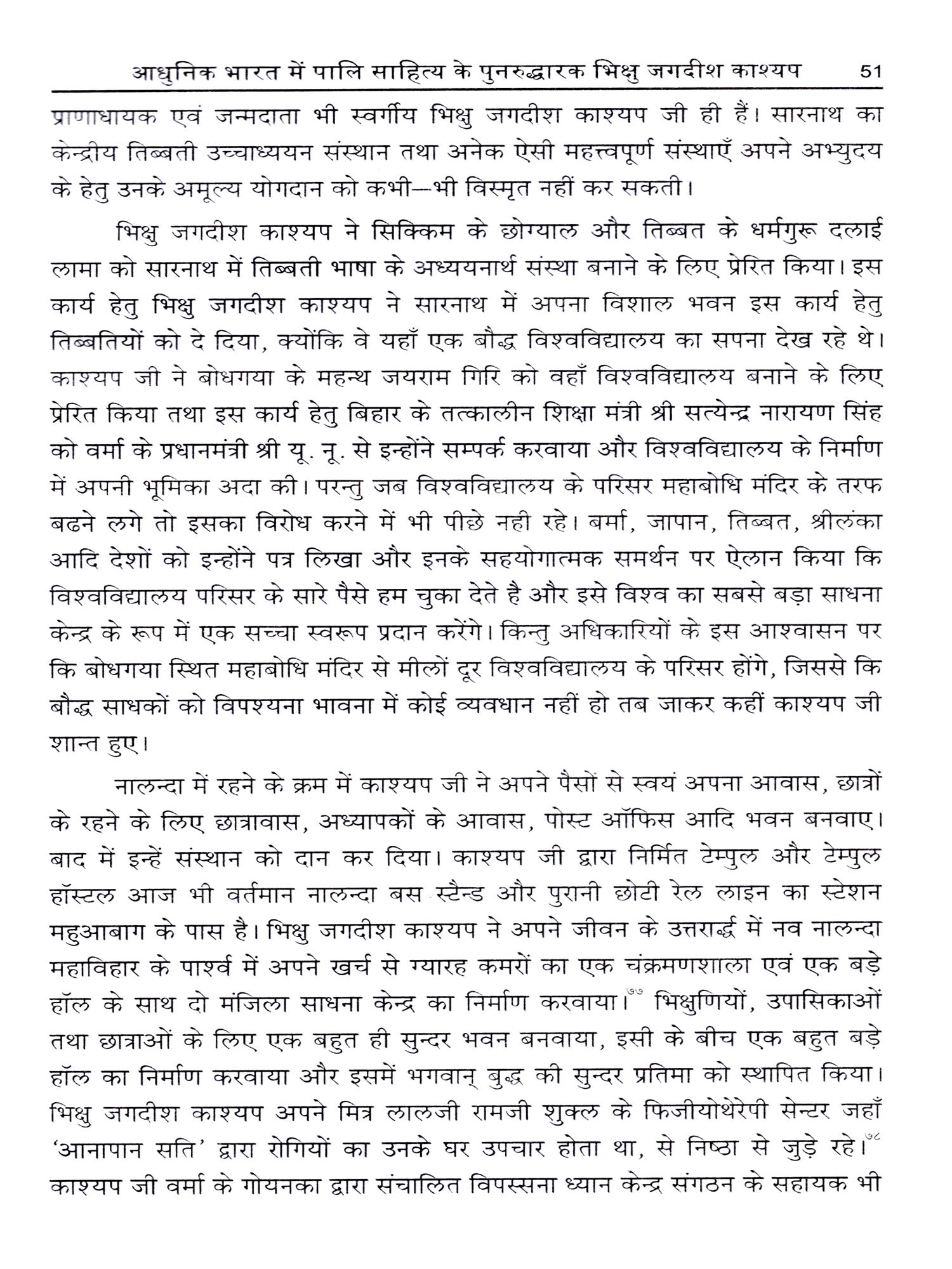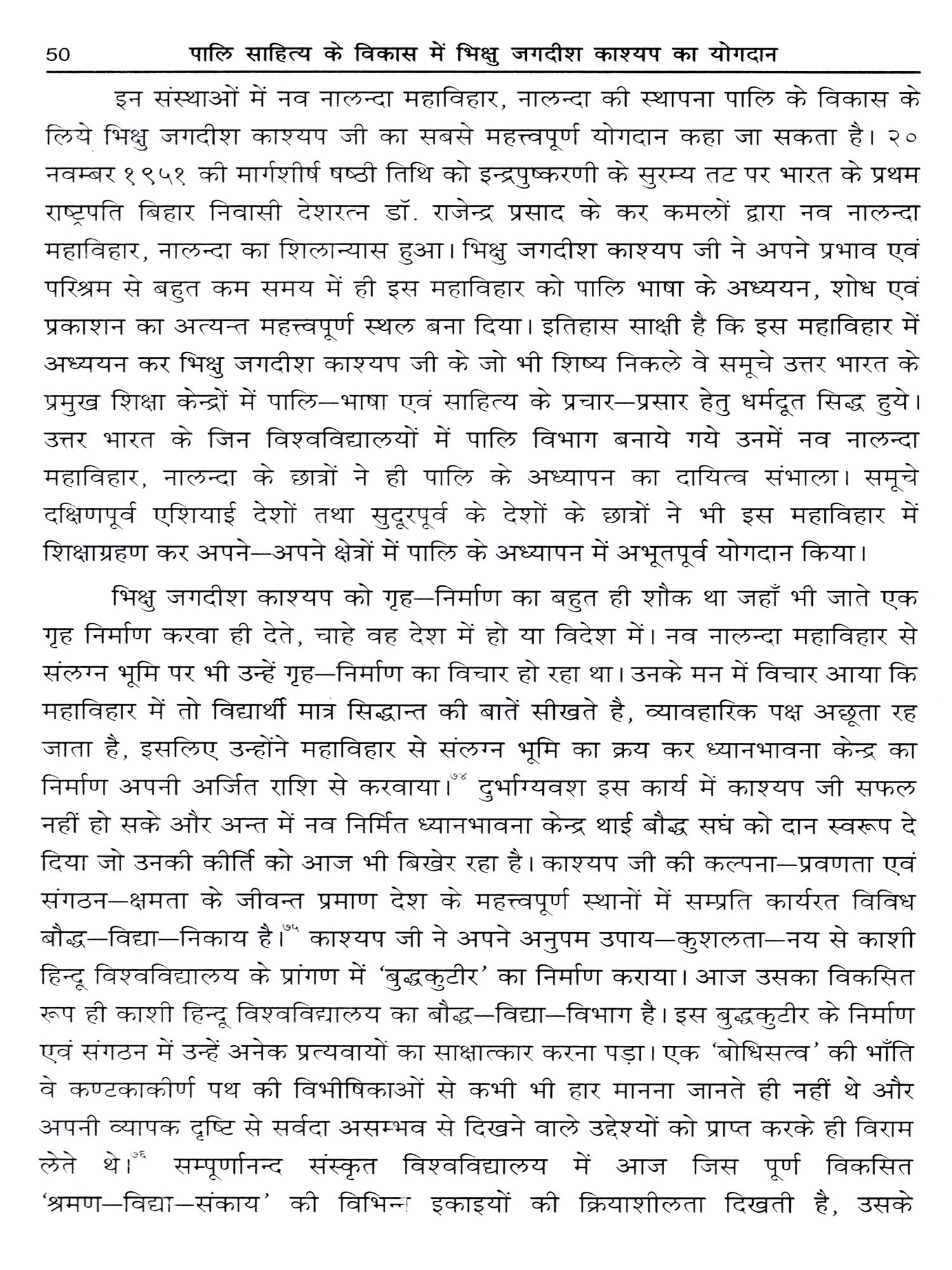 भारतवर्ष के बिहार राज्य की नालन्दा की भूमि पुराने समय से ही अपने बुद्धिरुपी प्रदीपों से अंधेरे को नष्ट करने वाले ज्ञानी लोगों तथा संसार के अंधेरे को नष्ट करने में महान् प्रदीपों जैसे महाविहारों की जन्म भूमि रही है, इसमें कोई भी संदेह नहीं है। जिस प्रकार पुराने समय में इसी भूमि में भगवान् बुद्ध के मुख्य शिष्य सारिपुत्त और मोग्गलान तथा बुद्ध वचनों के चिरकाल तक बने रहने में मुख्य प्रयोजक महाथेर महरकाश्यप ने जन्म लिया और कठोर प्रयास द्वारा समस्त लोक में धर्म और ज्ञान के उजेले को बिखेरा ठीक इसी प्रकार अनेक सदियों तक अपने मूल उत्पत्ति के स्थान जम्बुद्वीप में लुप्त हो चुके मागधी में संग्रह किए गए बुद्ध वचनों के पुर्नजीवन के लिए इसी मगध भूमि में एक कठोर प्रयास करने वाला तथा दृढ़ इच्छाशक्ति वाला ज्ञानी व्यक्ति प्रकट हुआ जो इस लोक में जगदीश काश्यप नाम से प्रसिद्ध हुआ और जिसने बुद्ध धर्म की लुप्त हो चुकी परम्परा के पुर्नजीवन के लिए प्रयास करे हुए इसी मगध भूमि में नव नालन्दा महाविहार की स्थापना की और सम्पूर्ण पालि-त्रिपिटक को देवनागरी लिपि में प्रकाशित करा कर बुद्ध के वचनों के व्यापक प्रसार का काम किया।