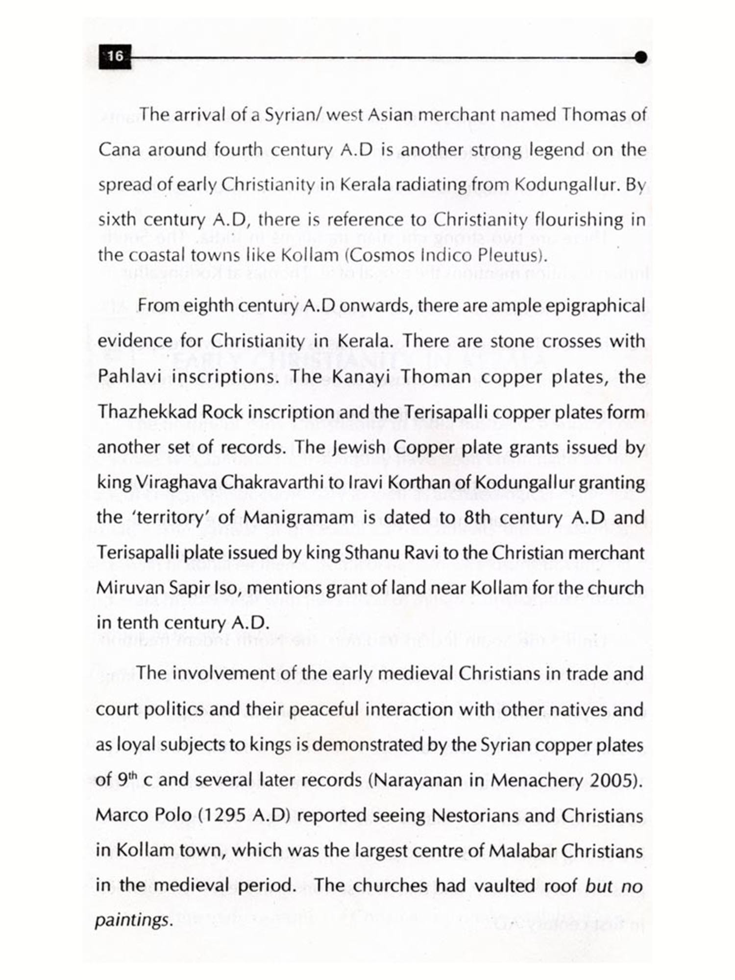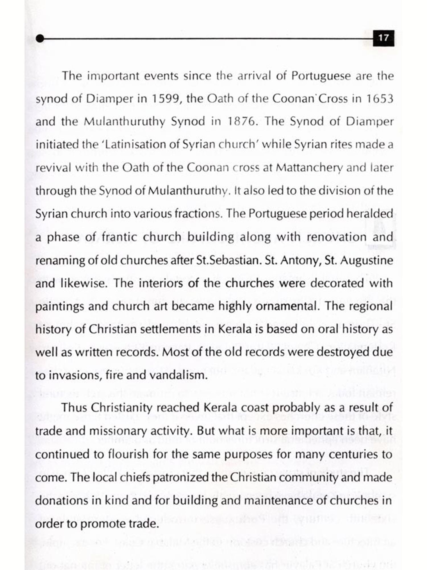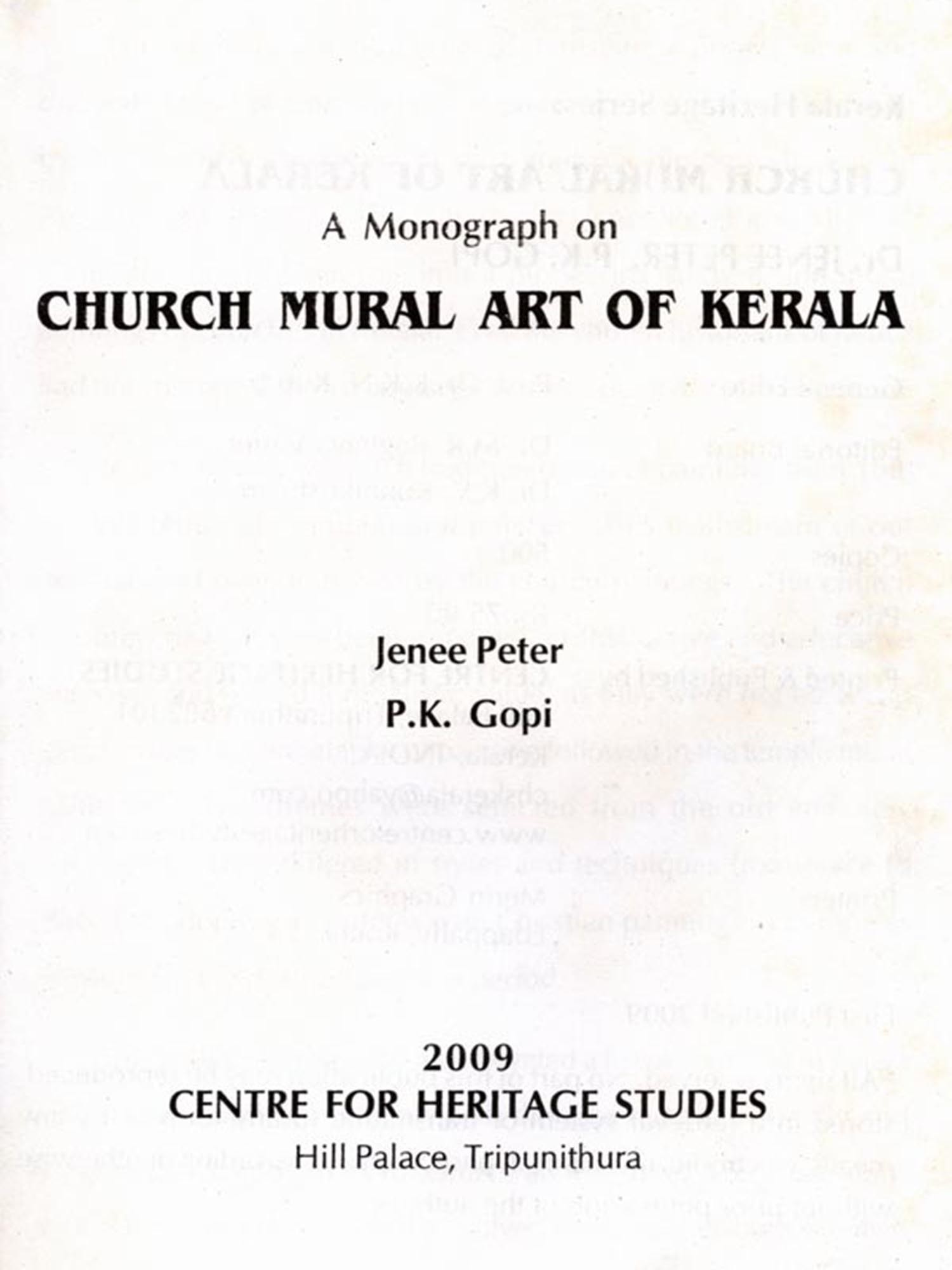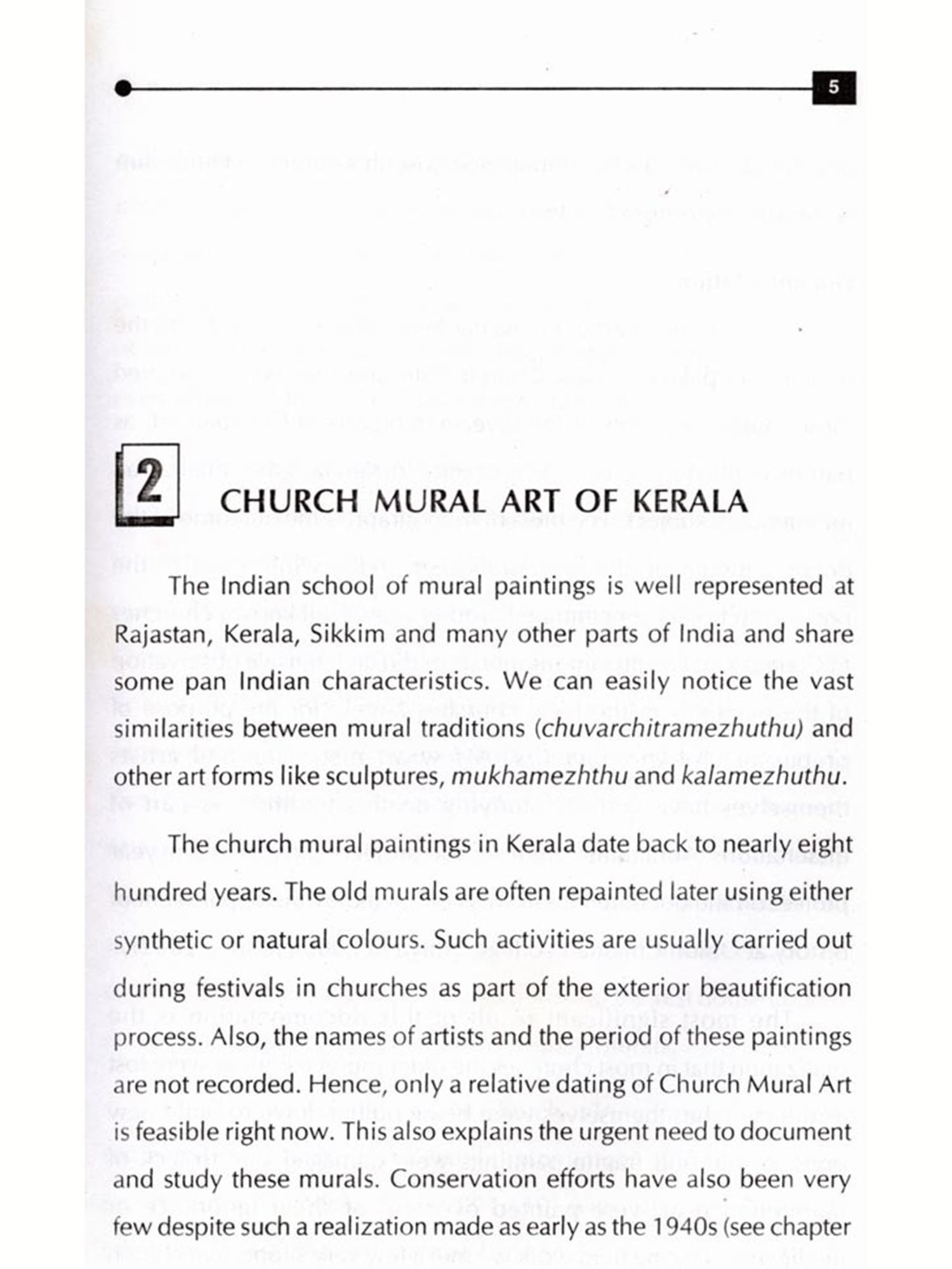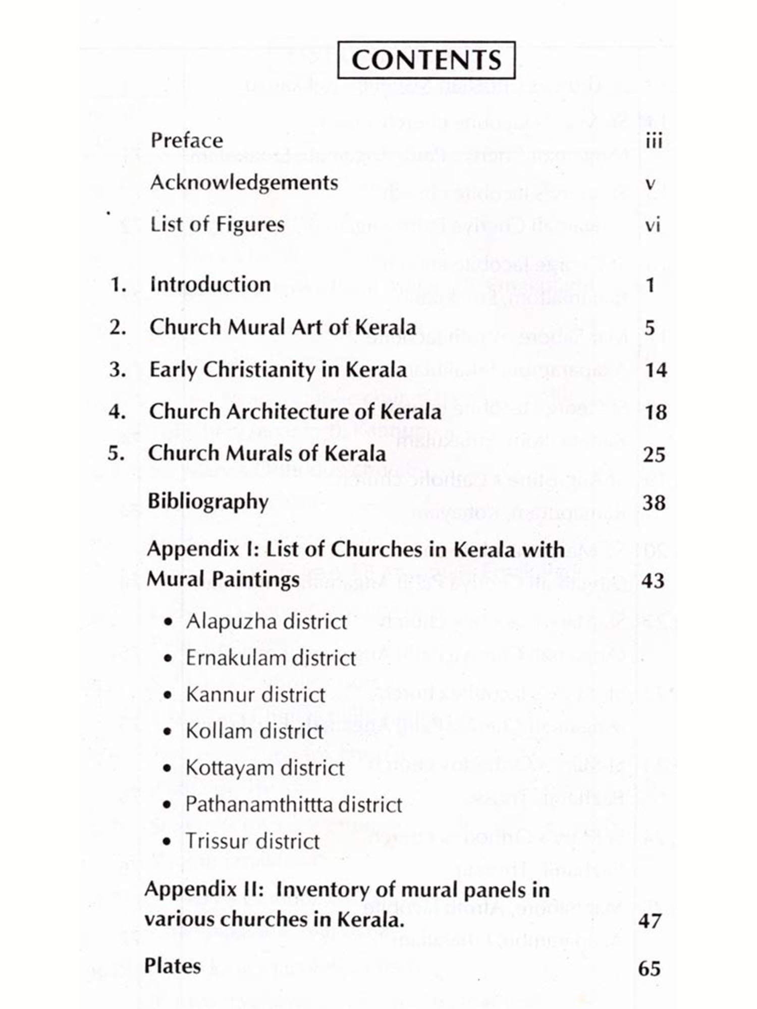 This publication has also incorporated a list of churches in Kerala with mural paintings. It deals with the advent of Christianity and the emergence and growth of church architecture. The indigenous style of these structures gradually evolved into a more elaborate foreign influence in all aspects of design and execution. Most of such grand structures remain as good example of Indo-Europe shared cultural heritage. Some of these developments are traced in this monograph with objectivity and brevity.
