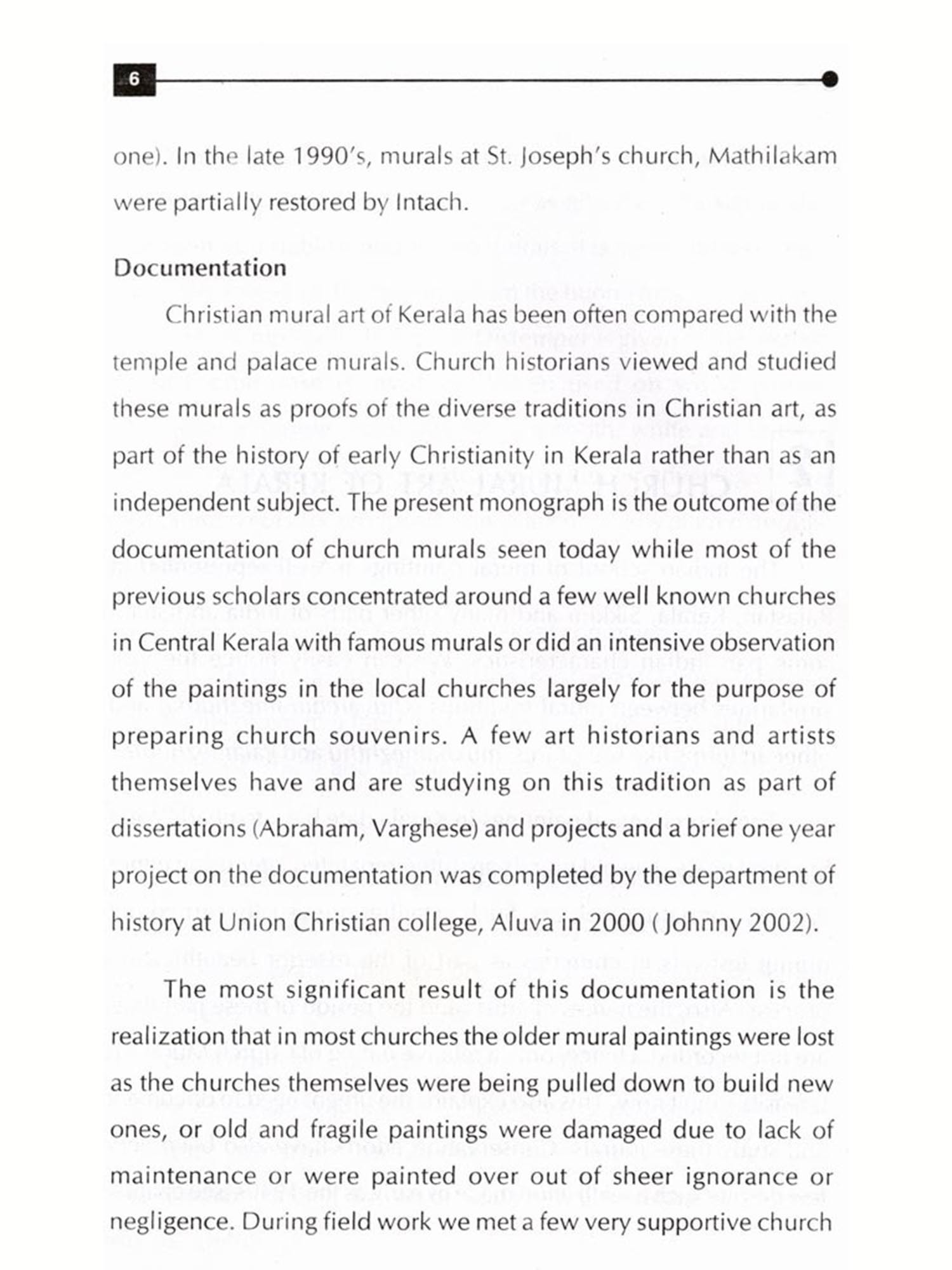 This study is an outcome of a research programme and documentation of Christian mural paintings of Kerala, undertaken by this centre by engaging its post graduate diploma students in Archaeology in 2004. The authors, Dr. Jenee Peter and Mr. P.K. Gopi later brought out this into a pioneering study of the mural paintings of churches in Kerala. Even the church historians of Kerala had not attempted such a course of academic activity in their pursuit.