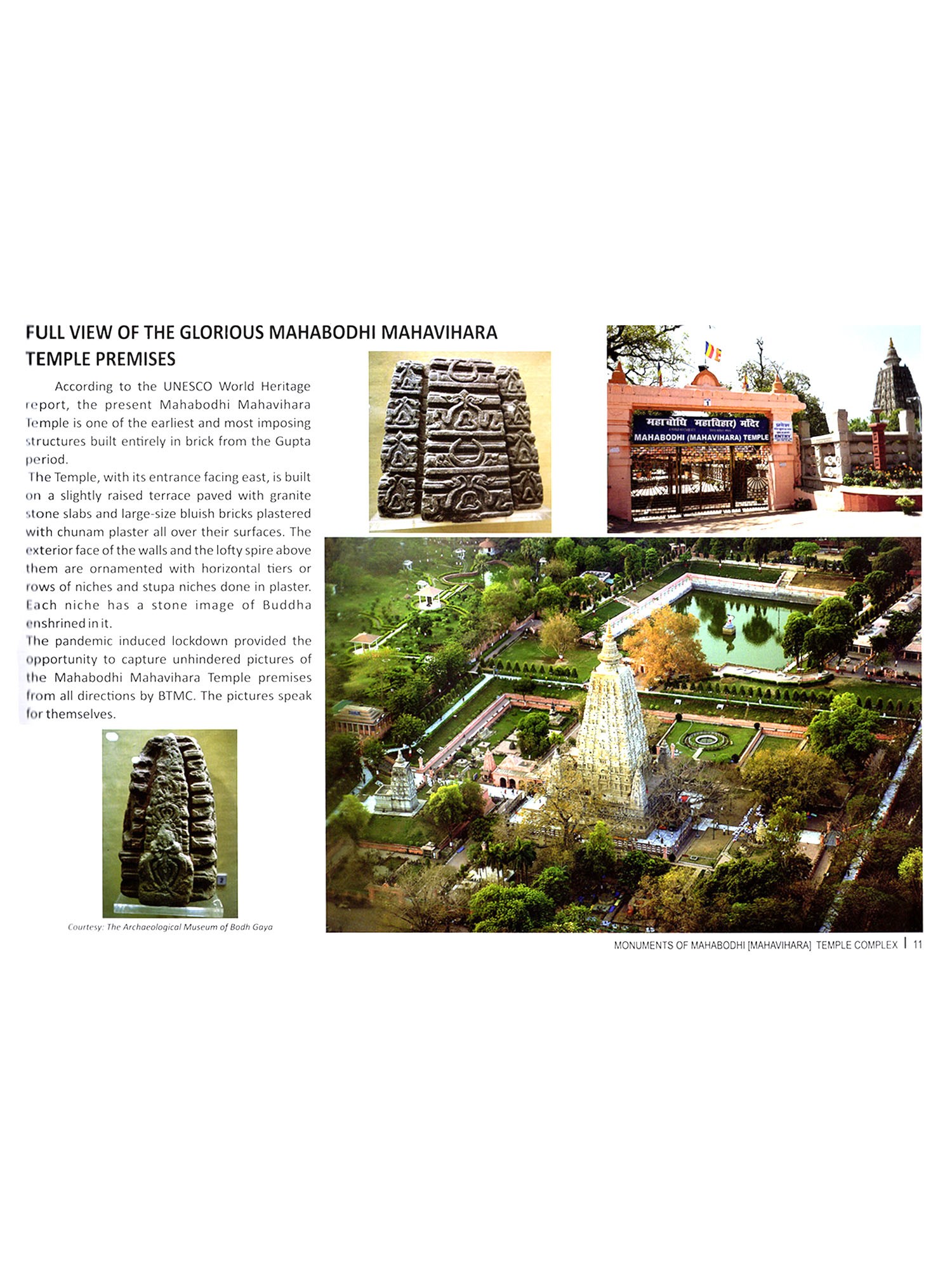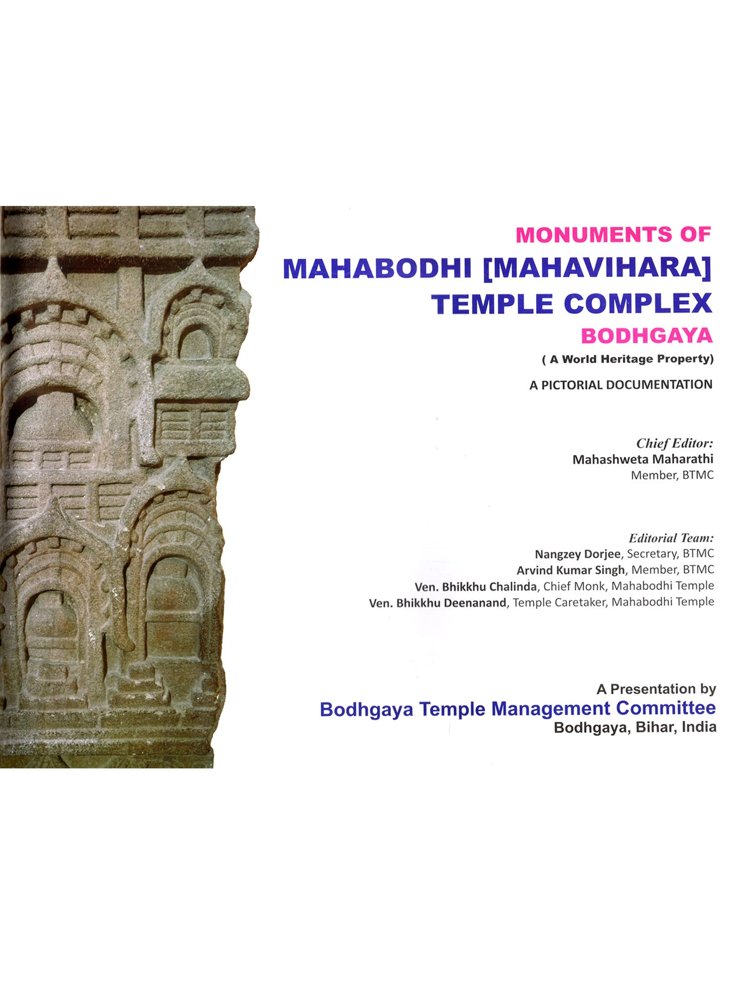 Through this book of the pictorial documentation of the monuments of Mahabodhi (Mahavihara) Temple, an endeavor has been made by BTMC to take this marvelous spectacle of artistic and spiritual splendor to a wider audience.
