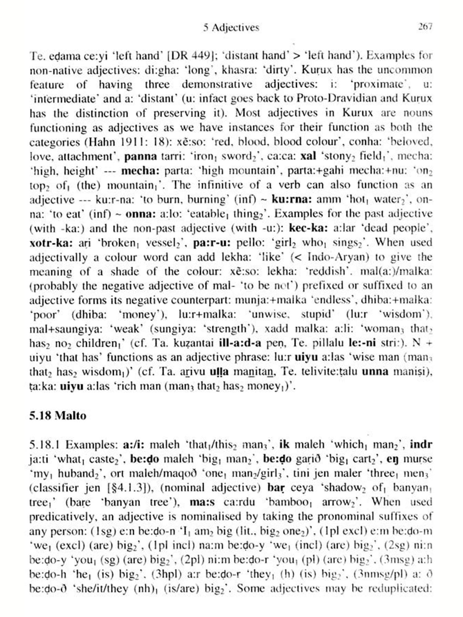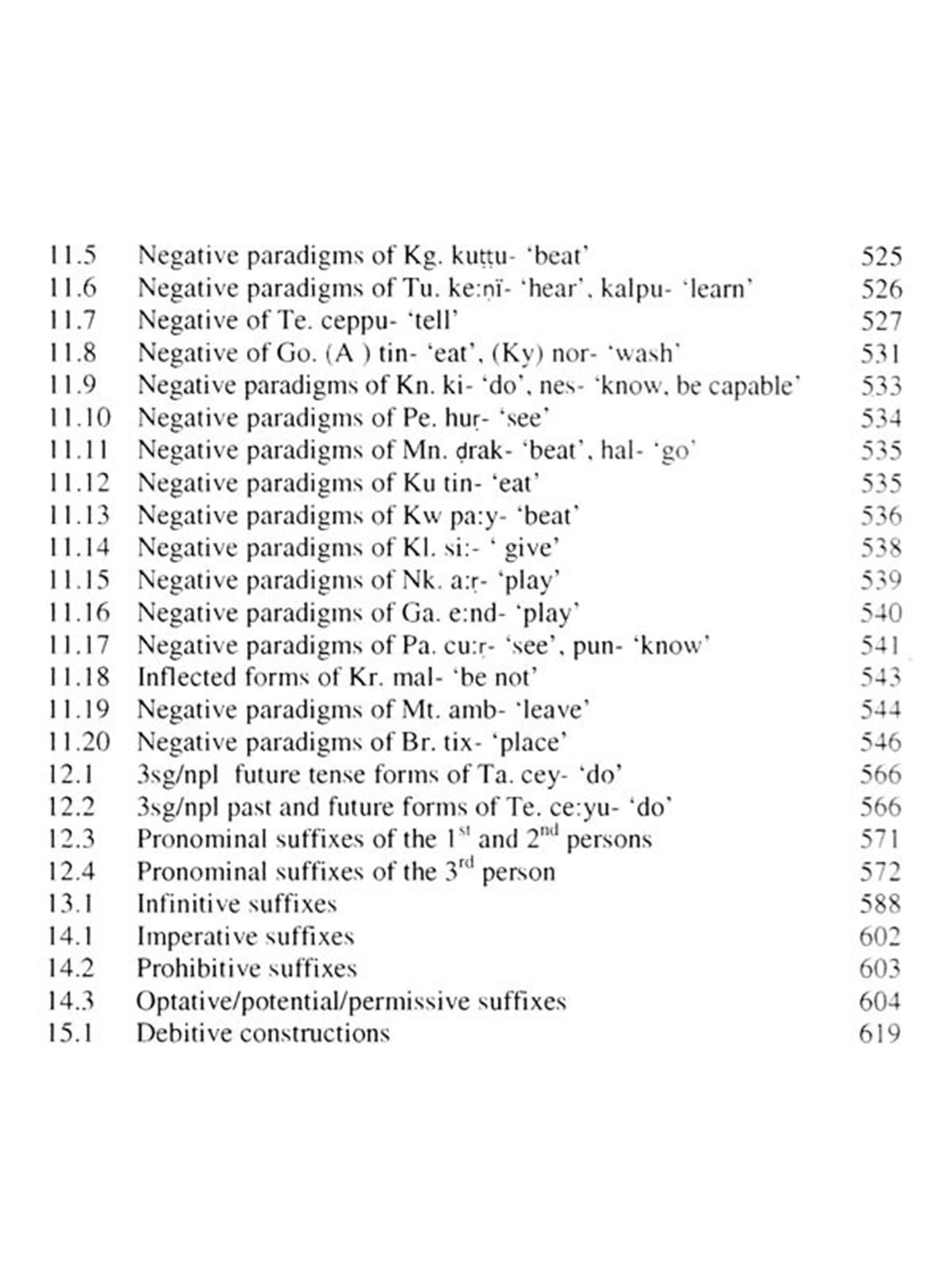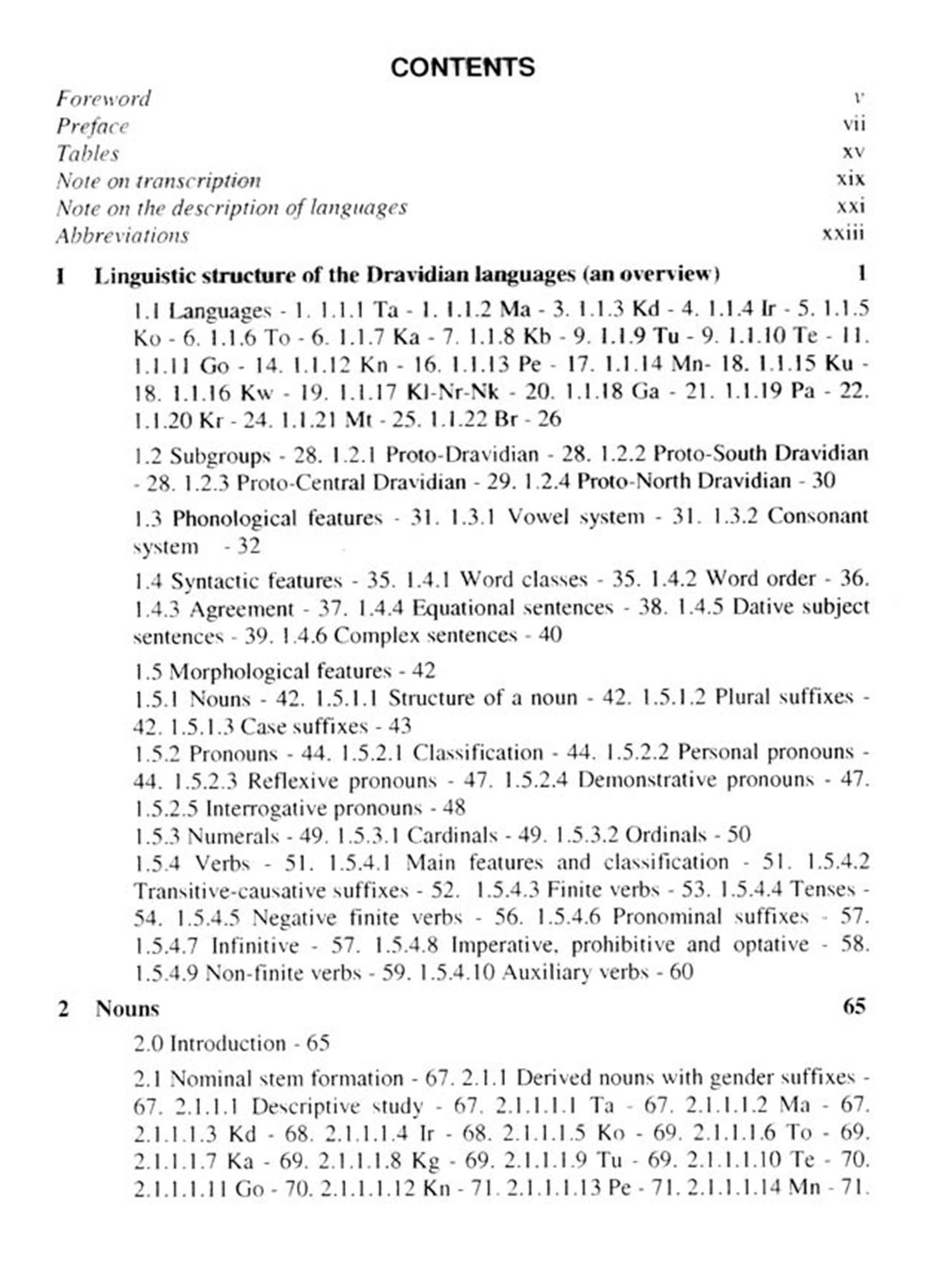 Chapter I starts with a brief introduction to the structure of Dravidian languages from a comparative point of view, covering important aspects of Phonology. Morphology and Syntax. Chapters 2 to 7 treat the Morphological and Syntactic aspects of the nominal system including pronouns, adjectives, adverbs and clitics. Chapters 8 to 15 cover the Morphosyntax of the Verb system.