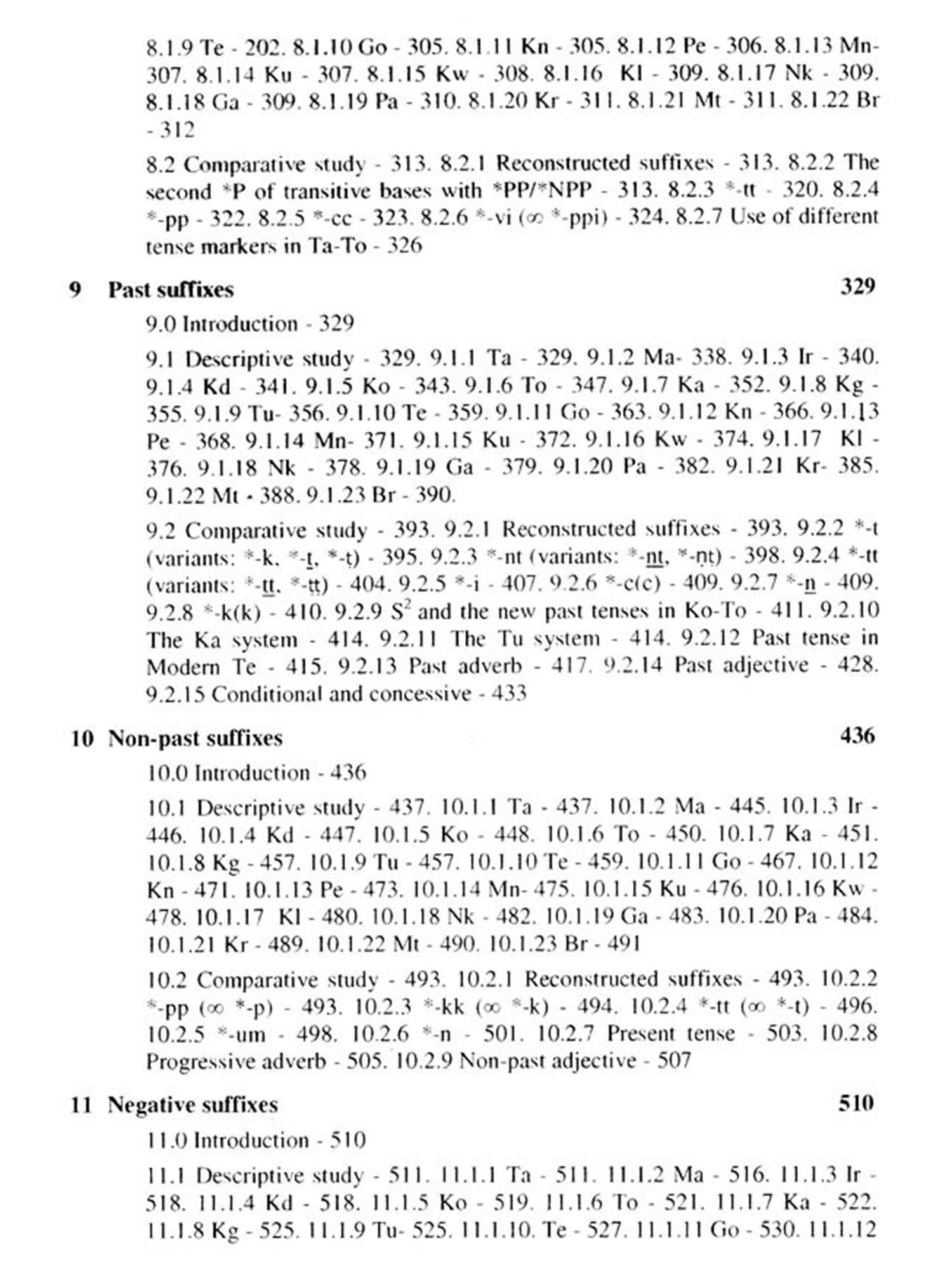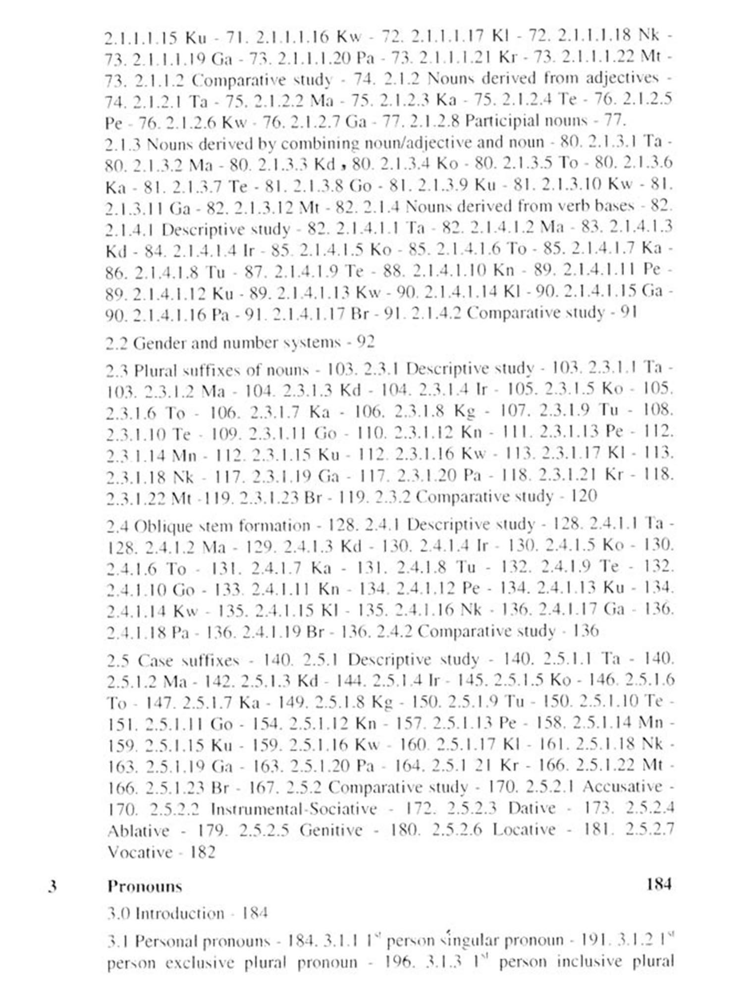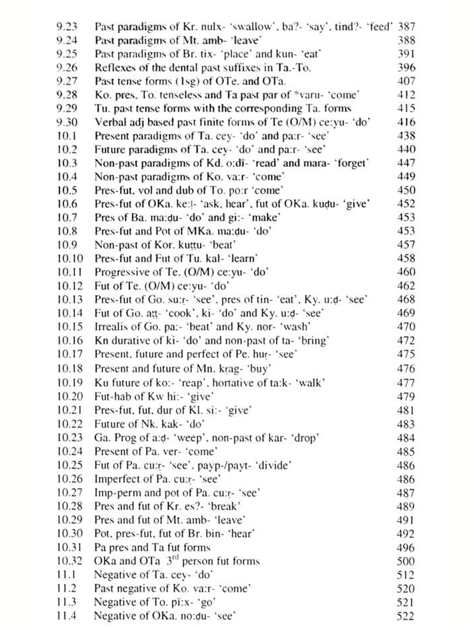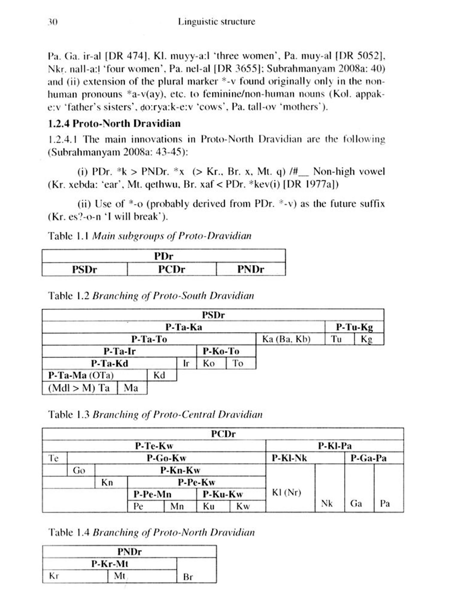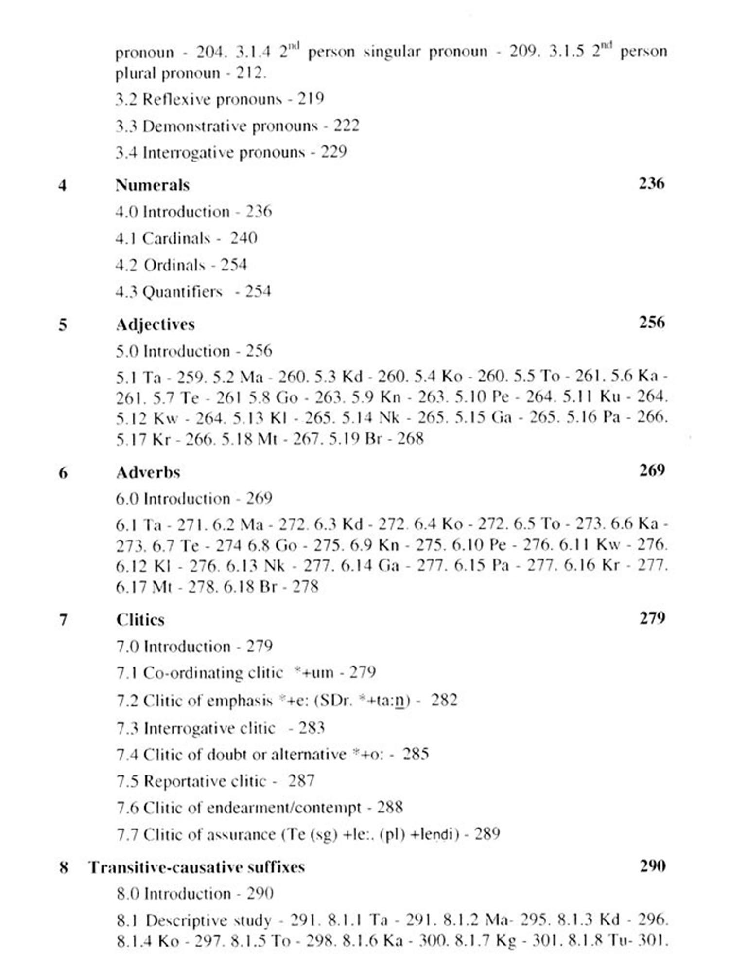 The present work contains 15 chapters Linguistic Structure of the Dravidian Languages. Nouns, Pronouns, Numerals, Adjectives, Adverbs, Clitics, Transitive-Causative Suffixes, Past Suffixes, Non-past Suffixes, Negative Suffixes, Pronominal Suffixes, Infinitive Suffixes, Imperative Suffixes and Auxiliaries and Pe-KW Extended Bases, respectively.