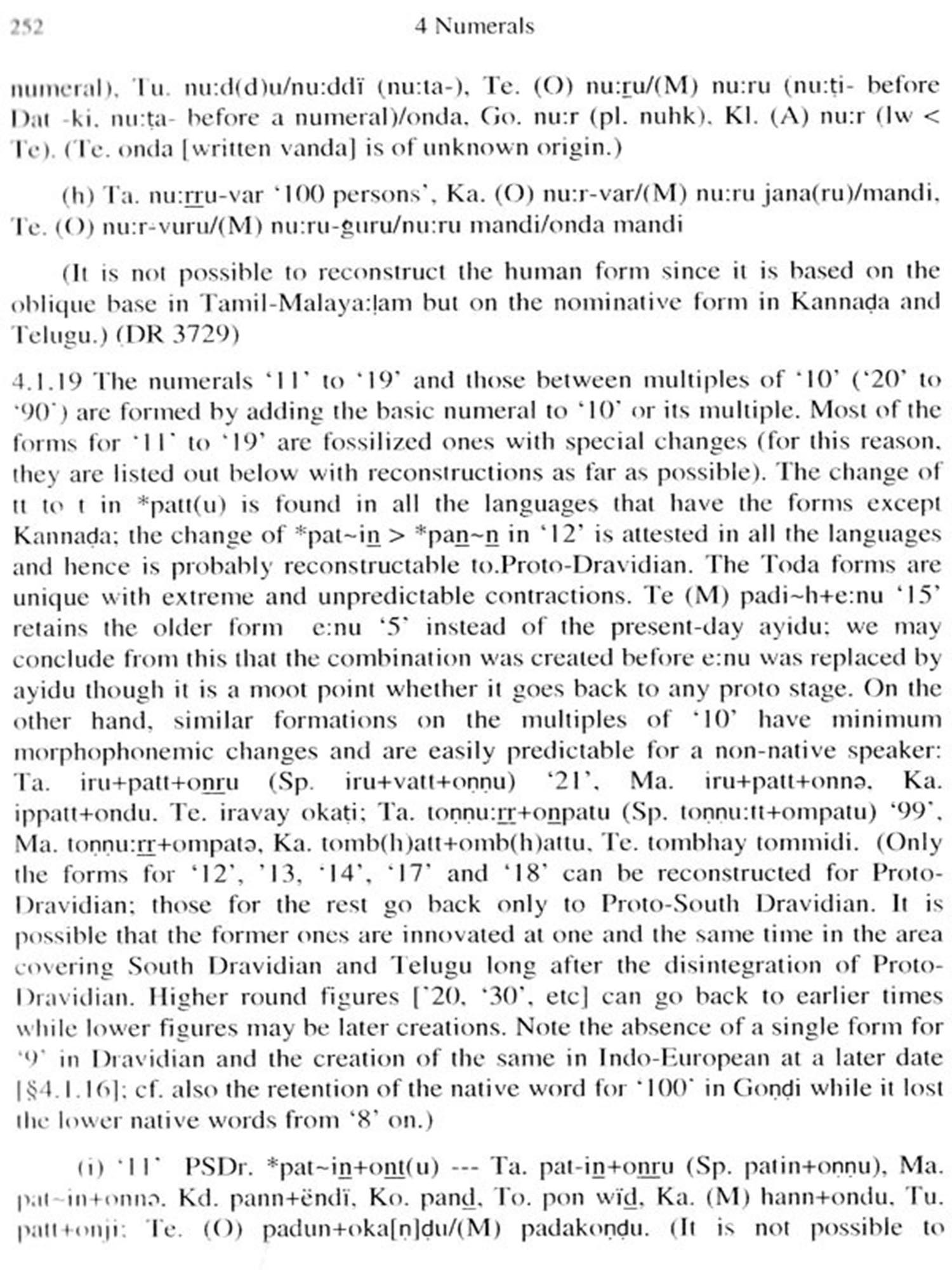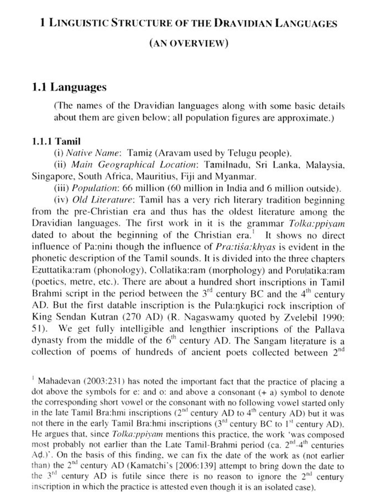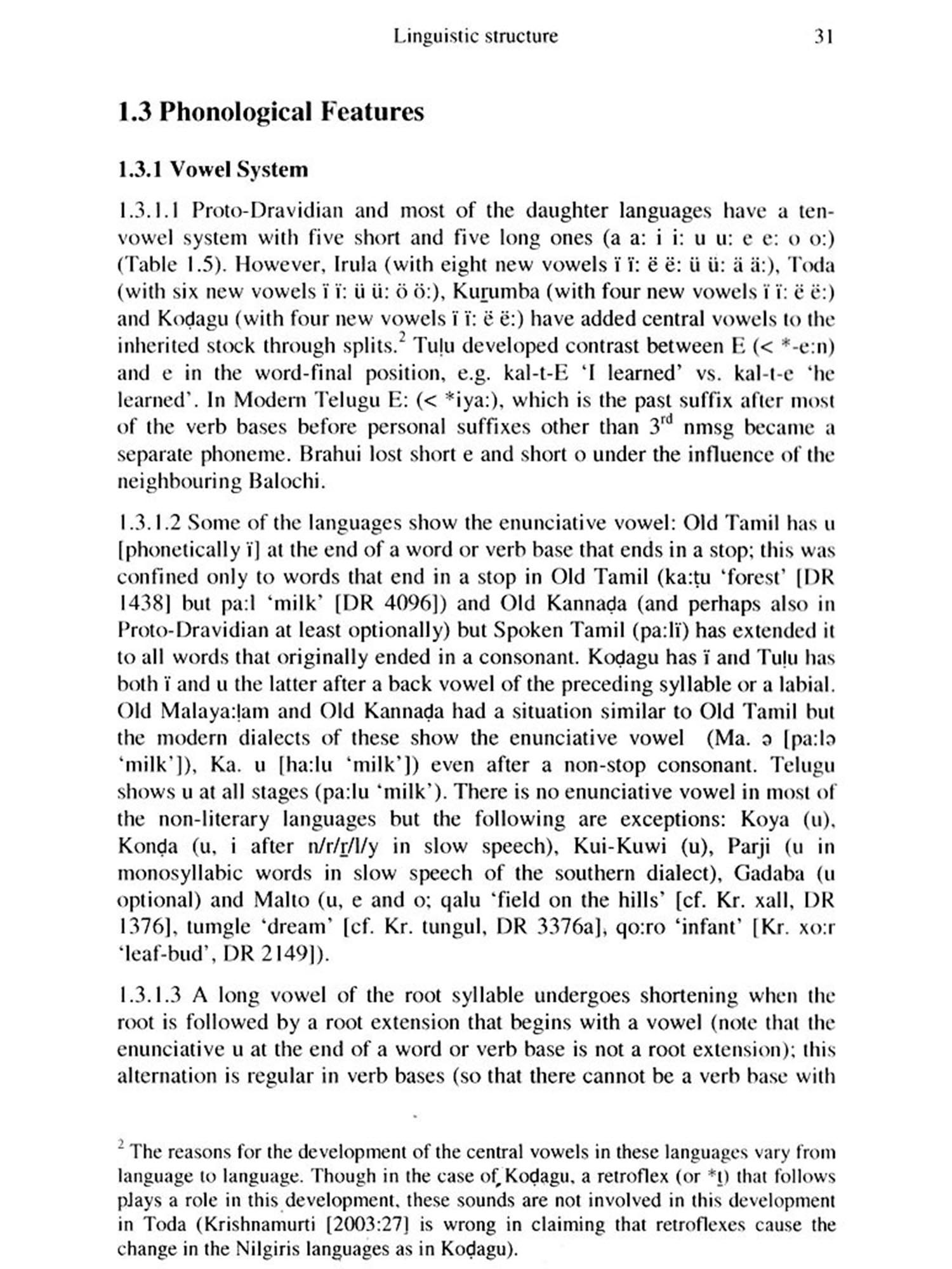 Chapter 1 serves as a concise introduction to the structure of the Dravidian languages from a comparative point of view covering important aspects of phonology, morphology and syntax. Chapters 2 to 7 treat the morphological and syntactic aspects of the nominal system including pronouns, adjectives, adverbs and clitics. Chapters 8 to 15 cover the morphosyntax of the verb system. While discussing the formations of the older stages of Tamil, Kannada and Telugu, I have given citations from the classics (most of them selected by myself) with the hope that they, apart from serving as live illustrations, will create interest in the classics in the minds of the readers. In giving illustrations for syntactic use an attempt has been made to give semantically equivalent sentences in the four literary languages; sentences from Kodagu and Tuļu are also added in most of the cases,