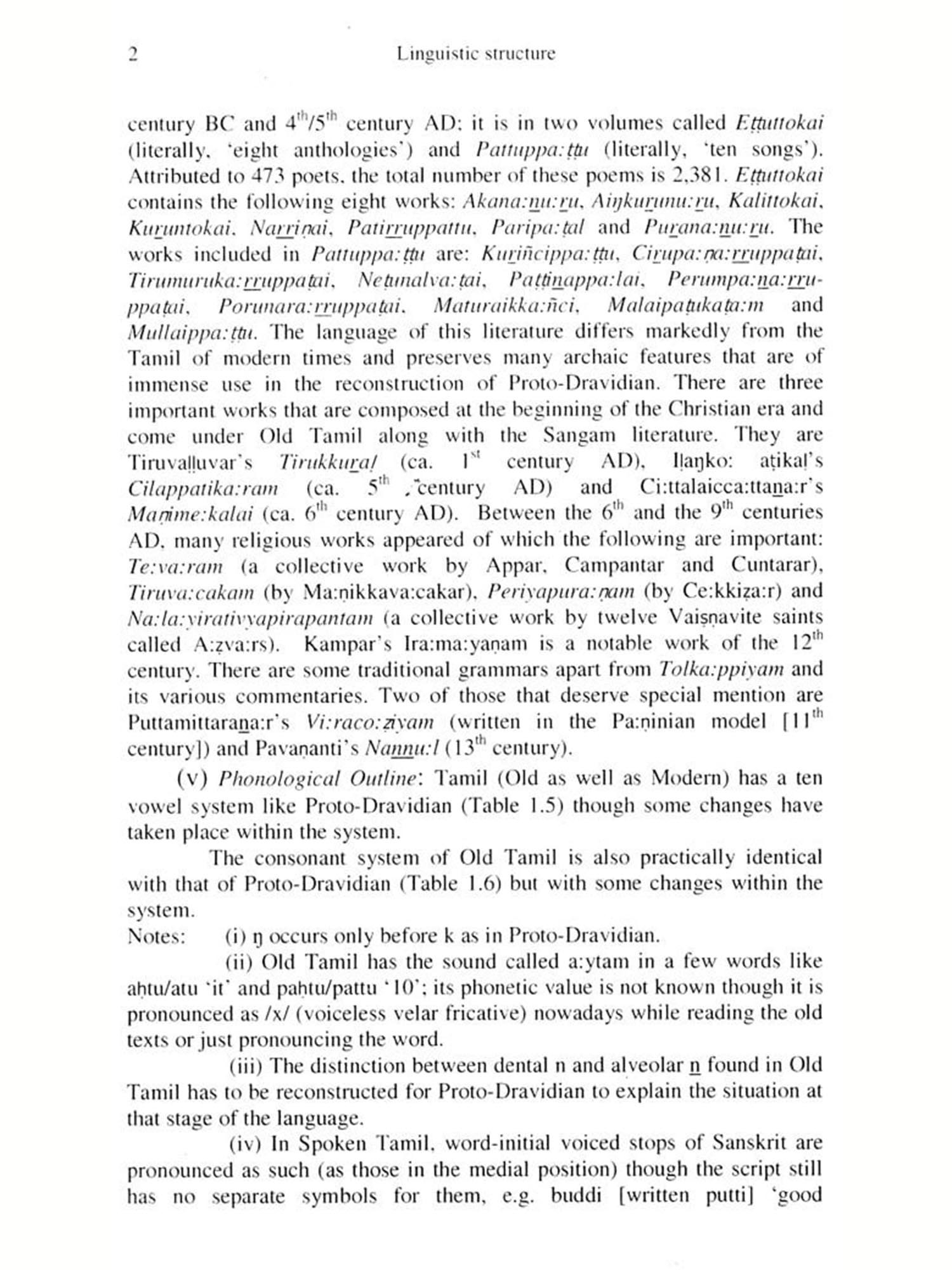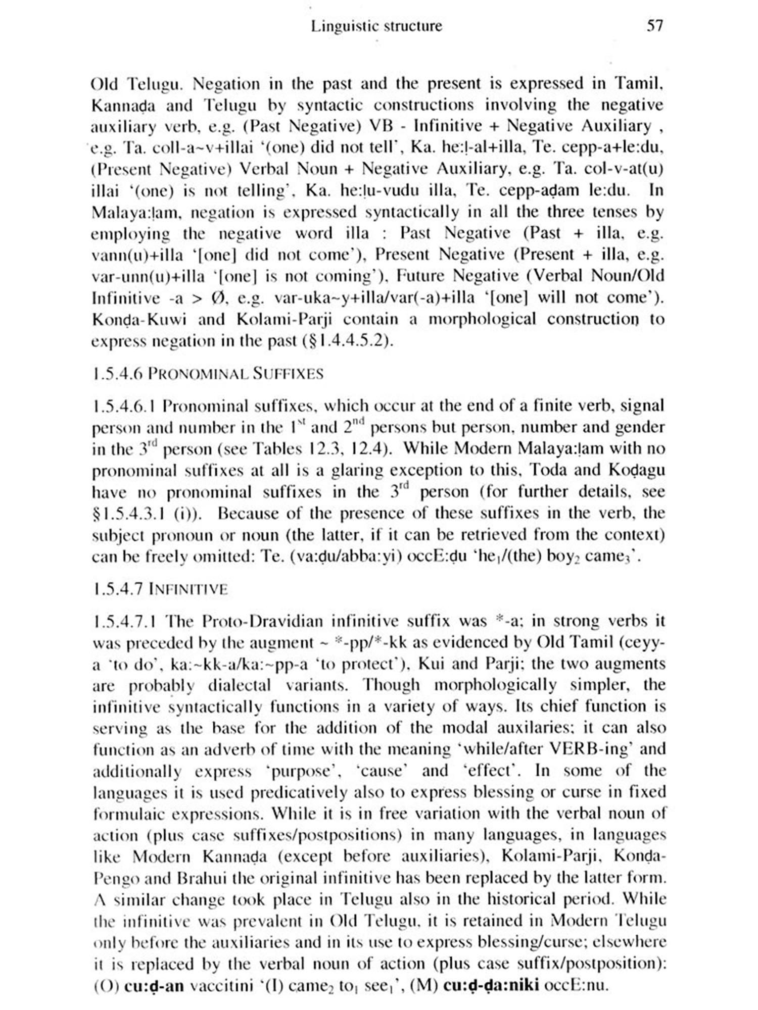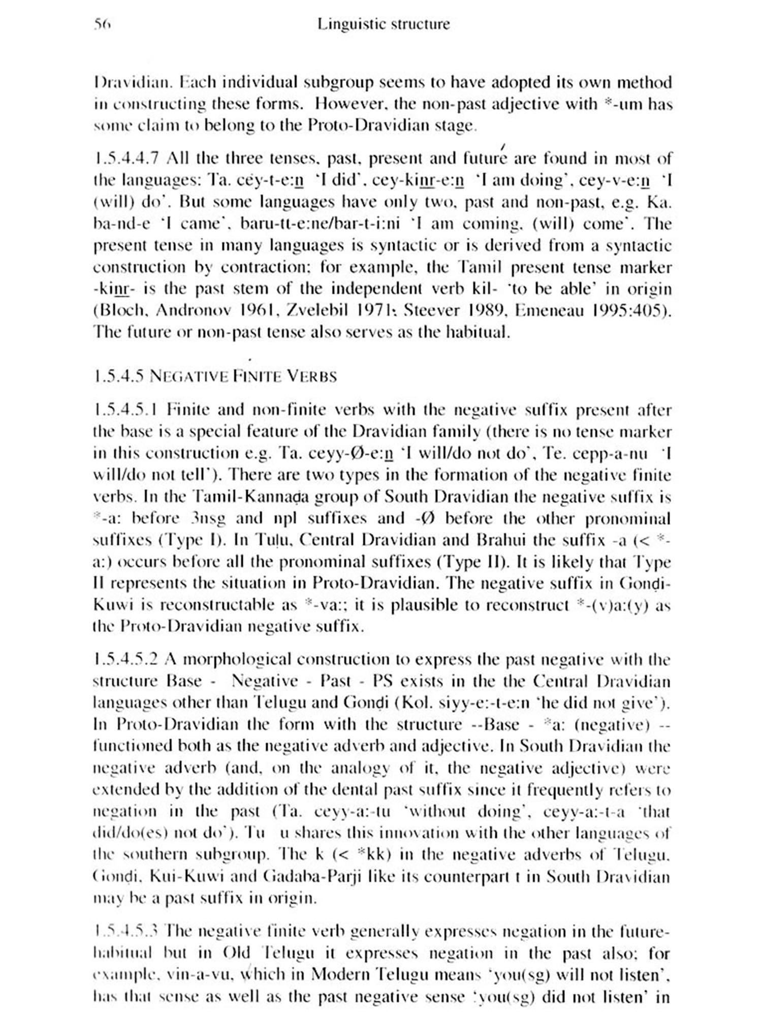 Since the part of the work that deals with the morphosyntax of the verb is a revised version of my Dravidian verb morphology: a comparative study (Annamalai University, 1971), which in its turn is based on my Ph.D. thesis (Andhra University. 1964), a few words on the course taken by my research work during this long period may not be out of place here. I started work on the comparative study of the verb morphology of the Dravidian languages at the Andhra University in 1959 under the guidance of Professor Bh. Krishnamurti and Professor G.J. Somayaji. When I joined the Department of Linguistics, Annamalai University (on January 25, 1962), I found it to be the ideal place to continue my research. Scholars were readily available there for helping me in collecting information and for discussion on Tamil, Malayalam and Kannada; this greatly supplemented the data available from the books. Professor SV. Shanmugam, Professor K. Murugaiyan and Professor N. Kumaraswami Raja (who joined a little later) helped me regarding Tamil (even the papers of L.V..