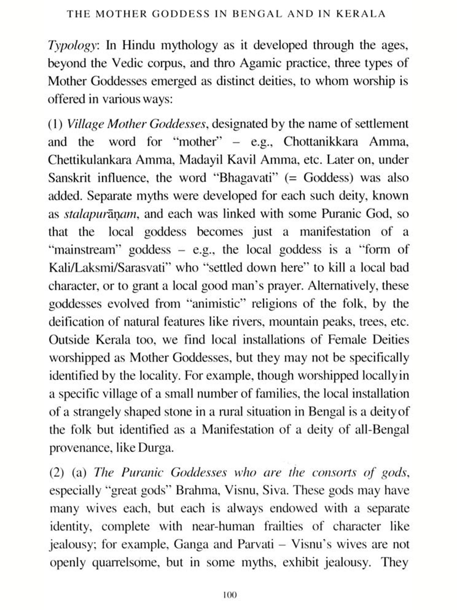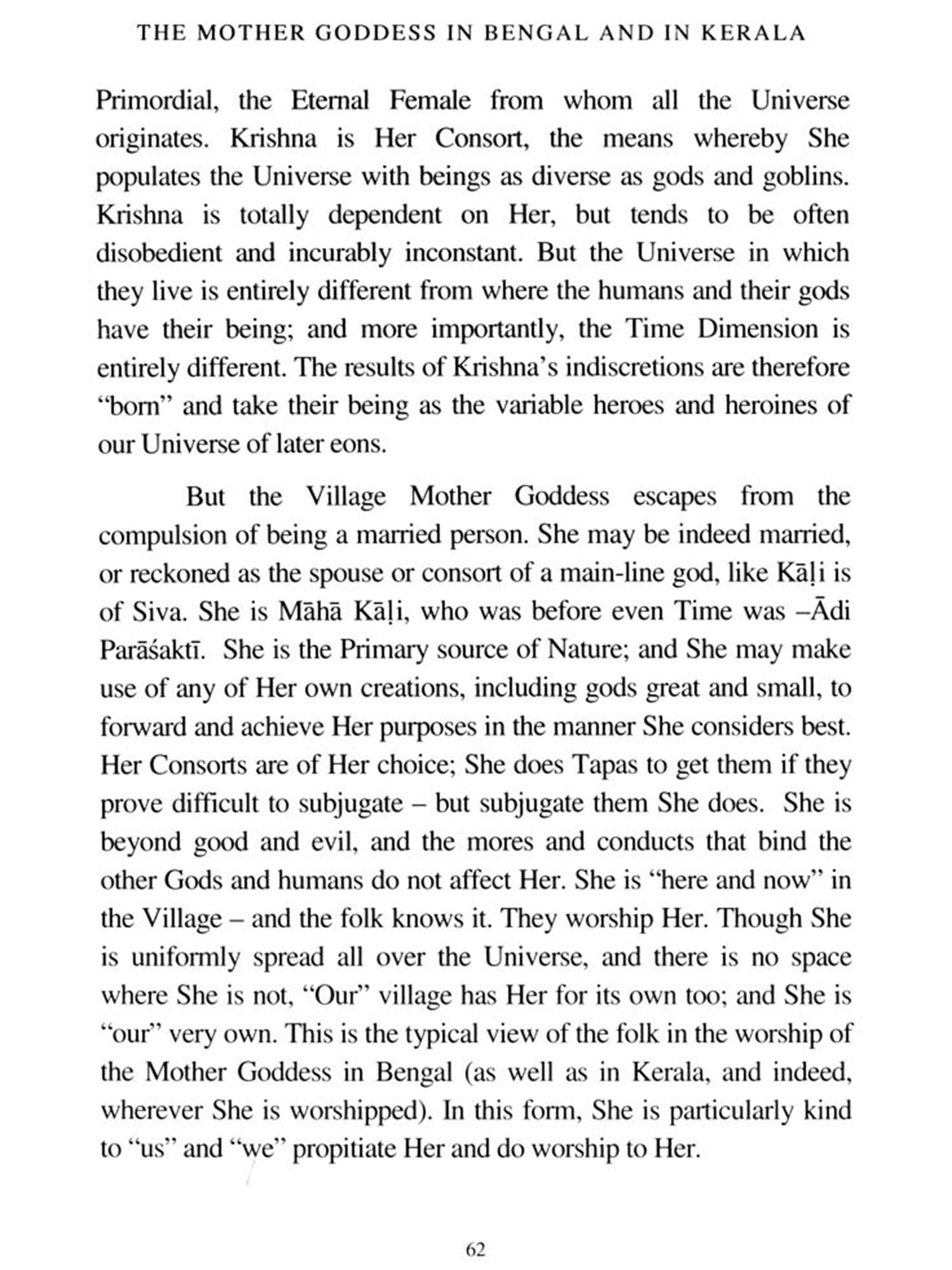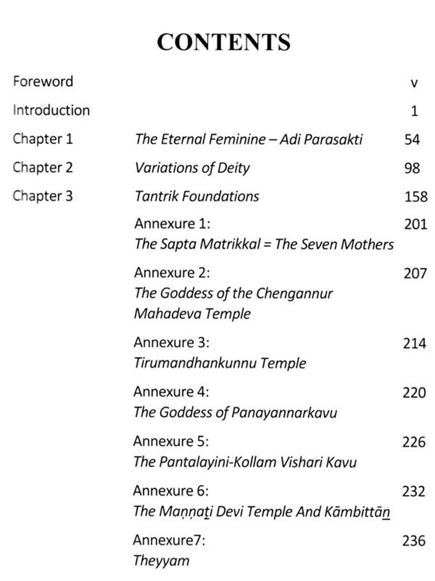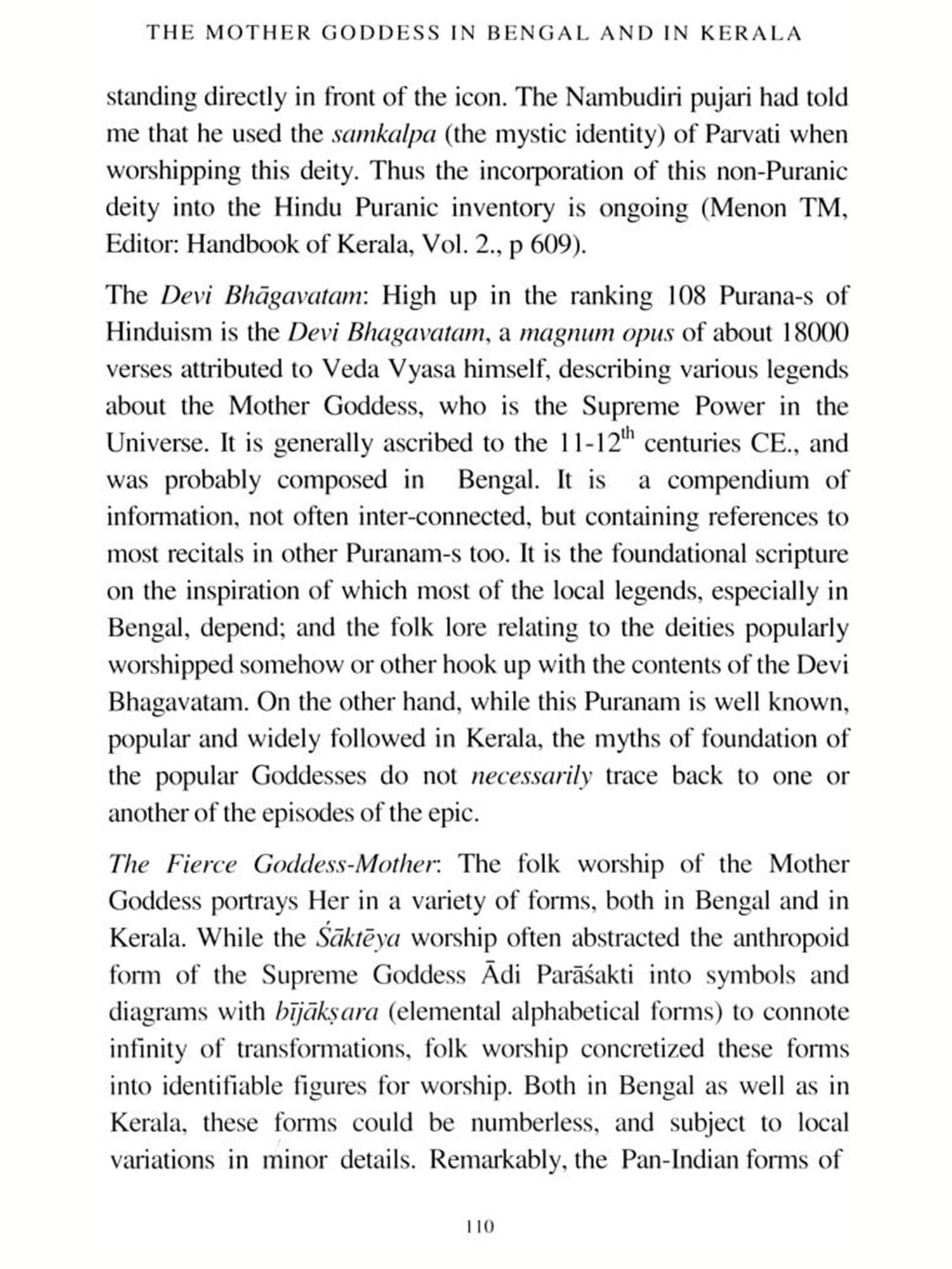 By utilising a generous grant from the Government of West Bengal, the Council of Direction of International School of Dravidian Linguistics entrusted T. Madhava Menon IAS to write a book on The Mother Goddess in Bengal and in Kerala. Within the stipulated time he finished the work and submitted the report. It is published here with slight modifications regarding diacritic marks noted by Dr. Ravi Sankar S. Nair.