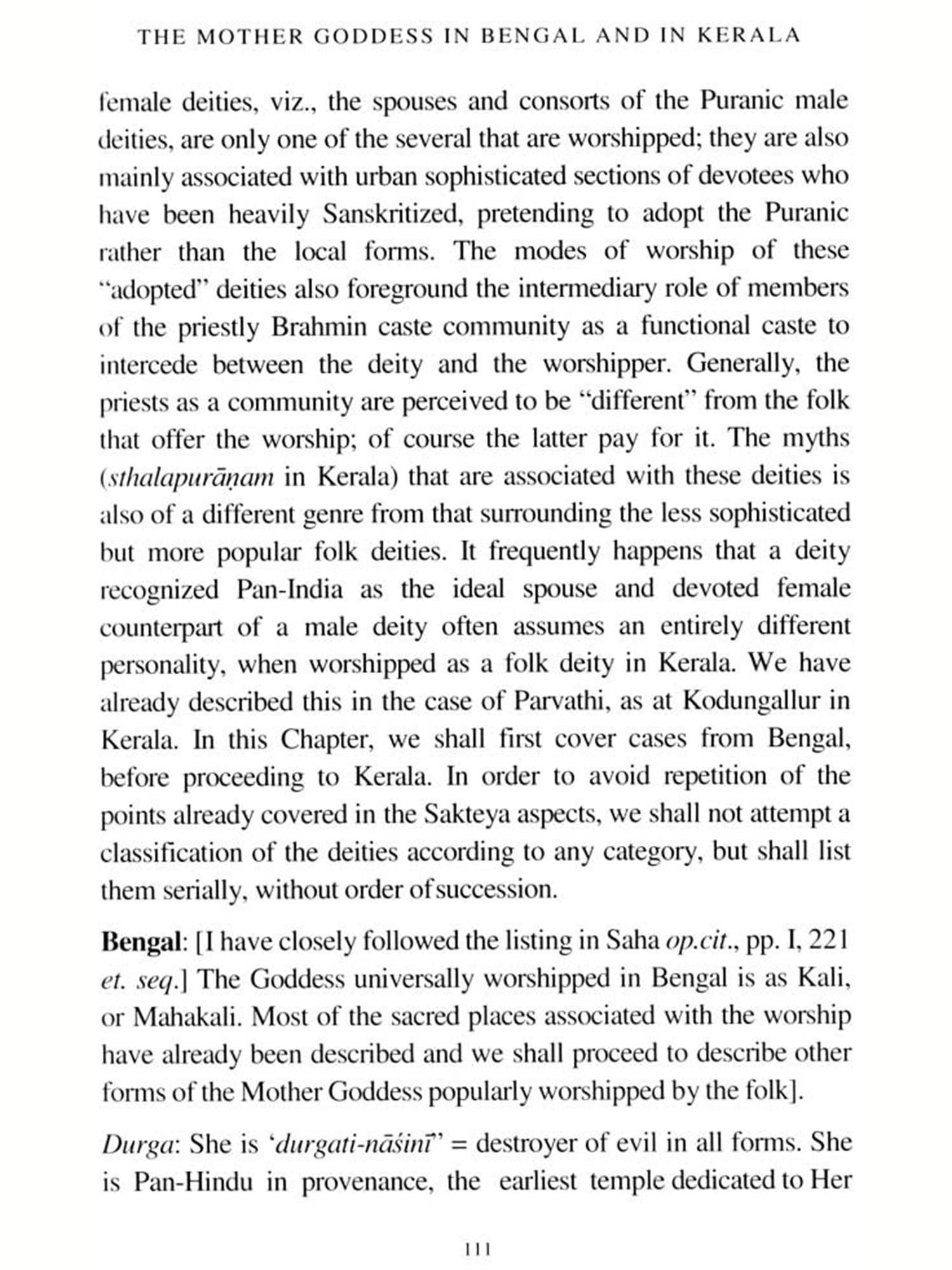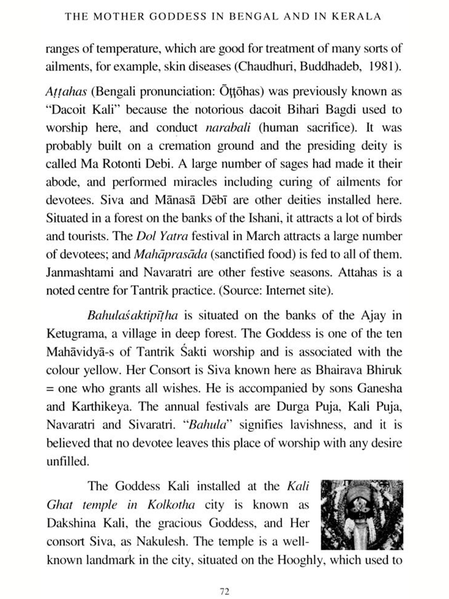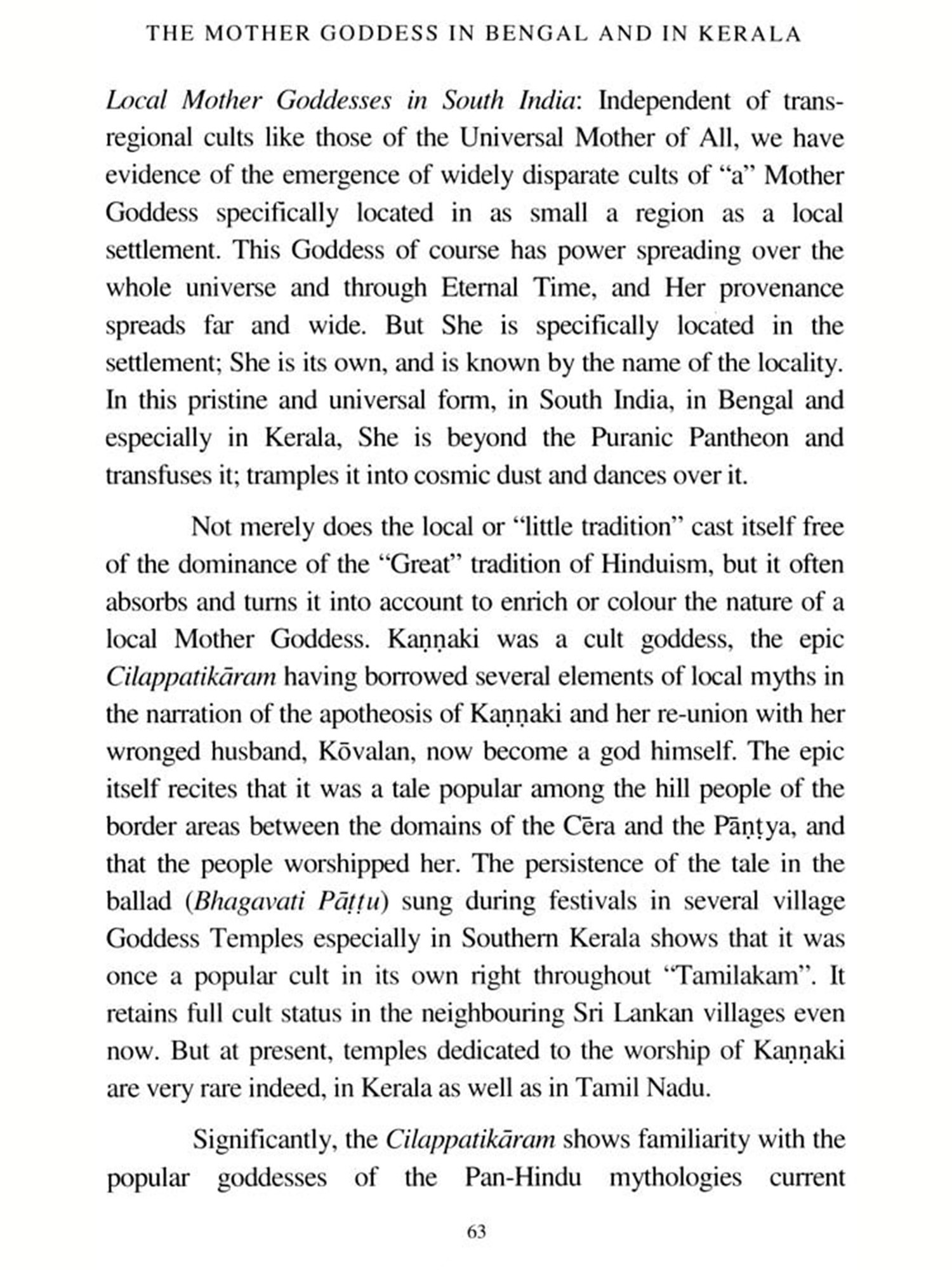 By utilising a generous grant from the Government of West Bengal, the Council of Direction of International School of Dravidian Linguistics entrusted T. Madhava Menon IAS to write a book on The Mother Goddess in Bengal and in Kerala. Within the stipulated time he finished the work and submitted the report. It is published here with slight modifications regarding diacritic marks noted by Dr. Ravi Sankar S. Nair.