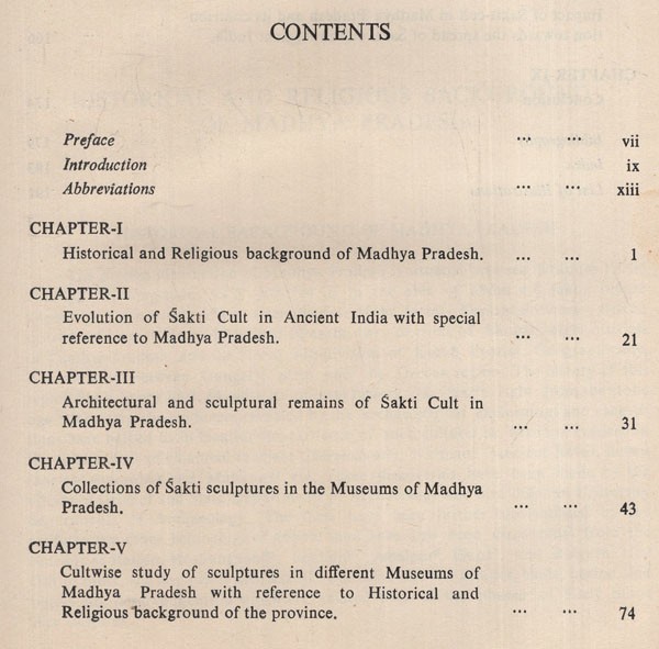 No serious attempt has been made, so far, to study the sculptures of the museums except Shri R.S. Garg who wrote a small monograph on the Saktis of Central Museum, Indore, and also a guide book on these deities of Dhubela Museum by S.K. Dixit. Encouraged by these works we have made a humble attempt to study the Sakti sculpture of museums of Madhya Pradesh. For a significant study the present work is divided into different chapters dealing with all social and religious aspects of the contemporary society in general and Madhya Pradesh in particular.