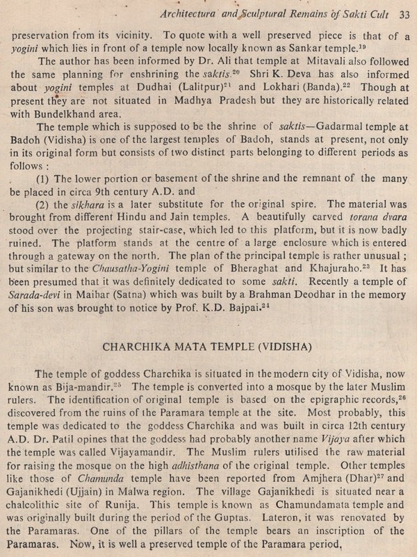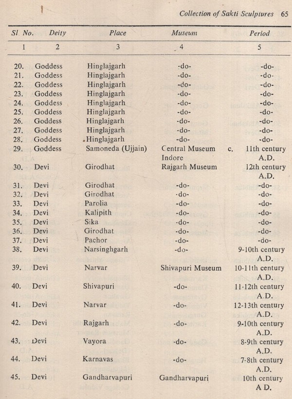 The modern jurisdiction of Madhya Pradesh had been an important and central region of India and played significant role in the past history, culture and different religious systems of the country right from the dawn of civilization. The prehistoric culture flourished in this region. Later on, during the historic period, the famous centres like Avanti, Ujjaini, Dasarana, Kosal have their glorious role in ancient Indian history and cultures. Many cultural centres flourished at various places in this region in different phases of history of the past. The Sakti worship, a part and parcel of Hindu Religious Philosophy, too, is routed in this particular region. It has a deeper impact on the religious life of the people of India. It also reflected the religious systems of the neighbouring regions. Scholars like R.D. Banerji, O.C. Ganguly, D.C. Sircar, N.K. Bhattasali, have contributed significantly in bringing out the authentic texts on Sakti worship in India and a considerable Sakti sculptures have been published by R.D. Banerji, Ganguli, Bhattasali etc. which confirm us that the deities were displayed in different forms in the temples. We are really indebted to the pioneer scholars like A.K. Coomaraswamy, Stella Kramrich, Bhandarkar, and V.S. Agrawal, etc. who have been constantly focusing light upon the history and philosophy of the Sakti worship, the Sakti cult and its impact on the contemporary society. After indepen dence the writing of these scholars have undoubtedly attracted the attention of the scholars concerned. It was Dr. D.C. Sircar who wrote on the authentic monograph by other research works, viz., that of S.K. Dixit, Banerji, V.S. Agrawal, Pushpendra Kumar, H.C. Das, B.N. Sharma, M C.P. Srivastava, and a good monograph by Chakravarti, which appeared in 1963. Obviously the works of these scholars have been a source of authentic information regarding the history, philosophy and development of the Sakta-pitha, the impact of tantra cult etc., but these works cannot be claimed as final because there is always scope for new discoveries, interpretations and suggestions. Besides these, a new trend of regional studies has also scholars attracted, more than the general study. After independence many rew sculptures of yoginis, mother-goddesses, have been brought to light and also the remains of Sakta-pitha were located in different parts of the country. Madhya Pradesh stands first in such discoveries as several sculptures of Sakti and the remains of Sakta pithas were brought to notice in Madhya Pradesh. Most of the Sakti sculptures are still preserved in different museums of Madhya Pradesh, which invite the attentions of scholars. The work of R.K. Sharma on Chaushatha-yogini temple at Bheraghat proves that such attempts may be taken on other centres of yoginis like Khajuraho, Hinglajgarh, Gopalpur, etc. but it has not been done so far. Besides these, numerous sculpture of Saktis in the museums and at sites are significant.