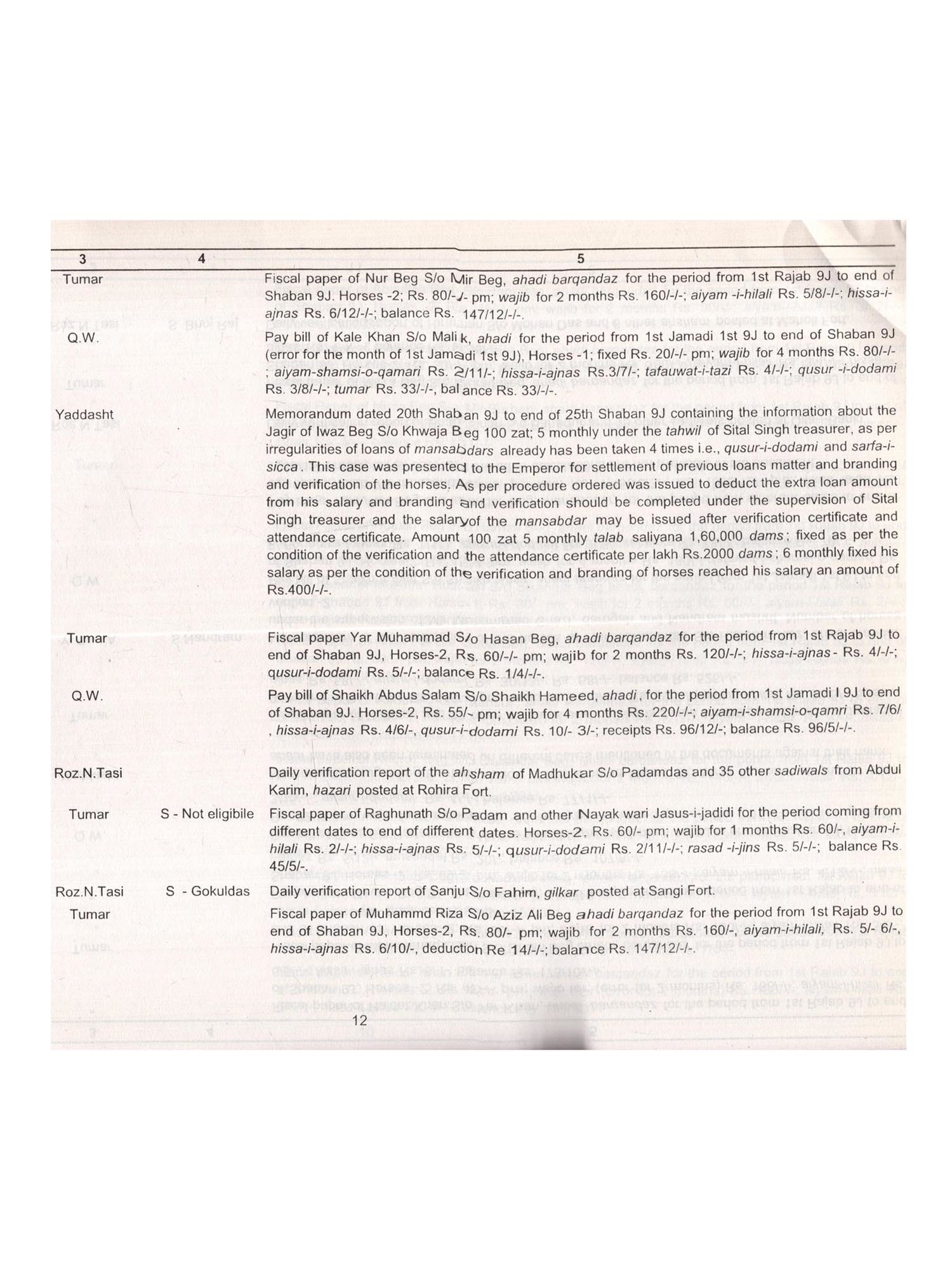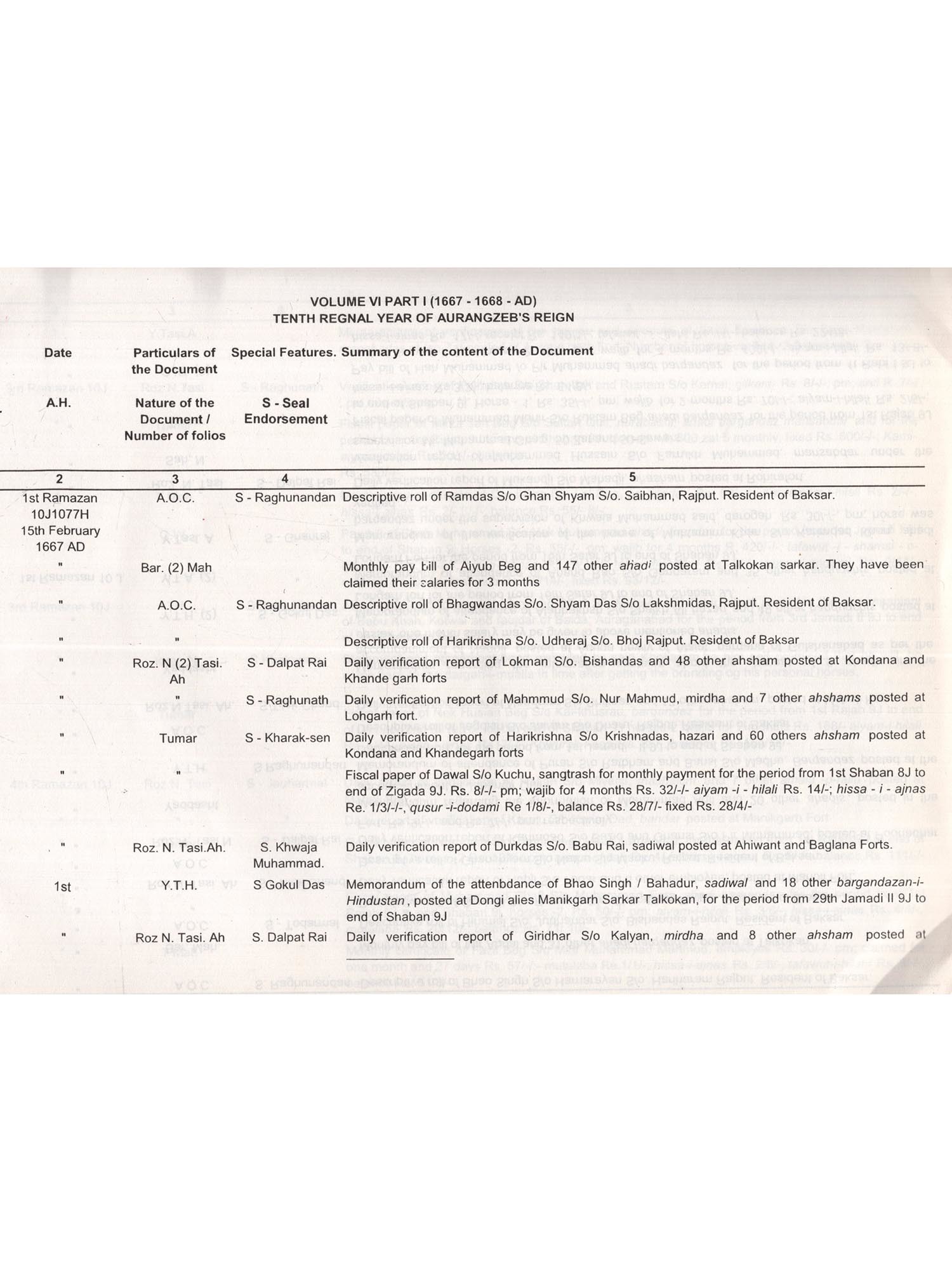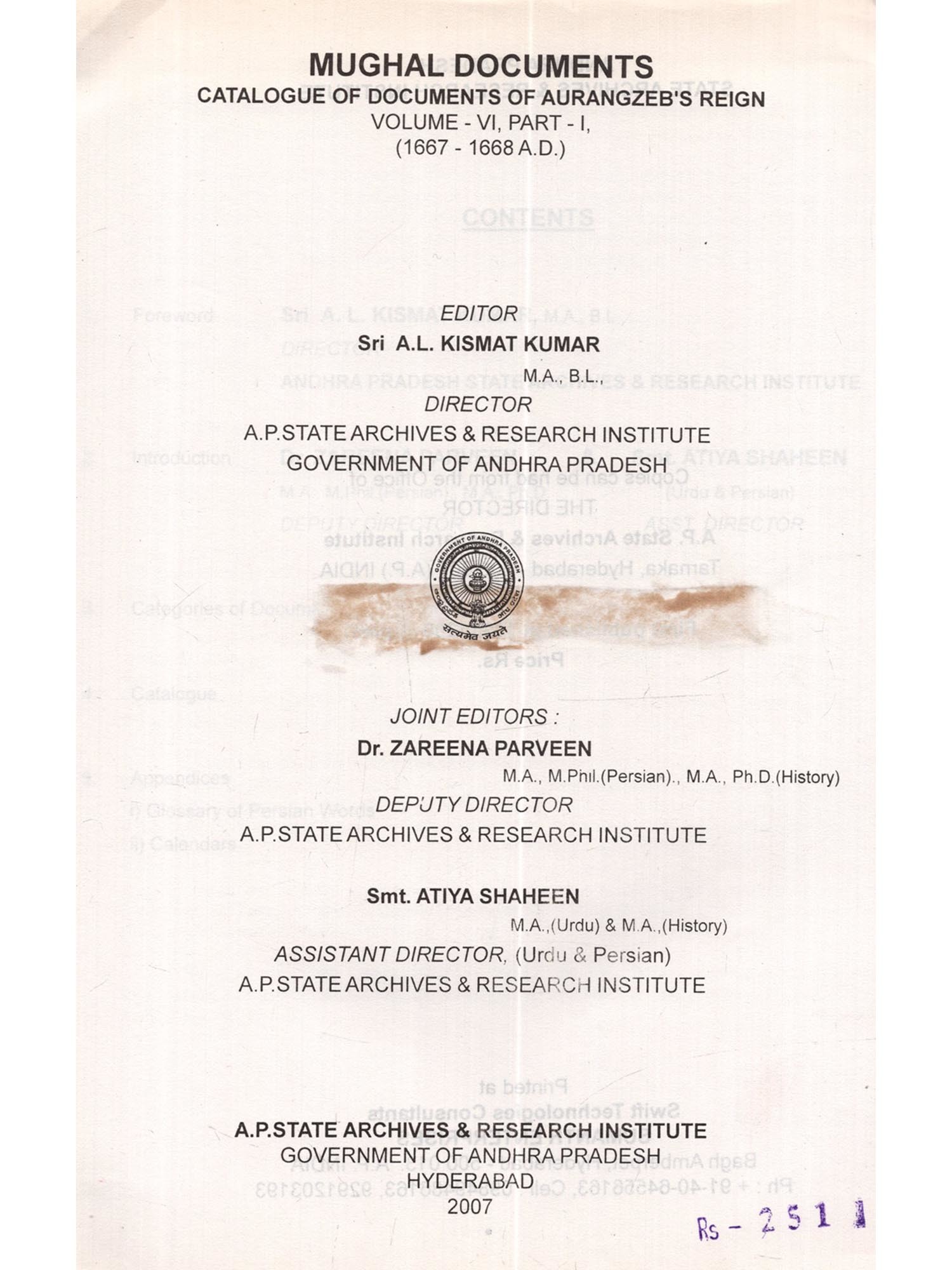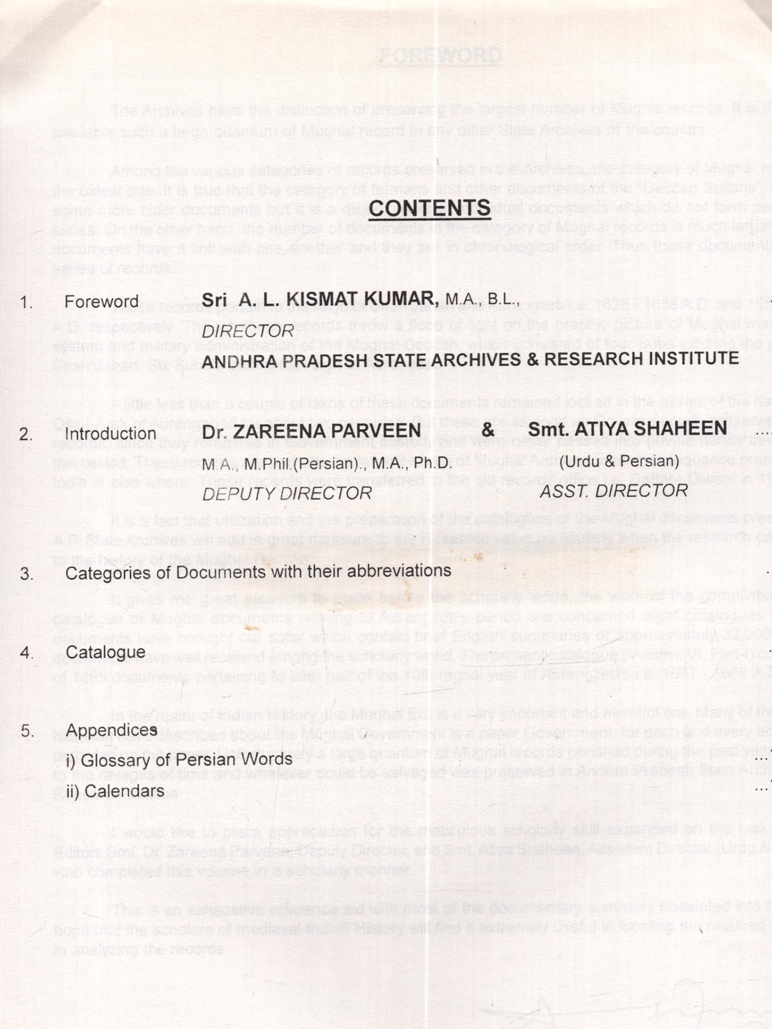 The Archives have the distinction of preserving the largest number of Mughal records. It is difficult to available such a large quantum of Mughal record in any other State Archives of the country. Among the various categories of records preserved in the Archives, the category of Mughal records is the oldest one It is true that the category of farmans and other documents of the "Deccan Sultans", contains some more older documents but it is a disjointed lot of individual documents which do not form part of any series. On the other hand, the number of documents in the category of Mughal records is much larger and the documents have a link with one another and they are in chronological order. Thus these documents form a series of records. These records pertain to the reign of Shah Jahan and Aurangzebie. 1628-1658 A.D. and 1658-1707 A D. respectively. Though these records throw a flood of light on the graphic picture of Mughal mansabdari system and military administration of the Mughal Deccan, which consisted of four Suba's during the period of Shah Jahan. Six Suba's during the reign of Aurangzeb. A little less than a couple of lakhs of these documents remained locked in the niches of the halls of the Qila-i-Arak of Aurangabad for about two centuries. But these are as good as Governmentally preserved official records, since they remained in Government custody and were never passed into private hands through out this period. These records are perhaps the largest series of Mughal Archives in perfect sequence prescribed in India or else where. These records were transferred to the old records office i.e. Daftar-i-Diwani in 1916. It is a fact that utilization and the preparation of the catalogues of the Mughal documents preserved in AP State Archives will add in great measure to the Research value particularly when the research concerned to the history of the Mughal Deccan. It gives me great pleasure to place before the scholarly world, the work of the compilation of the catalogue of Mughal documents relating to Aurangzeb's period are concerned eight catalogues of these documents have brought out sofar which contain brief English summaries of approximately 32,000 Persian documents have well received among the scholarly world. The present catalogue (Volume-VI, Part-1) comprises of 1865 documents pertaining to later half of the 10th regnal year of Aurangzeb's i e. 1667-1668 A. D In the realm of Indian History, the Mughal Era is a very important and eventful era. Many of the emient historian have described about the Mughal Government is a paper Government, for each and every action was recorded on the paper, Unfortunately a large quantum of Mughal records perished during the past years, owing to the ravages of time and whatever could be salvaged was preserved in Andhra Pradesh State Archives and Research Institue. I would like to place appreciation for the meticulous scholarly skill expanded on the task by Joint Editors Smt. Dr. Zareena Parveen, Deputy Director, and Smt. Atiya Shaheen, Assistant Director (Urdu & Persian) who completed this volume in a scholarly manner. This is an exhaustive reference aid with most of the documentary summary translated into English. I hope that the scholars of medieval Indian History will find it extremely useful in locating the required data and in analyzing the records.