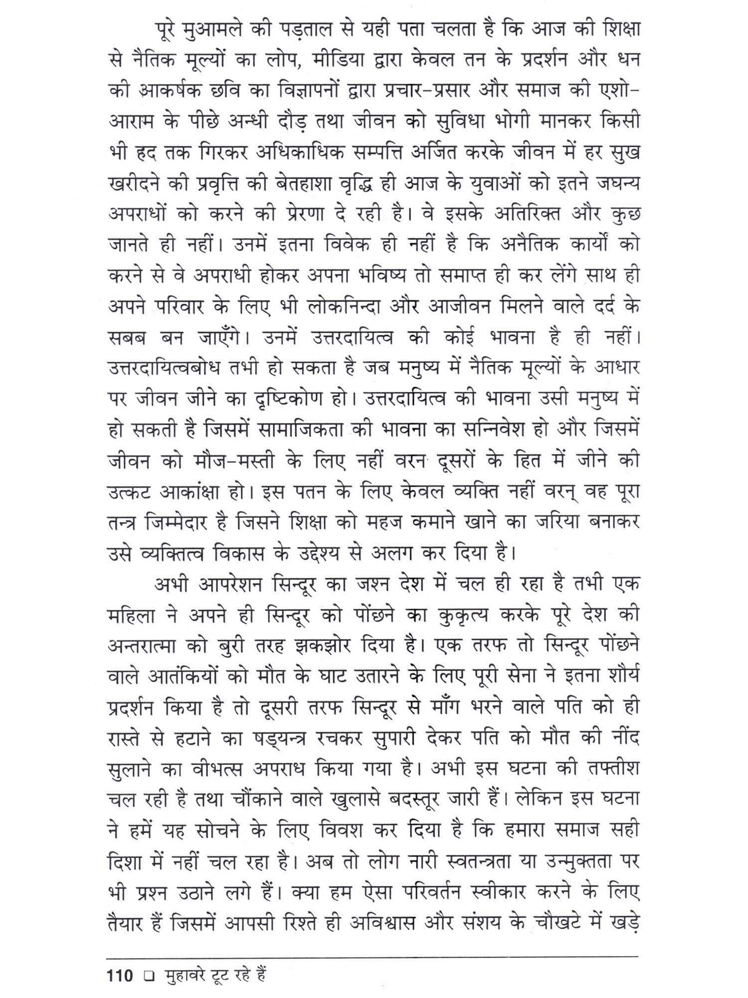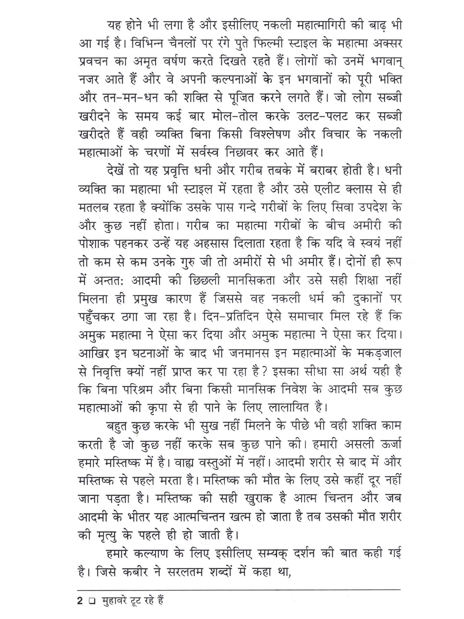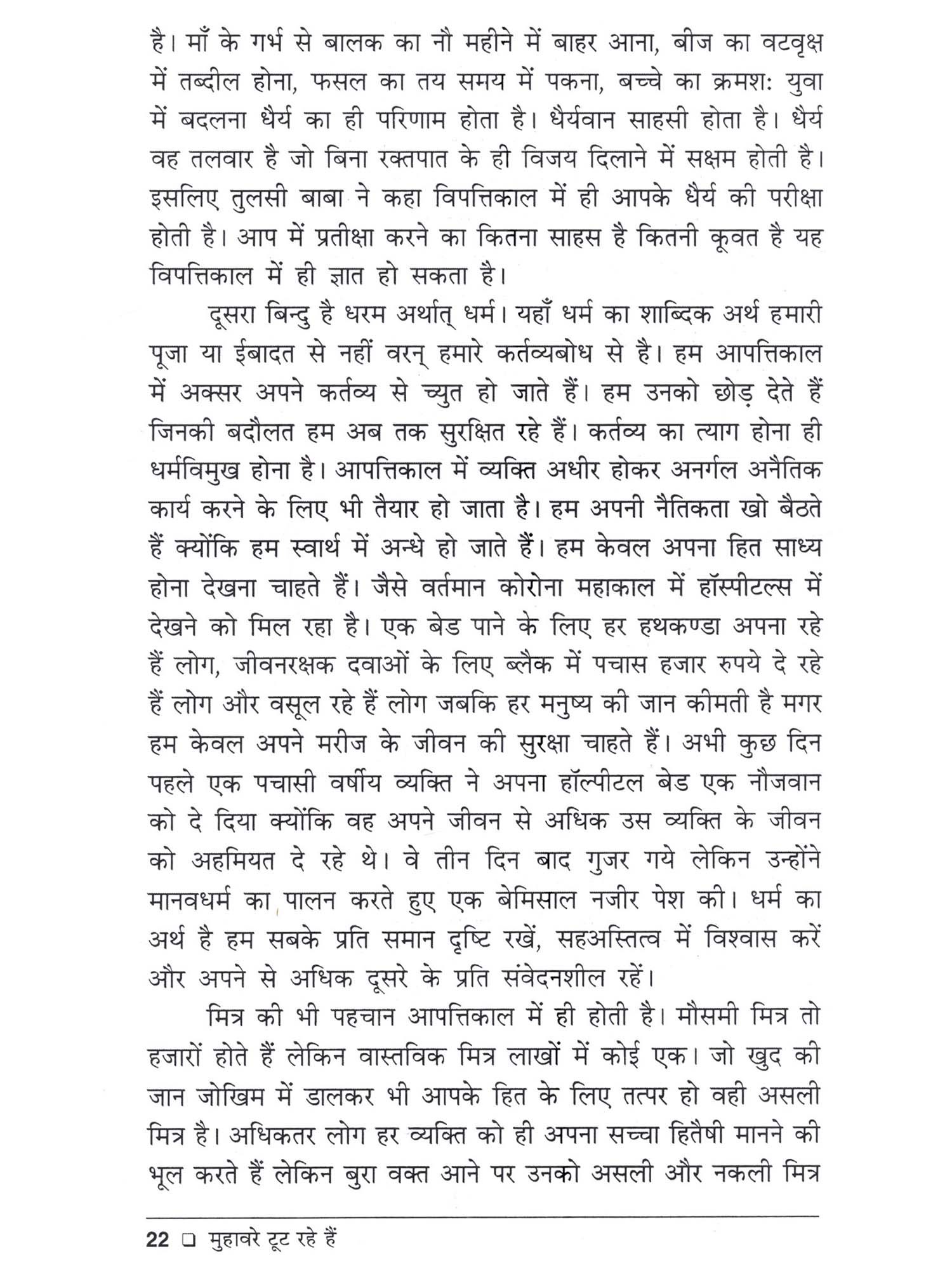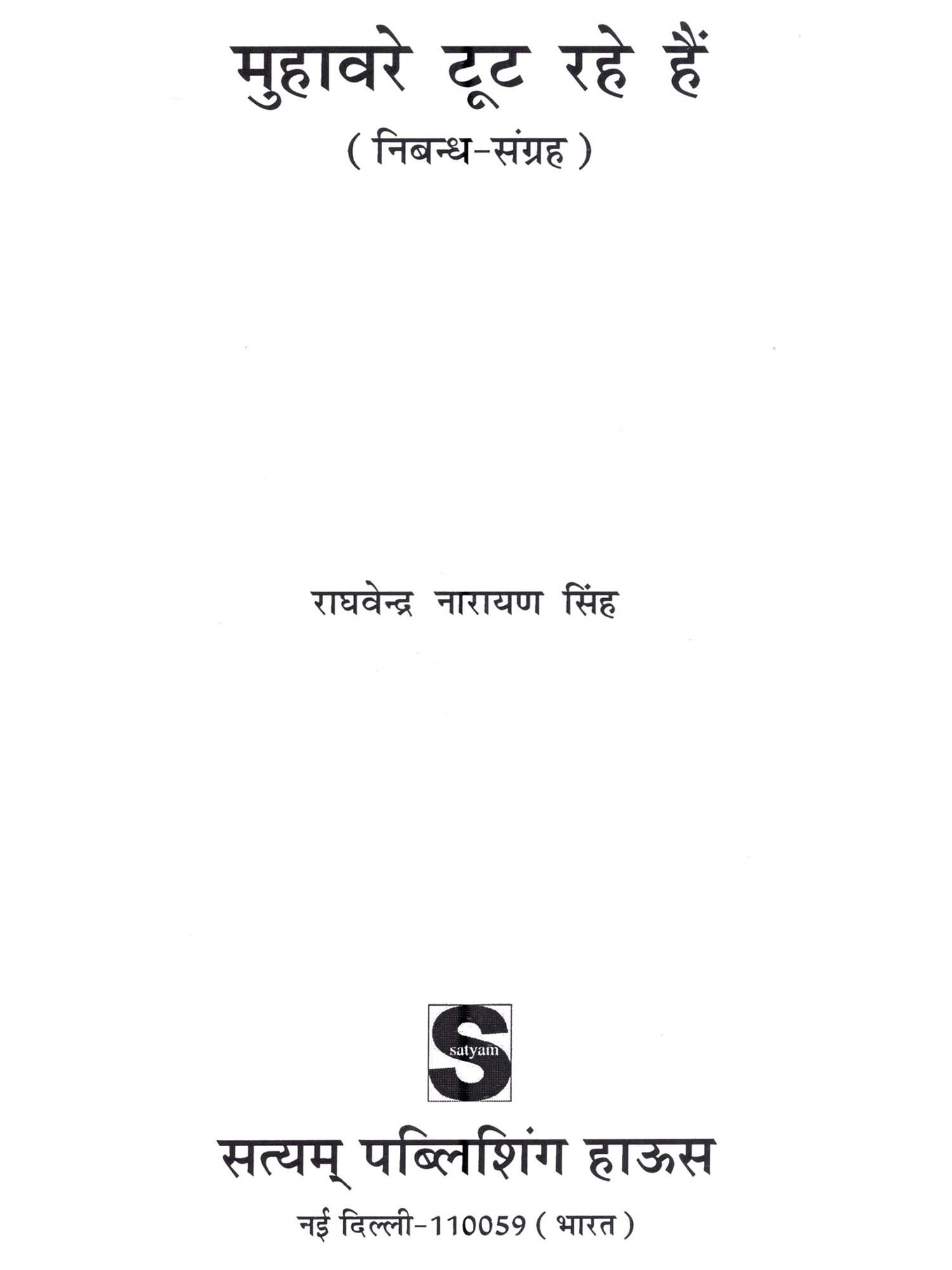 सामयिक वरिष्ठ साहित्य डॉ० राघवेन्द्र नारायण सिंह ने कविता, उपन्यास, निबन्ध, अनुवाद और समीक्षा के माध्यम से हिन्दी-साहित्य में अपना विशिष्ट योगदान दिया है। तिरसठ से अधिक पुस्तकों के लेखक डॉ० राघवेन्द्र नारायण सिंह द्वारा सृजित 'मुहावरे टूट रहे हैं' उनके नवीनतम निबन्धों का संग्रह है। साहित्य में निबन्ध-विधा लेखकों को स्वतन्त्र रूप में अपने विचारों को अभिव्यक्ति देने का सशक्त माध्यम है। लेखक की स्वतन्त्रता इस विधा में साहित्य की अन्य समस्त विधाओं में इस अर्थ में असीमित रहती है कि वह किसी भी विषय पर अपनी लेखनी चलाने के लिए अधिकृत रहता है। डॉ० राघवेन्द्र नारायण सिंह के ही शब्दों में 'निबन्ध का कोई विशेष आकार-प्रकार नहीं रहता है। यह कुछ शब्दों से लेकर अनेक पृष्ठं तक का अपने विस्तार में हो सकता है। मेरे निबन्ध अधिकांशतः उन मुद्दों पर लिखे गये हैं जो समाज से सीधे तौर पर जुड़े हुए हैं। "मुहावरे टूट रहे हैं' में संकलित सभी निबन्ध जीवन के विविध पक्षों पर केन्द्रित हैं। जीवन के प्रति सही दृष्टिकोण उपलब्ध कराते हुए ये निबन्ध जीवन की तथ्यपरक विवेचना करते हैं। इनमें जीवन के वास्तविक सौन्दर्य और उसके अर्थ को रेखांकित करते हुए जीवन के उलझे हुए रेशों को सुलझाने का प्रयास किया गया है। इस निबन्ध संग्रह में चिन्तन और मनन का अटूट सिलसिला निबन्ध दर निबन्ध देखने को मिलता है। डॉ० राघवेन्द्र सिंह के निबन्धों का अपना विशिष्ट शिल्प है। विभिन्न सामाजिक, राजनीतिक, साहित्यिक, आर्थिक और मानवीय मुद्दों पर इन निबन्धों में लेखक ने अपना दृष्टिकोण संवाद की शैली में रोचक ढंग से प्रस्तुत किया है। डॉ० राघवेन्द्र नारायण सिंह के ये निबन्ध अपनी उत्कृष्टता और श्रेणी के स्वतः निर्धारक हैं।
