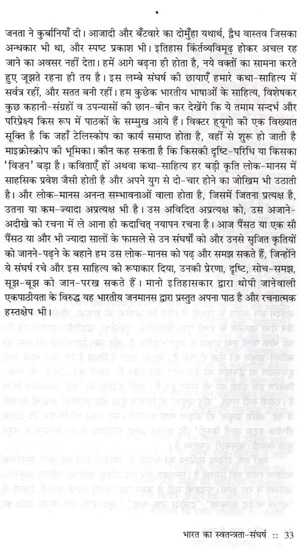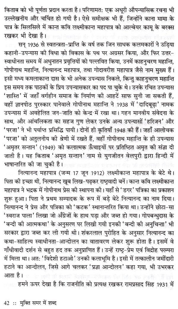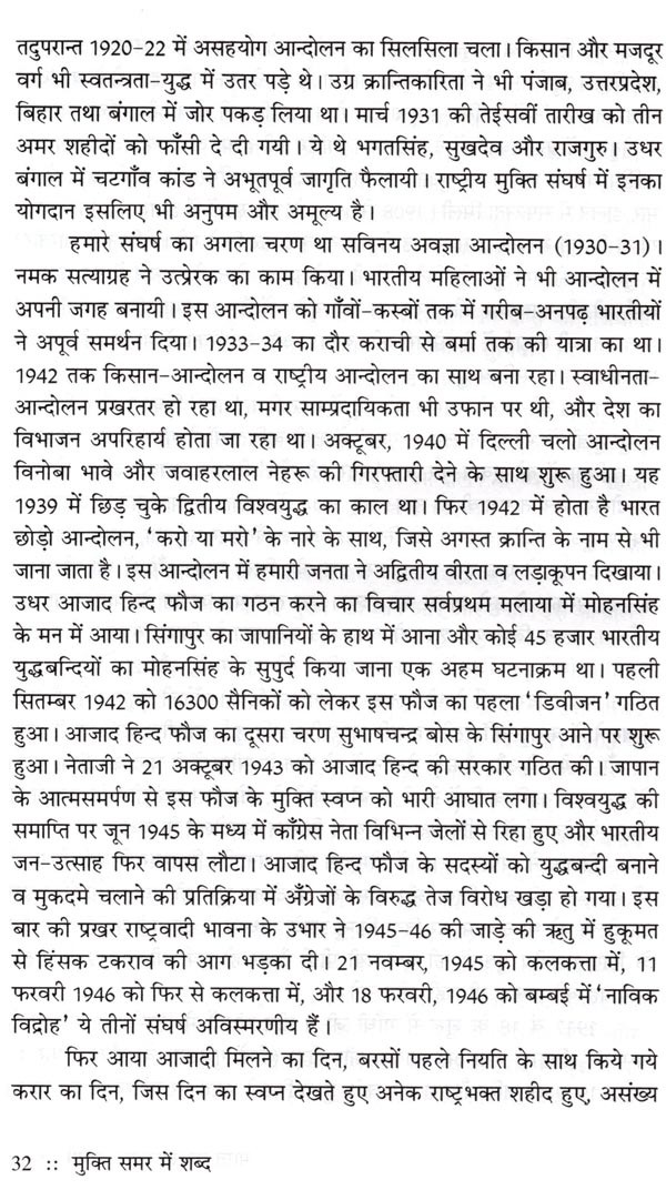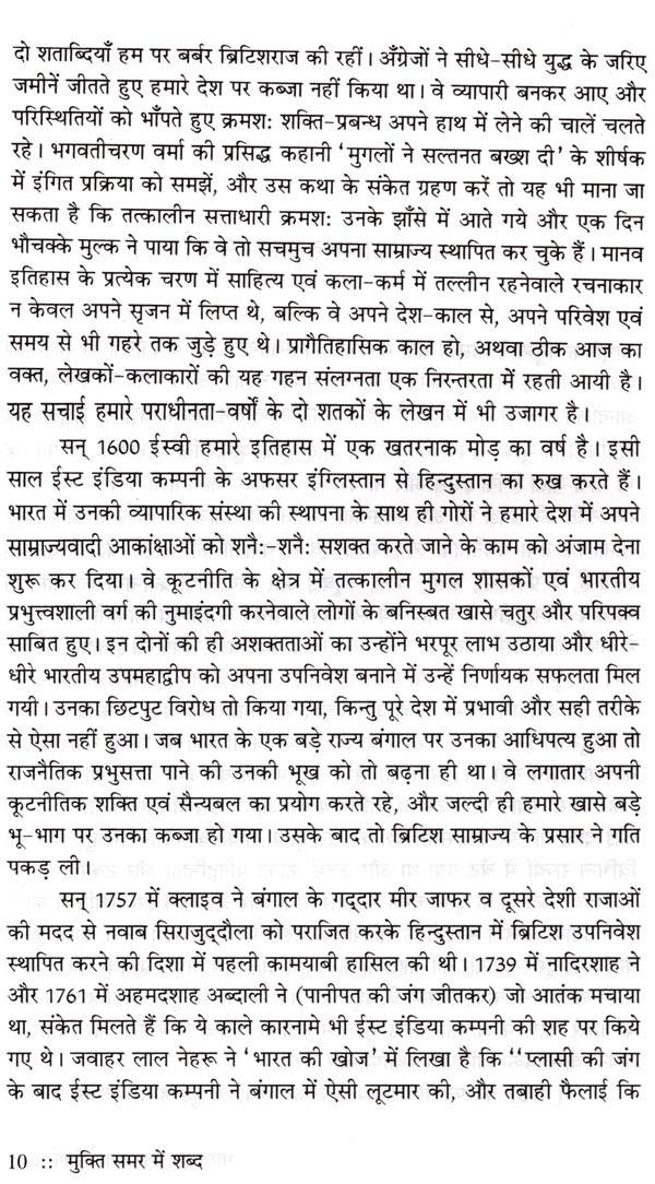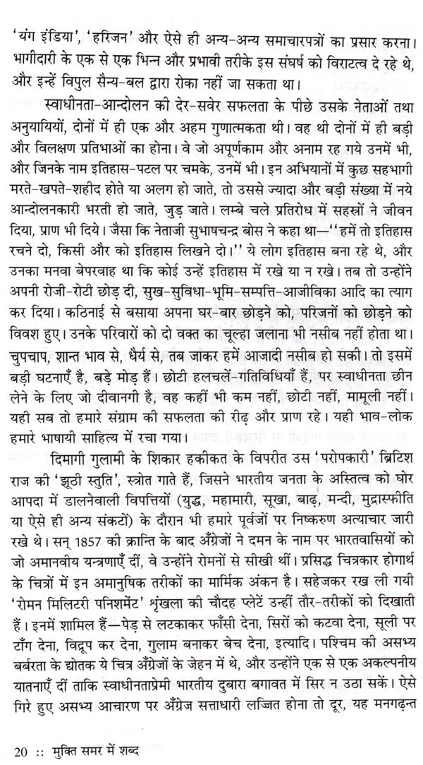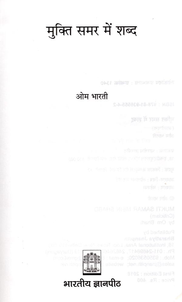 बीसवीं शताब्दी में व्यक्ति स्वातंत्र्य के लिए जो भी जनसंघर्ष हुए, उनमें अठारह सौ सत्तावन के स्वतंत्रता-संग्राम का महत्त्व सर्वोपरि है। हम इसे भारत की जनता का पहला 'मुक्ति समर' कह सकते हैं। आगे चलकर भारत में ही नहीं, विदेशी धरती पर होने वाले स्वाधीनता आन्दोलनों ने भी 1857 की इस विफल जन क्रान्ति से सवक लिया। एक ओर भारतीय जन समुदाय ने स्वतंत्रता संग्राम का वृहद संचालन किया तो दूसरी ओर भारतीय लेखकों, बुद्धिजीवियों और कलाकारों ने अपनी कृतियों के माध्यम से इस 'मुक्ति समर' को आन्दोलित किए रखा, जिसकी अनुगूँज केवल भारतीय गद्य व पद्य साहित्य में ही नहीं, भारतीय लोक साहित्य में भी स्पष्ट सुनाई देती है। ओम भारती की पुस्तक 'मुक्ति समर में शब्द' इस भाव की साकार अभिव्यक्ति है। इसमें इतिहास, समाज और जन-मानस का समुच्चय आजादी की लड़ाई के दौरान प्रभावशाली ढंग से लक्षित है। इसमें लिखा गया एक नहीं, अनेक भाषाओं में रचित कथा साहित्य है, जिससे पूरे भारत का वास्तविक मानचित्र समवेत स्वर में चित्रित होता है, जो भारतीय अस्मिता और उसके जीवन मूल्यों व संघर्षों के रंगों से अनुप्राणित है। विश्वास है कि इस पुस्तक के अध्ययन से पाठक कथा-सर्जना में समाहित' मुक्ति स्वर' का आह्लाद और सृजन की आकुलता को गहराई से समझ पाएँगे।