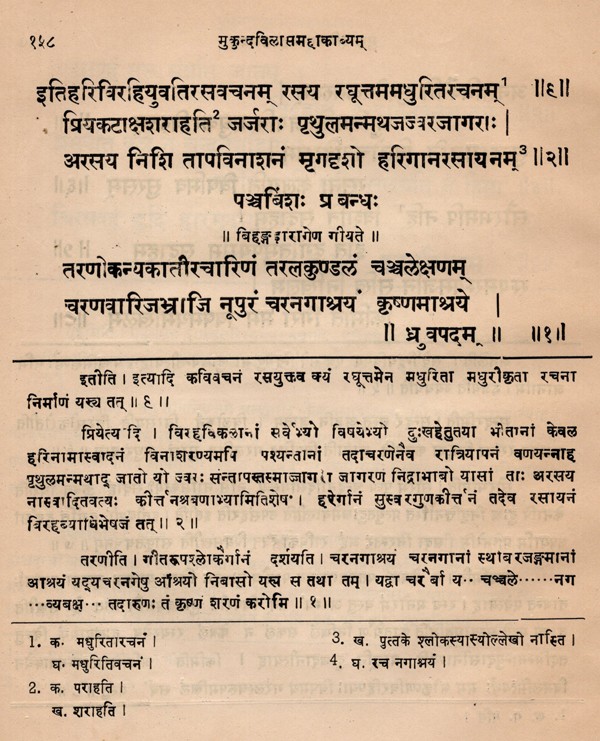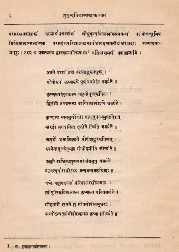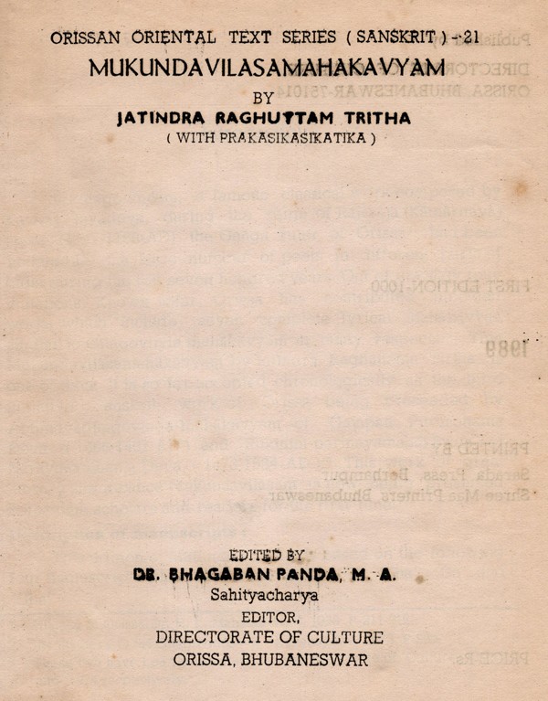 Śrīgītagovindam, a famous classical work composed by Kaviraj Jayadeva, during the reign of Rajaraja (Kämärnava) Deva (1147-1156-AD) the Ganga ruler of Orissa, had been imitated by the large number of poets in different parts of India during the last seven hundred years. Out of the sixty four imitations, Known sofar, Orissa has coutributed nineteen works which include seven complete lyrical Mahakavyas similar to Gitagovinda mahākāvyam in many respects. This Mukundavilāsamahākāvyam by Jatindra Raghüttama Tirtha, is one of them. It is so far accepted chronologically as the third imitative Sanskrit work of Orissa being preceeded by Abhinavagitagovinda-mahākāvyam of Gajapati Purusottama Deva (1466-1497-AD) and Rukmini-parinayamahākāvam of Nārāyaņa Bhanja Deva (1473-1534-AD)." This work of great literary significance Mukundavilāsam is now being presented before the scholars and readers for the first time.