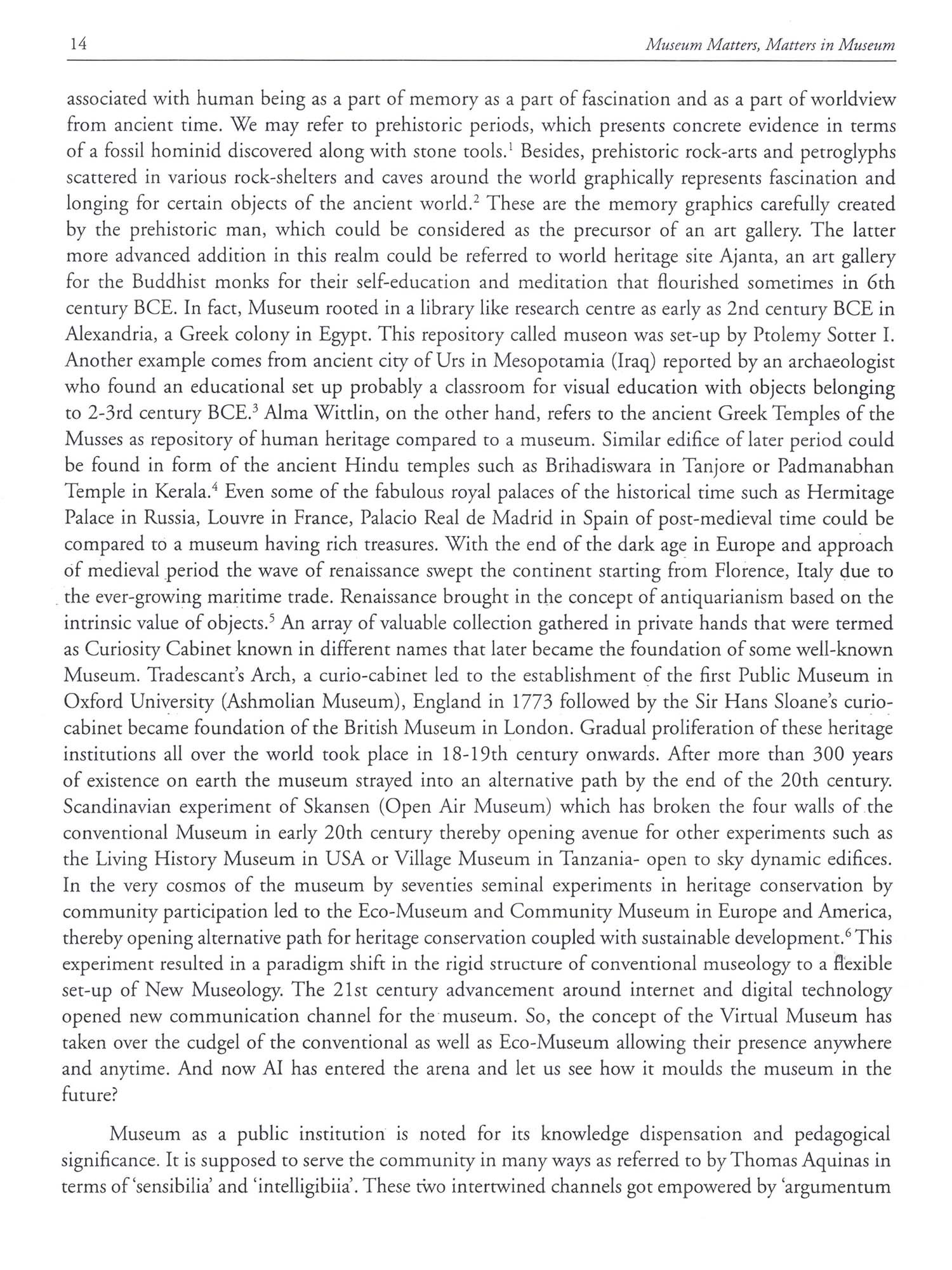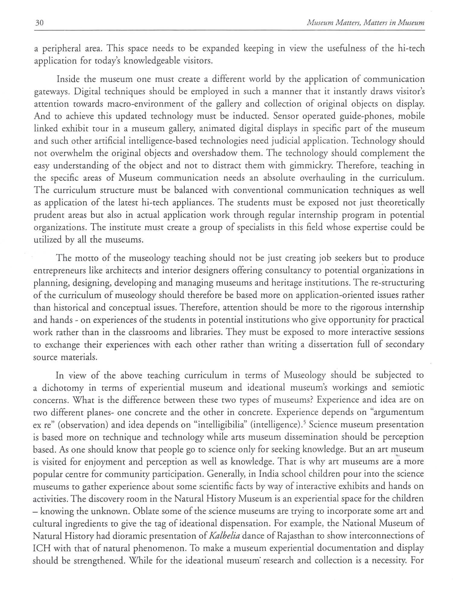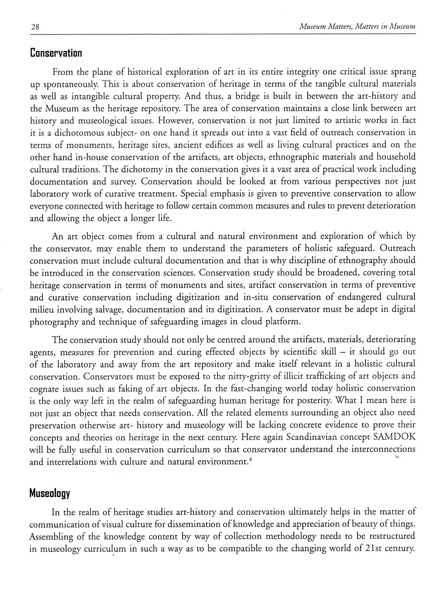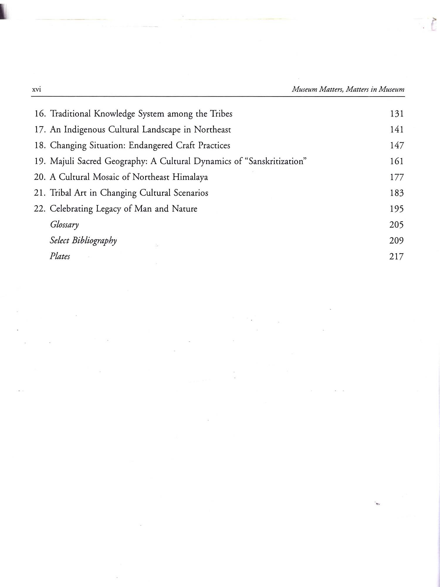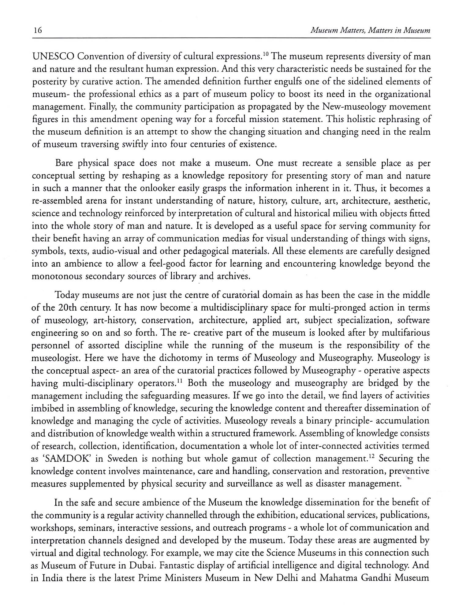 It is an honour for me to write a preface for the volume entitled "Museum Matters, Matters in Museum" by Prof. (Dr) A. K. Das who was my professor at the National Museum Institute, New Delhi (now called Indian Institute of Heritage). In fact, I feel it humble when he asked me to write this preface. I am indebted to him in many ways and that is why I am not writing the preface of this book as an expert in museology but to express my deep respect and also to lower the burden of indebtedness. Prof Das not only taught us museology dealing with the theoretical issues but abe compulsorily involved us in the critical operational aspects of the institution of museum. My sincere thanks to him for giving me this opportunity to express my gratitude One thing which is very important to mention here is that in this volume he tries to bring forth some latest development in the field. These issues are currently discussed in various national and international forums. From the latest references cited by him reveals the criticality of the study and research in the field of museum and cultural heritage. This volume is divided into two parts (1) Museum Matters and (II) Matters in Museum explores as to how museums came up with multiple new issues in which museologist all over the world racking their brain and wit. And at the same time the question of survival of the traditional cultural materials in their respective habitat which are facing onslaught of time have been dealt with deep understanding. The interface of museology and cultural heritage is the main plank of this work. The first part of the book brings forth certain critical contemporary issues such as Al induction in museum communication system, evaluation as a part of museum marketing research, the dichotomy of ideational and experiential museum in communication, community and social empowerment through museum toolkit, the contemporary need for teaching of museum related disciplines in view of the changing situation and deconstruction of heritage and social curation etc are scanned thoroughly in the first part of the book. All the critical areas of museology have been redefined and reconstructed in this treatise. I am sure this will open further avenue in museological research and thereby restructuring museums functional format in near future. The second part of the volume deals with cultural heritage as well cultural landscape in the hanging situation of the rural habitat of the country. Here certain less explored areas such as the musical instruments and its intangible cultural legacy, weaving tradition of folk and tribal apparels, assorted craft traditions and its question of continuity, endangered cultural landscape of eastern Himalaya and its vanishing cultural properties, little known cultural history of the north-east India and celebration of heritage have been delved taking into consideration the immaterial aspect of cultural heritage within the realm of conservation and safeguard. One of the paper deals with the folk art in transition from intangible to tangible as a market strategy and how it portrays bizarre social life in a changing urban situation. This part deals with matters in museum which calls for immediate attention of the museologists due to the impact of modernization. These matters in the realm of heritage conservation have repercussion for the future functioning of the museum and its sustainable development. The museological aspects covered in this work are significant because the knowledge domain today is saturated with user friendly communication medias which ensures easy access, quick retrieval, and availability at one place at one time. In fact, the virtual cosmos is posing challenge to the relevance of he museum as a community hub and that is why functional metamorphosis of this heritage institution a must at this critical time. This volume will be the inspiration to infuse necessary synergy in the Fallenging task of the museologist and others dealing with heritage.