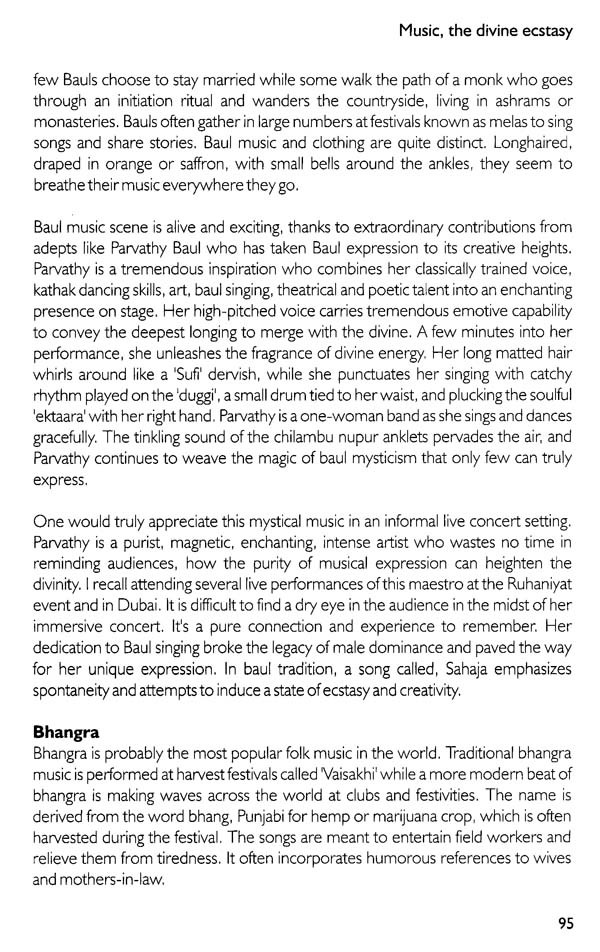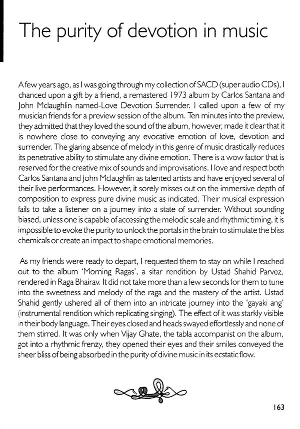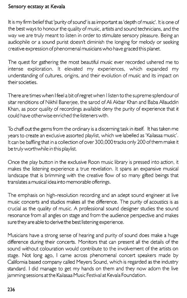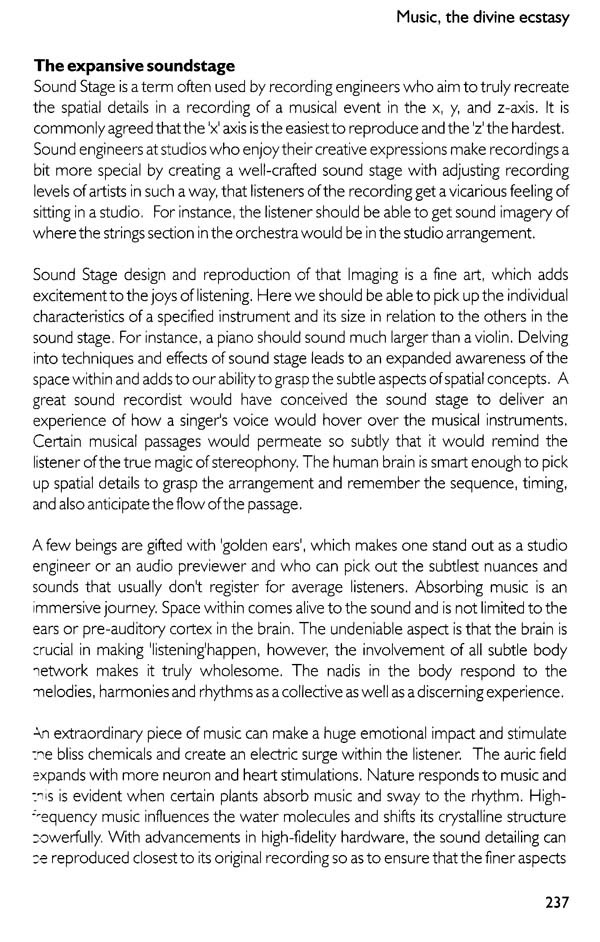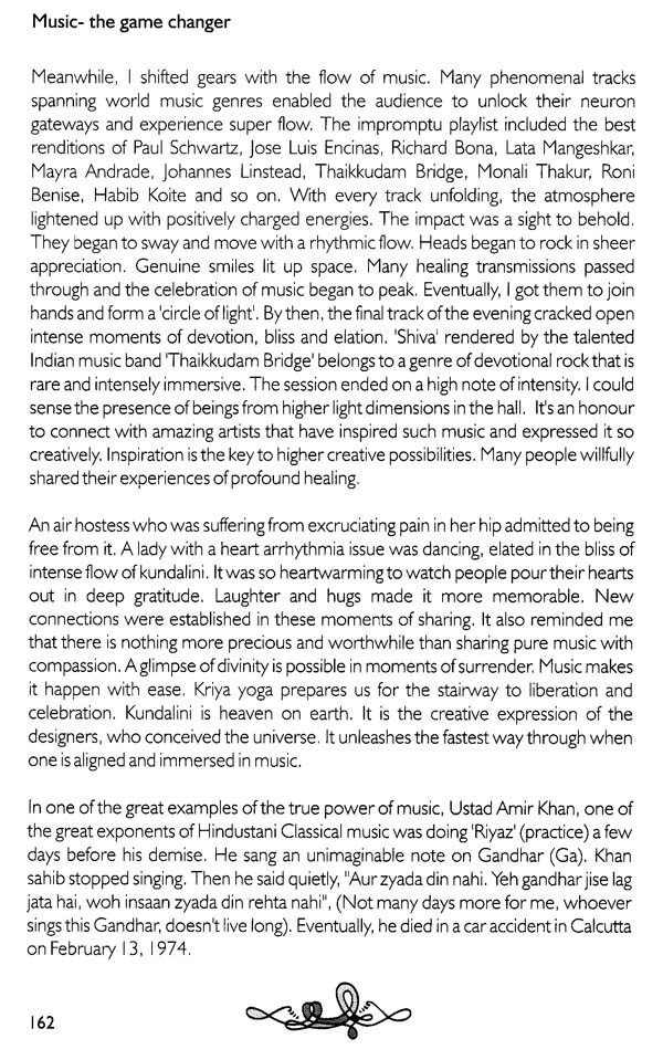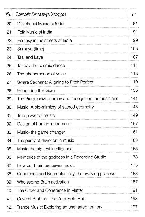 If any of us has ever experienced a sense of 'Magic', it is undoubtedly the purity of 'creative intelligence' that is passing through us and if it is yet to cast its spell, to reveal its celebration, magnetism, flow or bliss, in order to lead us to liberation, we need to ask ourselves, what is it that is missing? Music is most often relegated as quite simply a means of entertainment, to keep us going in a serious and mundane project of life that is confined to acquiring and consuming resources to please our ego-self. We need to remind ourselves with the words of Friedrich Nietzsche "Without music, life would be a mistake." The Universe is a creative expression in flow. We are meant to experience and express it's divine nature. It is indeed a blessing to be able to get a glimpse of the larger picture and view life from the Creator's angle. Our Earth is a significant blue dot where we are projecting and enacting our role-play. We are passing through a beam of projected light permeating this earth. We are Gods in deep amnesia. Most of us have been deluded from our true nature. We are under a spell of a fragmented ego journey. The simplest reminder is that divine calling can happen through music that magnetizes us. It is the language of the cosmic masters which we can apply to access the creative intelligence. This book offers a peek into profound ways and experiences of yogis, mystics and musical maestros, and explorative journey on ways to purify our body and receptors so that we can truly absorb music as a master key to unlock our divine ecstatic state. The wise have cracked open exciting ways to access purified states of alignment and heightened bliss and ecstasy. We often need to be reminded that life is meant to be an eternal celebration. Most of us have stiffened up in our routine suffering and survival mode. The mantra for our elevation is to let go of our rigidity and "let godliness in" so that we can truly celebrate our presence and essence of this natural paradise that offers us abundance. It is imperative that we have to make an effort to fine tune our intent and actions and attune ourselves to absorb the best of the design. All this may sound esoteric, idealistic and utopian in its concept. However, if we tap into the creative intelligence flowing through all of us, we will find ways to crack open that elusive DNA code within and access the original blueprint, and discover the rare ability to extract the true essence of our existence.