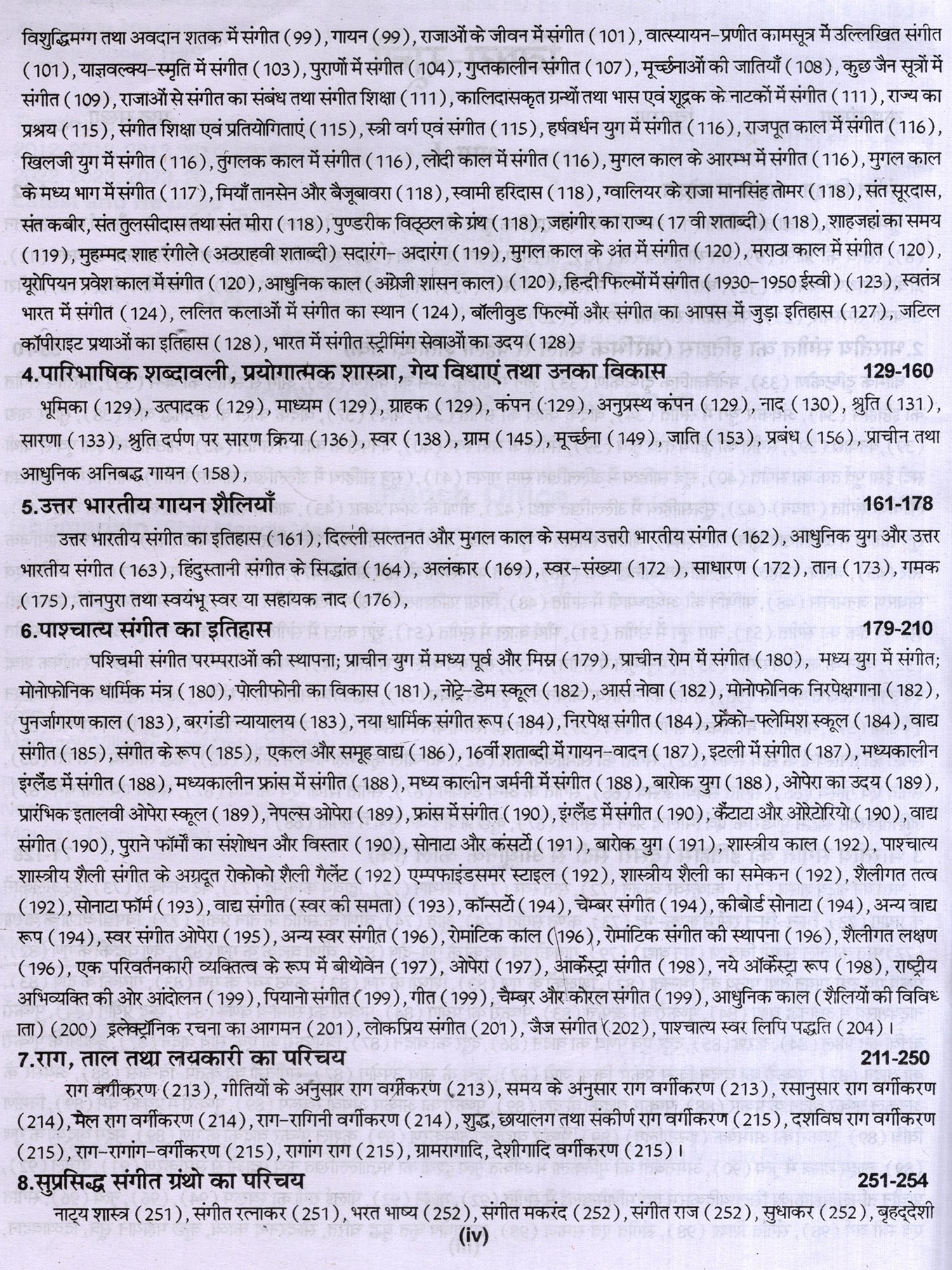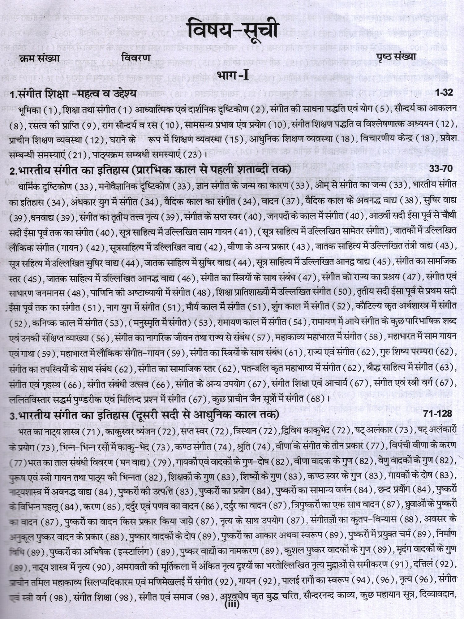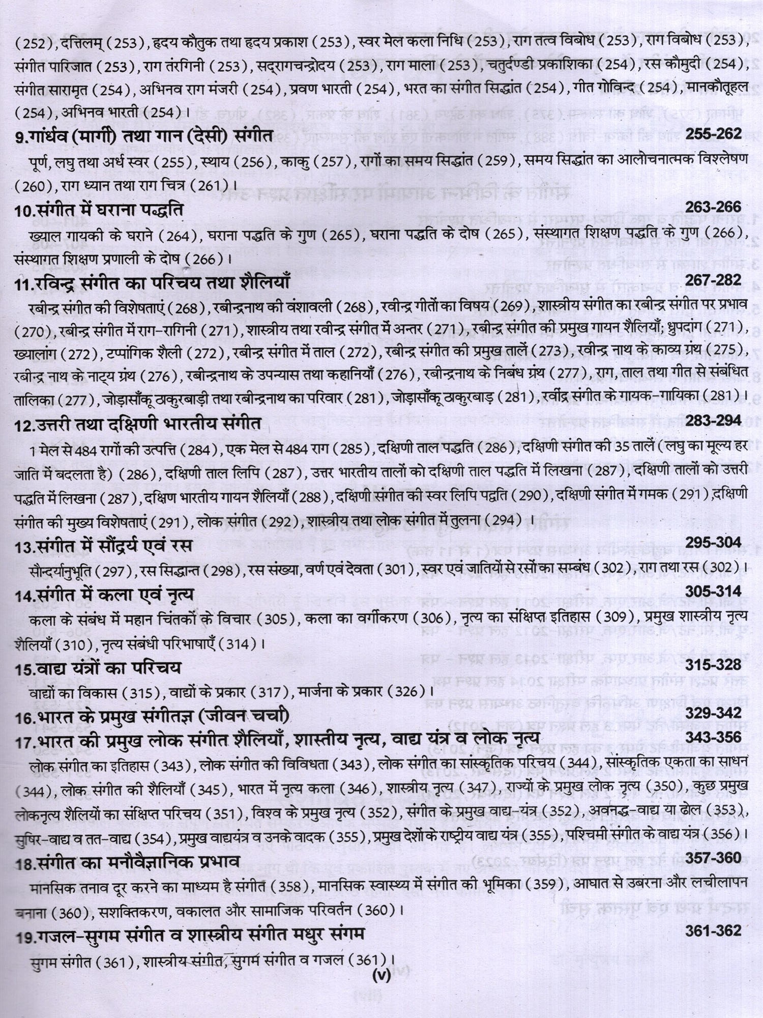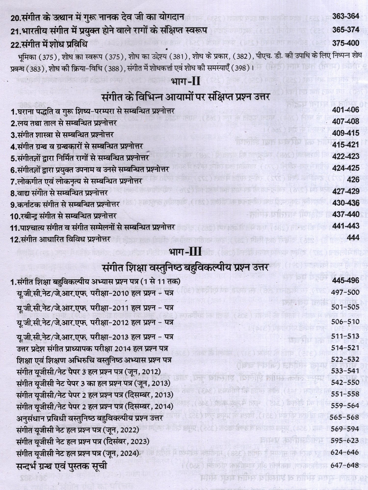 संगीत में शोध से संबंधित वर्णन तथा सौन्दर्य, रस आदि का वर्णन भी दिया गया है। लोक संगीत, नृत्य आदि का भी उल्लेख किया गया है। अनेक शास्त्रकारों, गायकों, वादकों, नृत्यकारों आदि का परिचय संक्षिप्त रूप से वर्णित किया गया है। पुस्तक के सबसे महत्वपूर्ण खंड में 3000 बहुविकल्पीय तथा लघु उदर वस्तुनिष्ठ प्रश्न हैं। जिनका लाभ परीक्षार्थियों को अवश्य होगा। विद्वानों से अनुरोध 1 है कि इस पुस्तक में पाई जाने वाली त्रुटियों को बताएं ताकि आगमी संस्करण में उन्हें दूर किया जा सके। इस पुस्तक को लिखने में मेरे माता-पिता तथा गुरूजन केवल प्रेरणा का स्रोत ही नहीं रहे बल्कि उनसे मुझे महत्वपूर्ण मार्गदर्शन भी मिला। उनके इस सहयोग के लिए मैं उनका सदैव हो ऋणी रहूंगा। इसके अतिरिक्त मैं अपनी पत्नी तथा छोटे भाई, उन दोनों के सक्रिय योगदान के लिए भी आभारी हूँ।