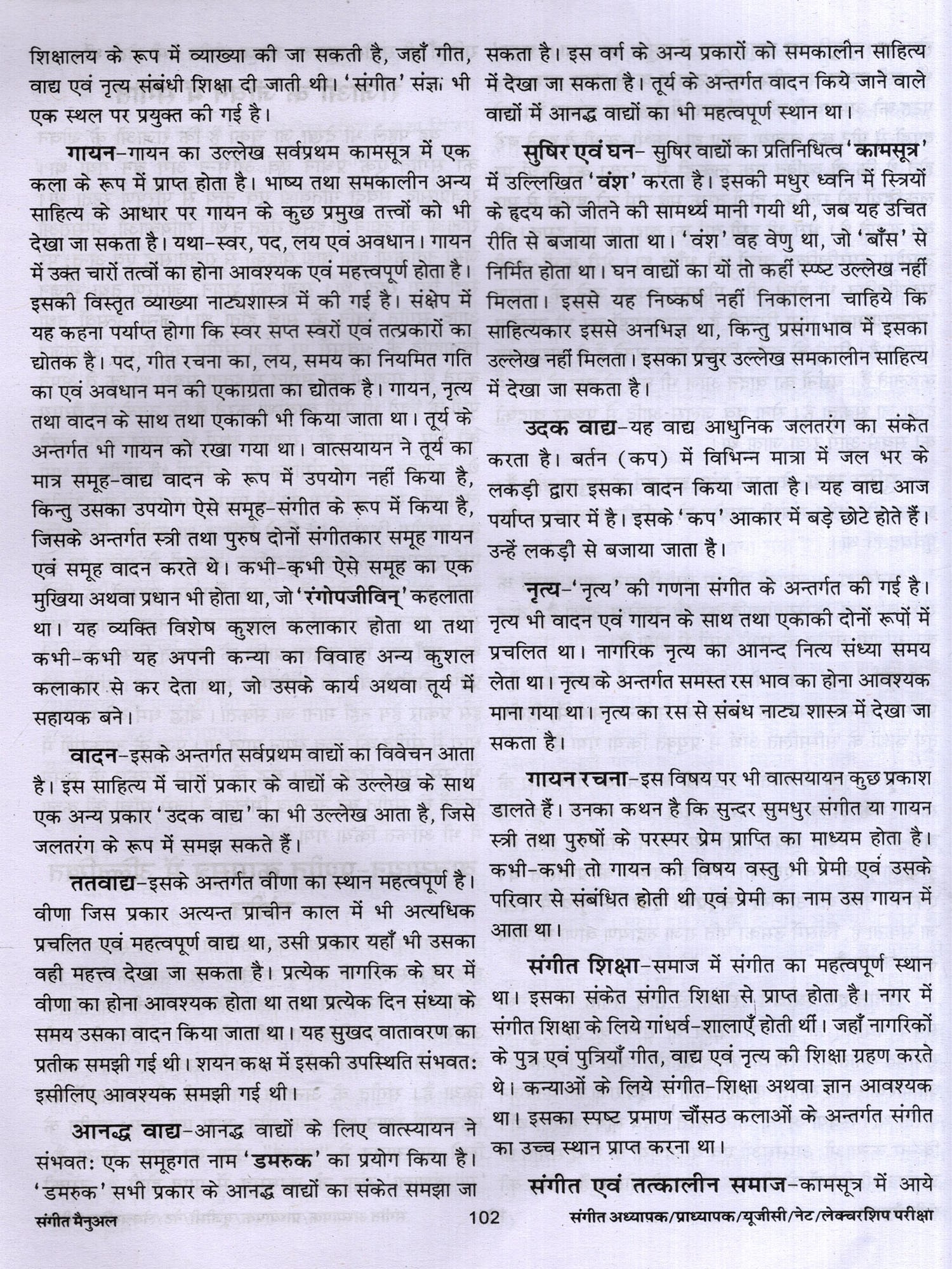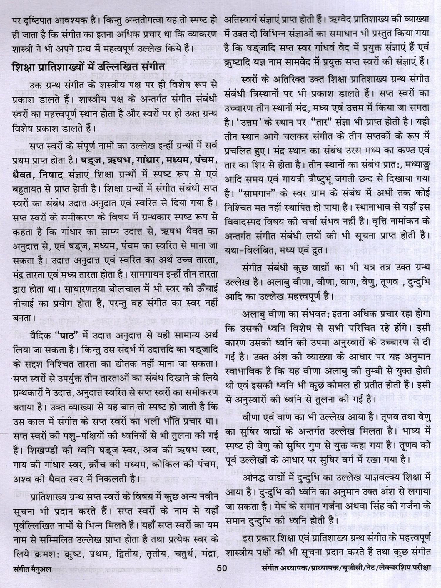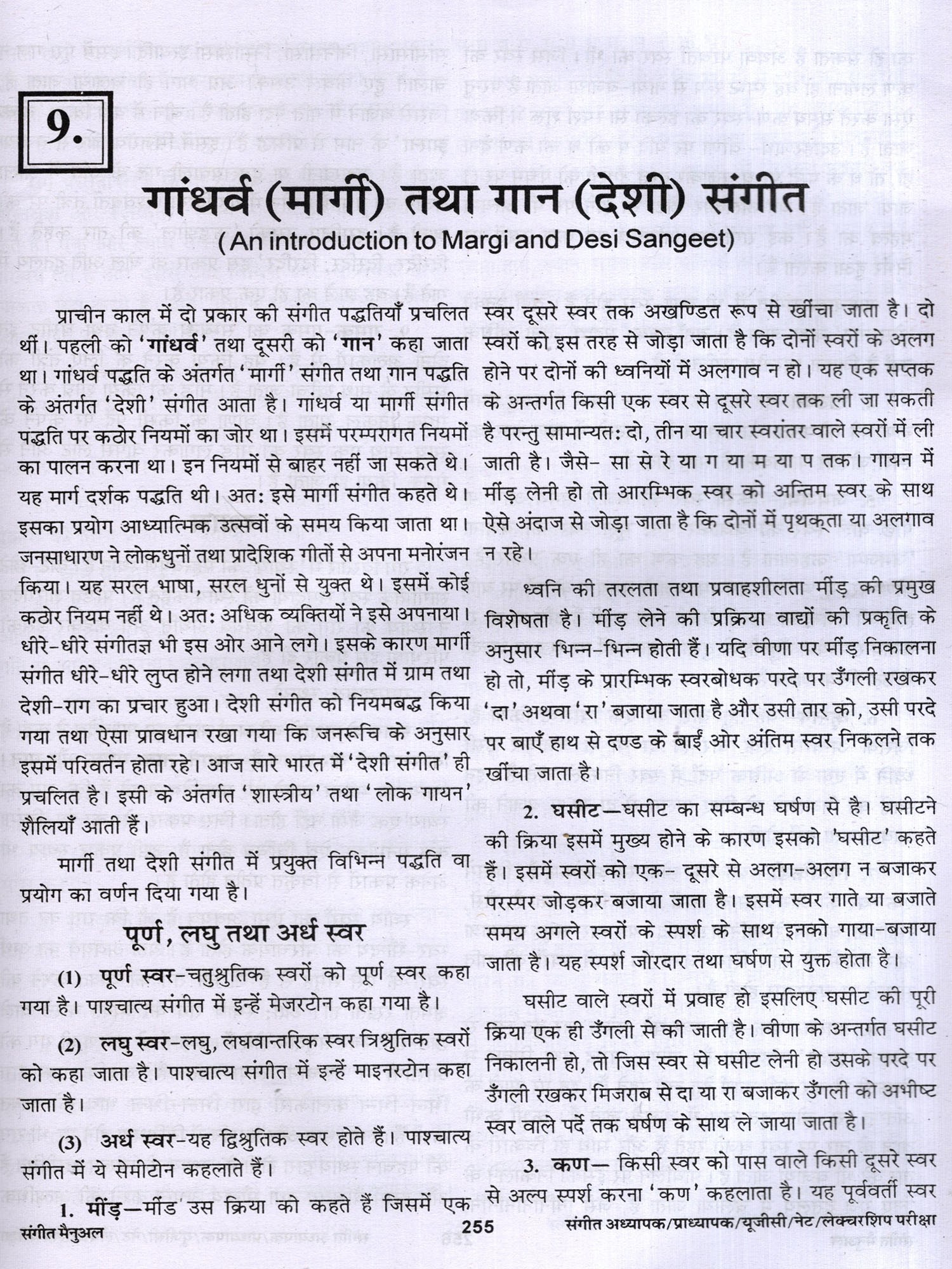 संगीत में शोध से संबंधित वर्णन तथा सौन्दर्य, रस आदि का वर्णन भी दिया गया है। लोक संगीत, नृत्य आदि का भी उल्लेख किया गया है। अनेक शास्त्रकारों, गायकों, वादकों, नृत्यकारों आदि का परिचय संक्षिप्त रूप से वर्णित किया गया है। पुस्तक के सबसे महत्वपूर्ण खंड में 3000 बहुविकल्पीय तथा लघु उदर वस्तुनिष्ठ प्रश्न हैं। जिनका लाभ परीक्षार्थियों को अवश्य होगा। विद्वानों से अनुरोध 1 है कि इस पुस्तक में पाई जाने वाली त्रुटियों को बताएं ताकि आगमी संस्करण में उन्हें दूर किया जा सके। इस पुस्तक को लिखने में मेरे माता-पिता तथा गुरूजन केवल प्रेरणा का स्रोत ही नहीं रहे बल्कि उनसे मुझे महत्वपूर्ण मार्गदर्शन भी मिला। उनके इस सहयोग के लिए मैं उनका सदैव हो ऋणी रहूंगा। इसके अतिरिक्त मैं अपनी पत्नी तथा छोटे भाई, उन दोनों के सक्रिय योगदान के लिए भी आभारी हूँ।