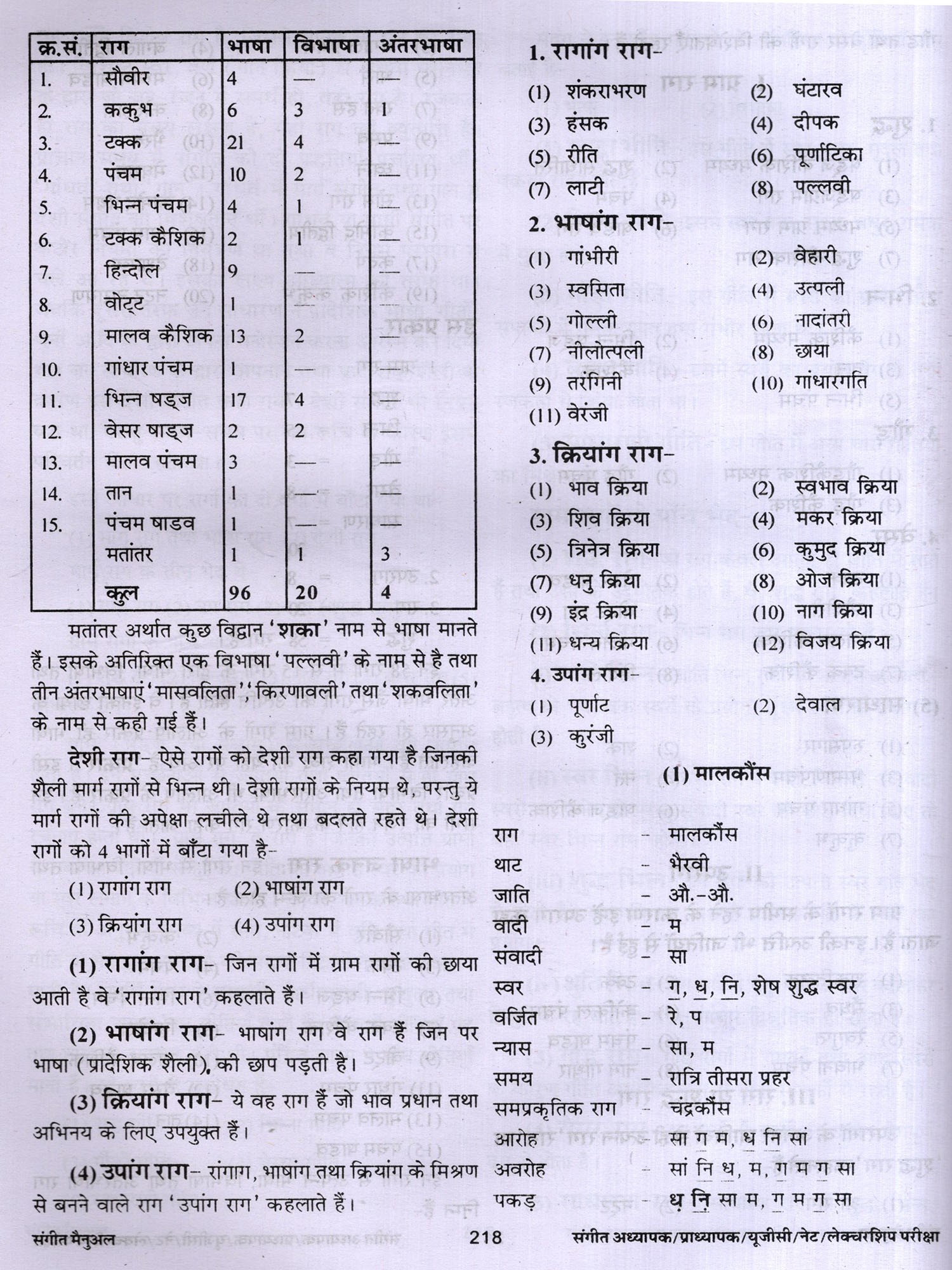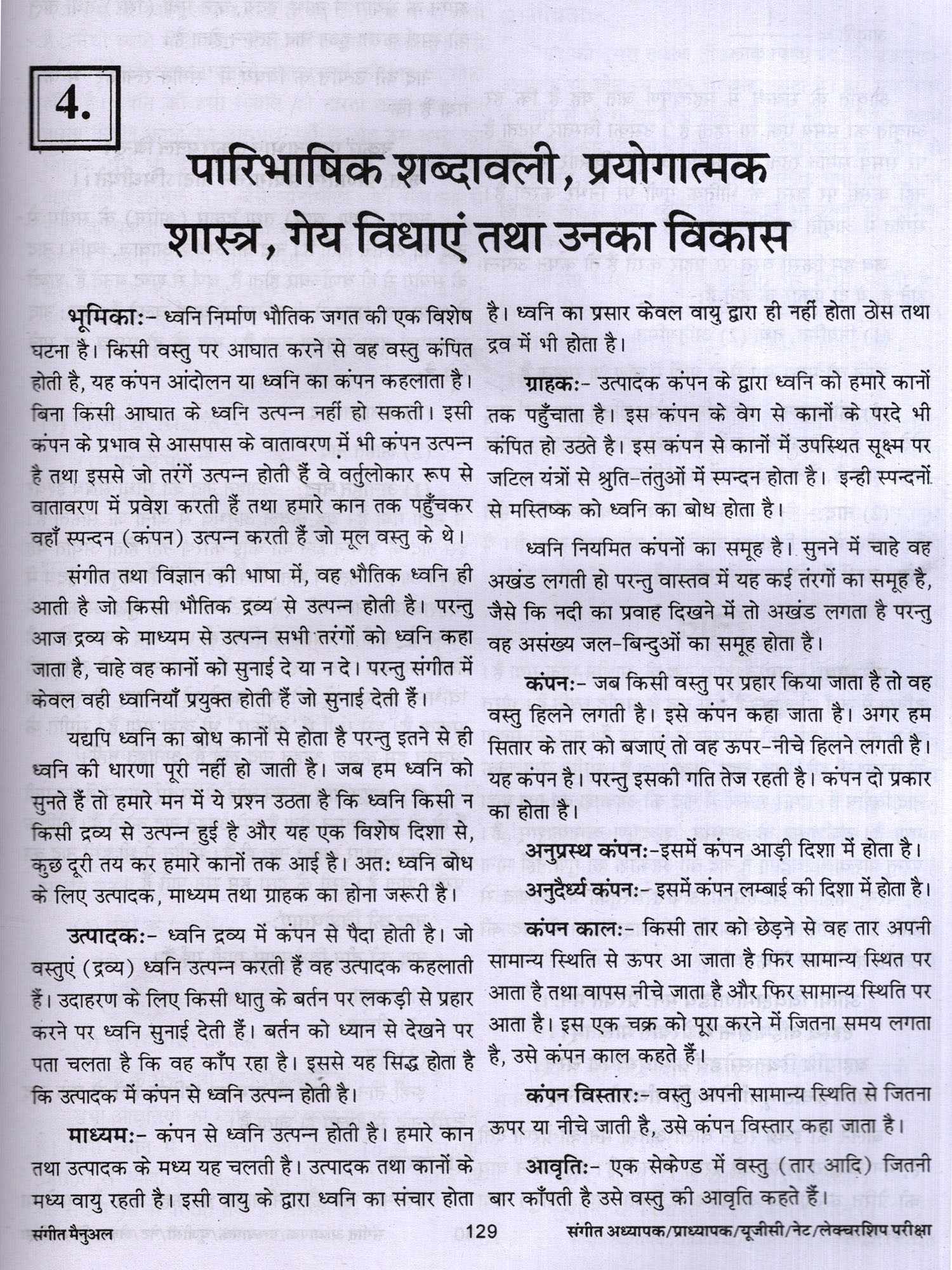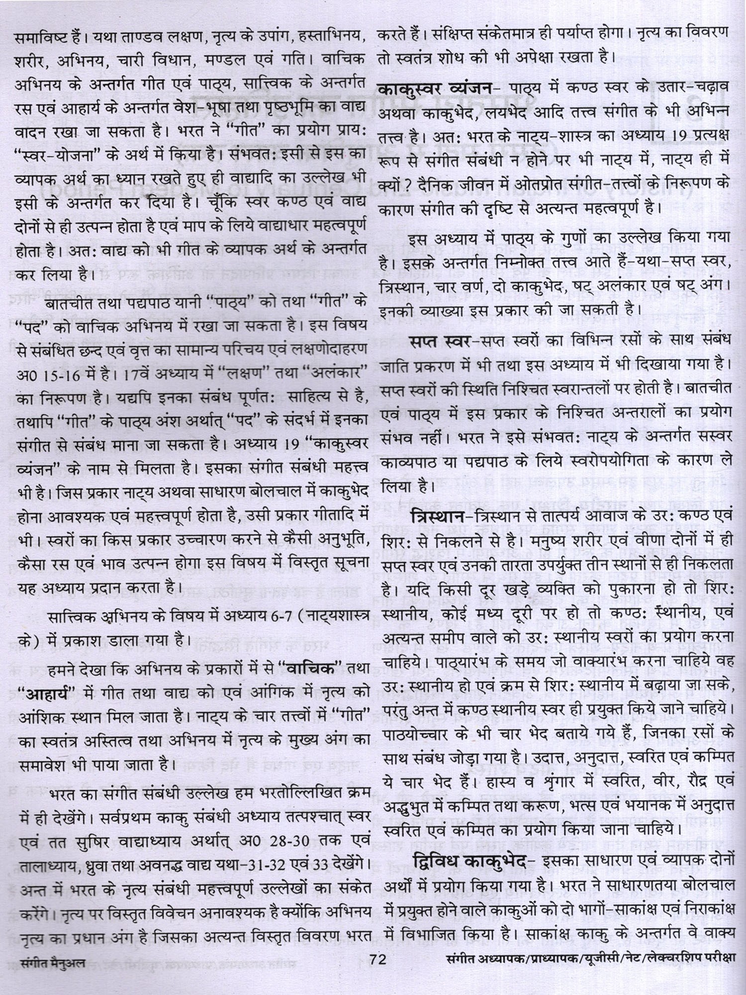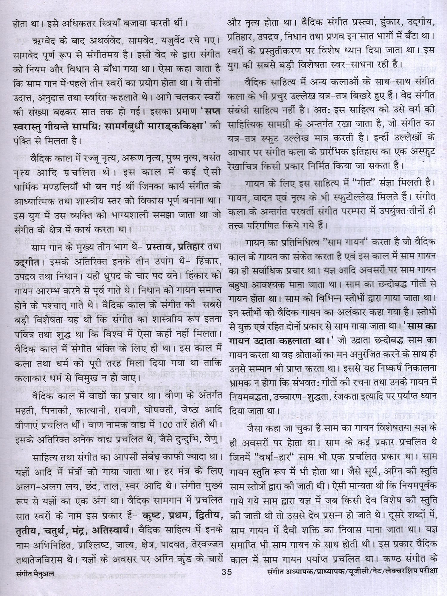 संगीत में शोध से संबंधित वर्णन तथा सौन्दर्य, रस आदि का वर्णन भी दिया गया है। लोक संगीत, नृत्य आदि का भी उल्लेख किया गया है। अनेक शास्त्रकारों, गायकों, वादकों, नृत्यकारों आदि का परिचय संक्षिप्त रूप से वर्णित किया गया है। पुस्तक के सबसे महत्वपूर्ण खंड में 3000 बहुविकल्पीय तथा लघु उदर वस्तुनिष्ठ प्रश्न हैं। जिनका लाभ परीक्षार्थियों को अवश्य होगा। विद्वानों से अनुरोध 1 है कि इस पुस्तक में पाई जाने वाली त्रुटियों को बताएं ताकि आगमी संस्करण में उन्हें दूर किया जा सके। इस पुस्तक को लिखने में मेरे माता-पिता तथा गुरूजन केवल प्रेरणा का स्रोत ही नहीं रहे बल्कि उनसे मुझे महत्वपूर्ण मार्गदर्शन भी मिला। उनके इस सहयोग के लिए मैं उनका सदैव हो ऋणी रहूंगा। इसके अतिरिक्त मैं अपनी पत्नी तथा छोटे भाई, उन दोनों के सक्रिय योगदान के लिए भी आभारी हूँ।