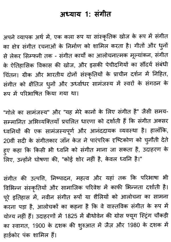 संगीत, जिसे एक कला रूप और सांस्कृतिक गतिविधि दोनों के रूप में मान्यता प्राप्त है, समय के आयाम में सावधानीपूर्वक व्यवस्थित ध्वनि के माध्यम से खुद को प्रकट करता है। संगीत की मौलिक परिभाषाओं में पिच जैसे प्रमुख तत्व शामिल हैं। माधुर्य और सामंजस्य के क्षेत्रों को नियंत्रित करना, गति, मीटर और अभिव्यक्ति की संबंधित अवधारणाओं के साथ लय, तीव्रता और कोमलता में भिन्नता को निर्धारित करने वाली गतिशीलता के साथ-साथ समय और बनावट के ध्वनि गुणों को अक्सर संगीतमय ध्वनि के "रंग" के रूप में जाना जाता है। विविध संगीत शैलियाँ या शैलियाँ इस व्यापक ढांचे के भीतर कुछ तत्वों को बढ़ा सकती हैं, कम महत्व दे सकती हैं या यहां तक कि कुछ तत्वों को हटा भी सकती हैं। संगीत पारंपरिक गायन से लेकर समकालीन रैपिंग तक फैले वाद्ययंत्रों और गायन तकनीकों के माध्यम से प्रकट होता है। इसमें ऐसी रचनाएँ शामिल हैं जो पूरी तरह से वाद्य हैं, वे जिनमें केवल स्वर शामिल हैं (जैसे कि कैपेला टुकड़े), और वे जो गायन और वाद्य संगत दोनों को सहजता से एकीकृत करते हैं।