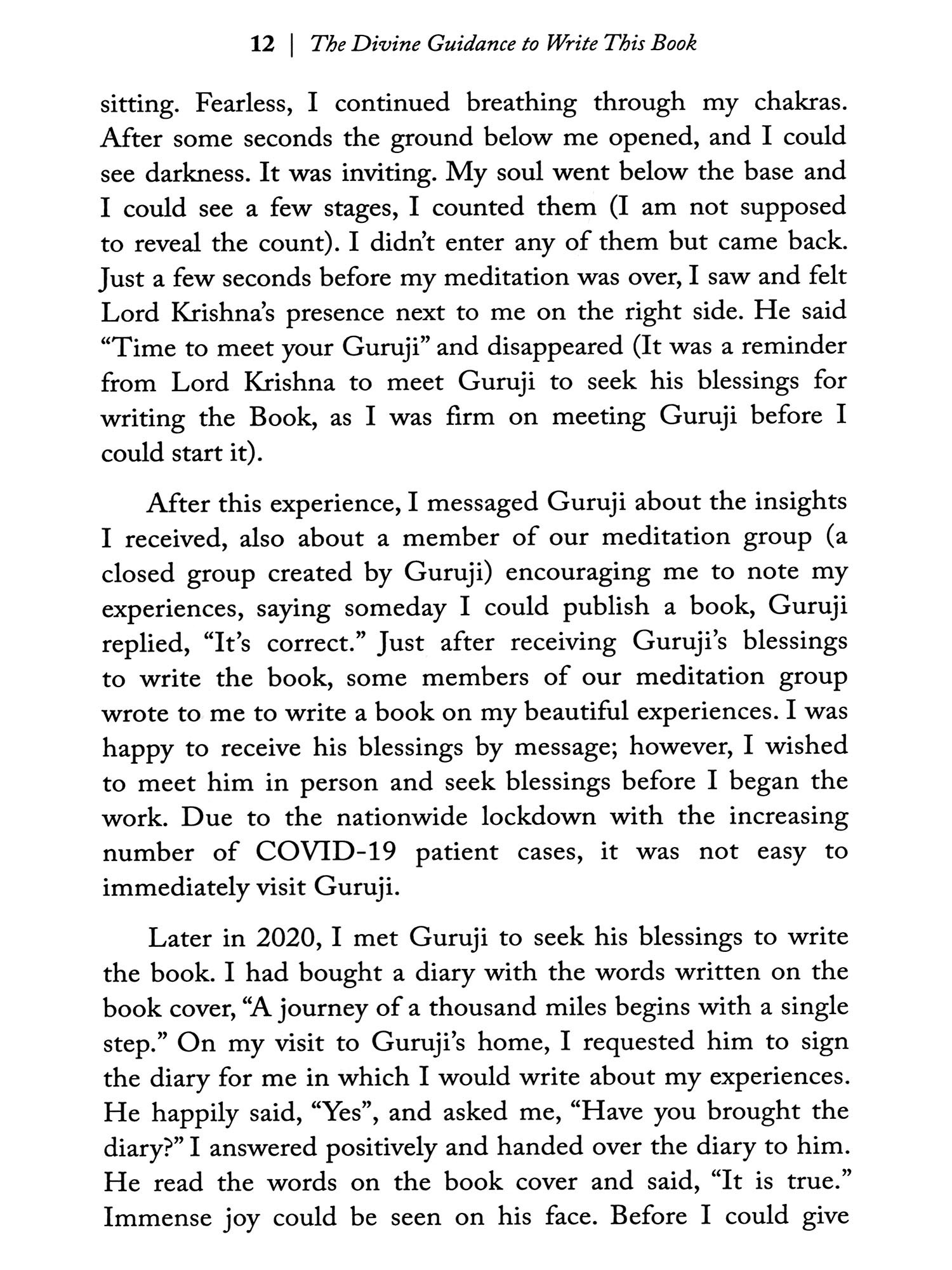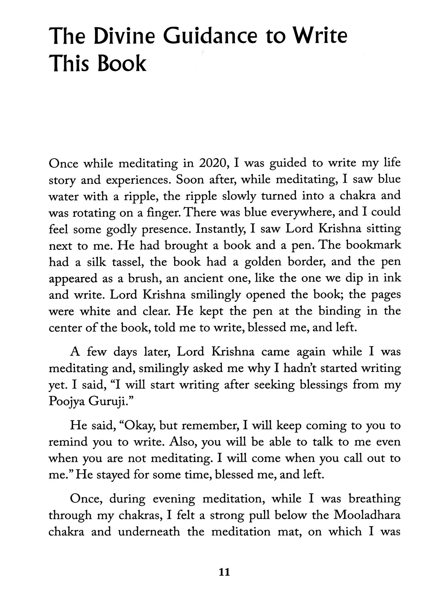 I was guided to write this book, and I wrote it by sharing what I have been guided to share. I was shown in meditation how the book's front cover should look. It was in different shades of blue, like waves of the sea in layers, from deep blue at the top, becoming lighter in shade towards the bottom. I was shown two names for the title of the book. I chose, "My Experiences With The Ultimate Truth About Kundalini."