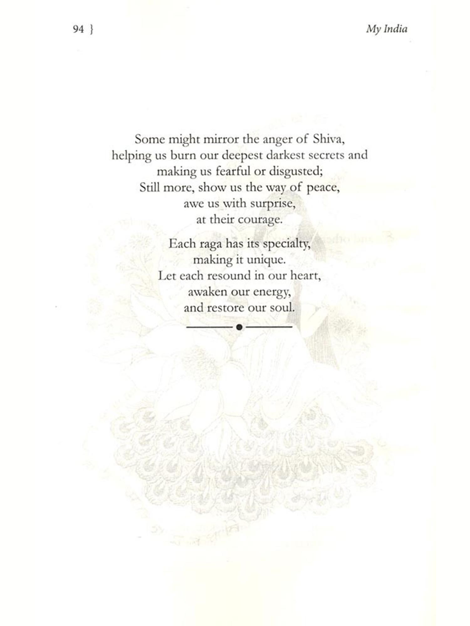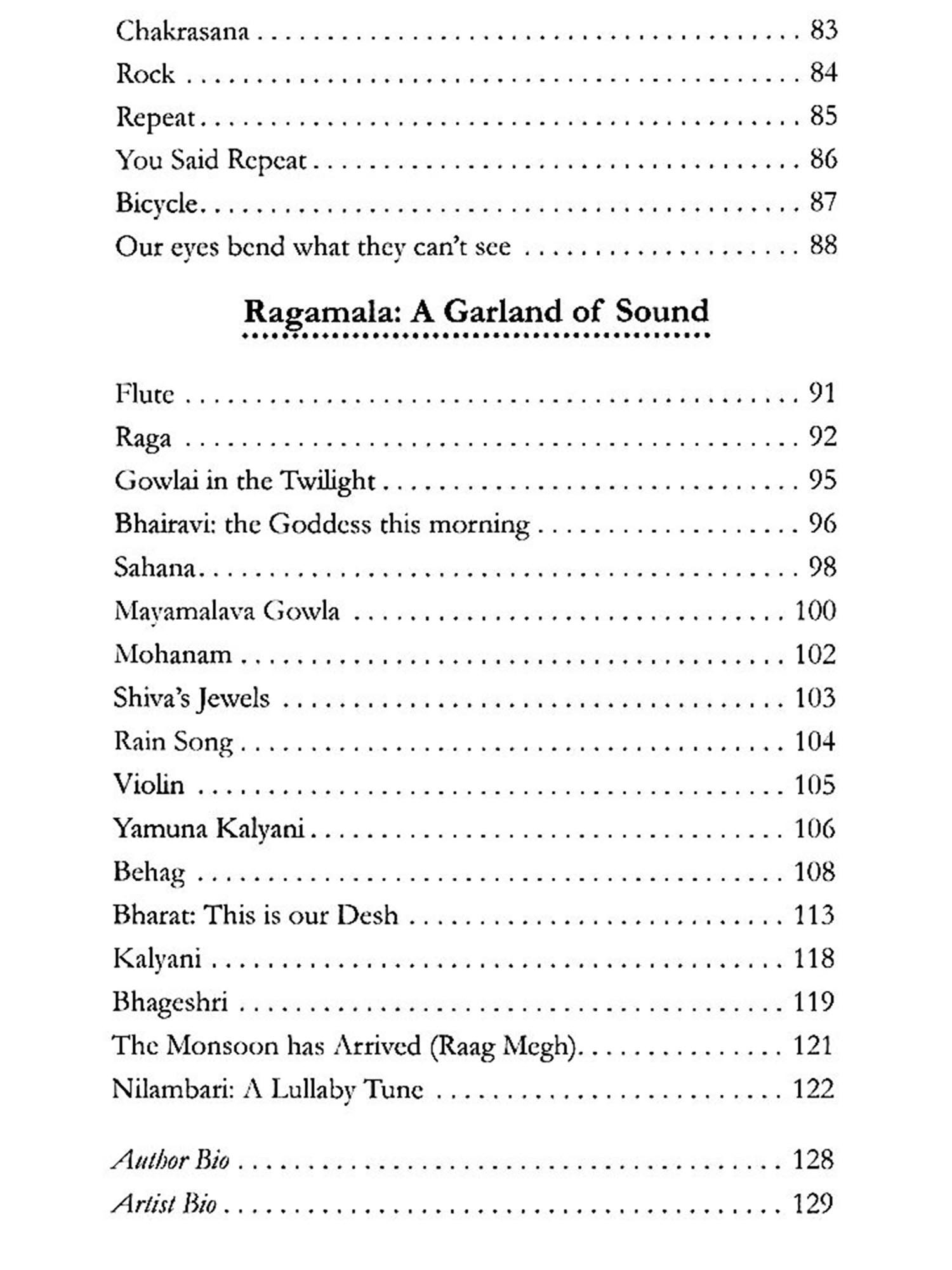 Ragamala: A Garland of Sound is an ode to Indian music. The poems in this section explore individual ragas, the essence of raga as an art form, and the instruments that bring them to life. Inspired by my musical background, this chapter reflects how I experience and connect with the rich tradition of Indian classical music.