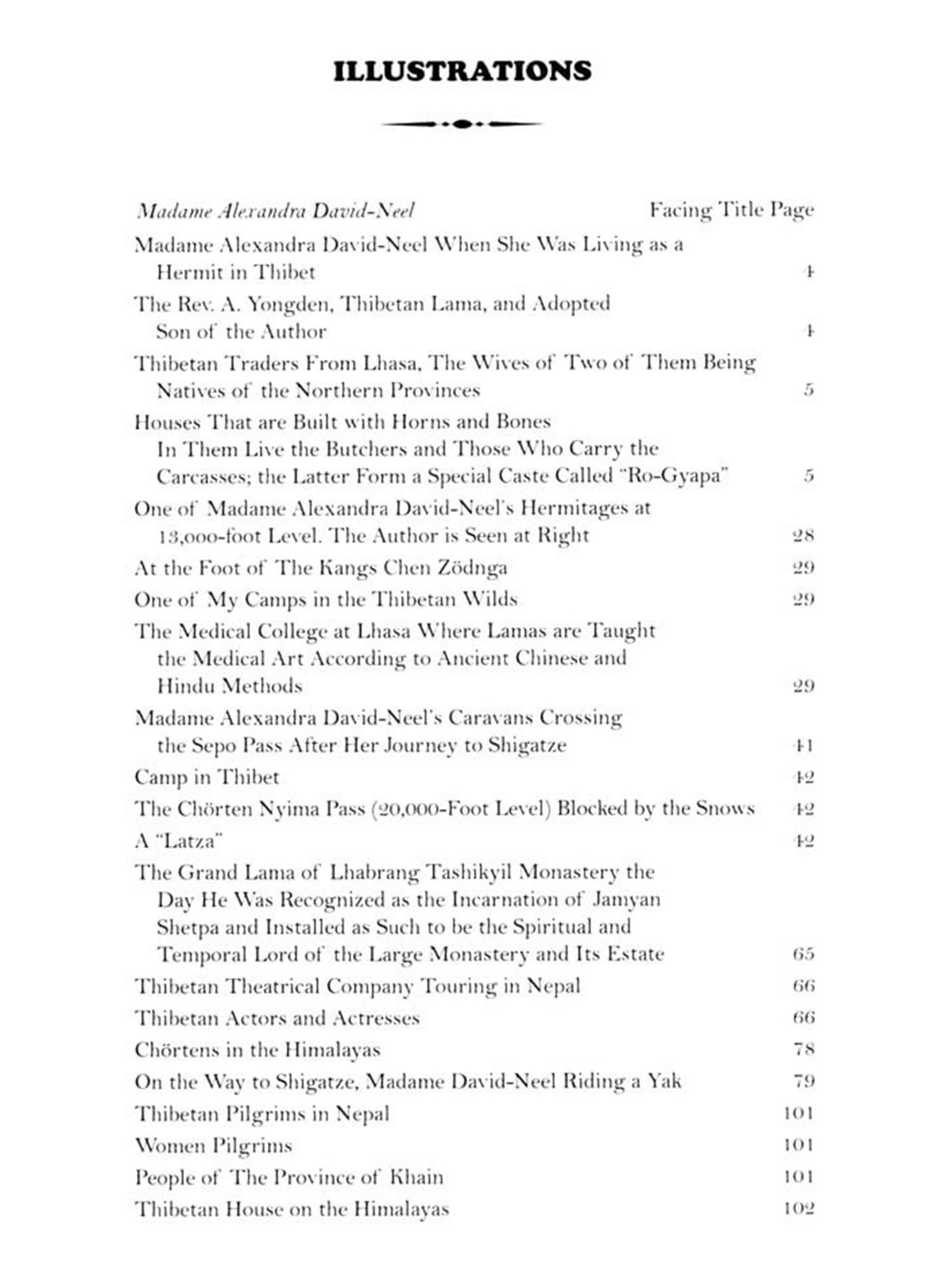 Around the monk-sovereign, I found a strange royal household of clerical personages, clad in shining yellow satin, dark-red cloth, and gold brocade, who related fantastic stories and; spoke of a wonderland. Although when listening to them I wisely made a liberal allowance for legend and exaggeration, I instinctively felt that behind those dark wooded hills which I saw before me, and the huge snowy peaks which pointed their lofty heads beyond them, there was, truly, a land different from all others. Needless to say, my heart leaped with the desire to enter it! It was in June of the year 1912 that I had my first glimpse of Thibet. The path which I had preferred to the road most usually taken starts from a low point in Sikkim, amid tropical vegetation, wild orchids, and the living fireworks of fireflies. Gradually, as one climbs, the scenery changes, nature becomes severe, the singing of birds and the noisy buzzing of insects subside. The huge trees, in their turn, are unable to struggle in the rarefied air of the summits. With each mile the forest becomes more stunted, till the shrubs are reduced to the size of dwarfs creeping on the ground, while still higher up they cannot even continue to exist. The traveller is left amidst rocks richly embroidered with brightly coloured lichens, cold water falls, half frozen lakes and giant glaciers. Then from the Sepo pass one suddenly discovers the immensity of the trans-Himalayan tableland of Thibet, with its distant horizon of peaks bathed in strange mauve and orange hues, and carrying queerly shaped caps of snow upon their mighty heads What an unforgettable vision! I was at last in the calm solitudes of which I had dreamed since my infancy. I felt as if I had come home after a tiring, cheerless pilgrimage.