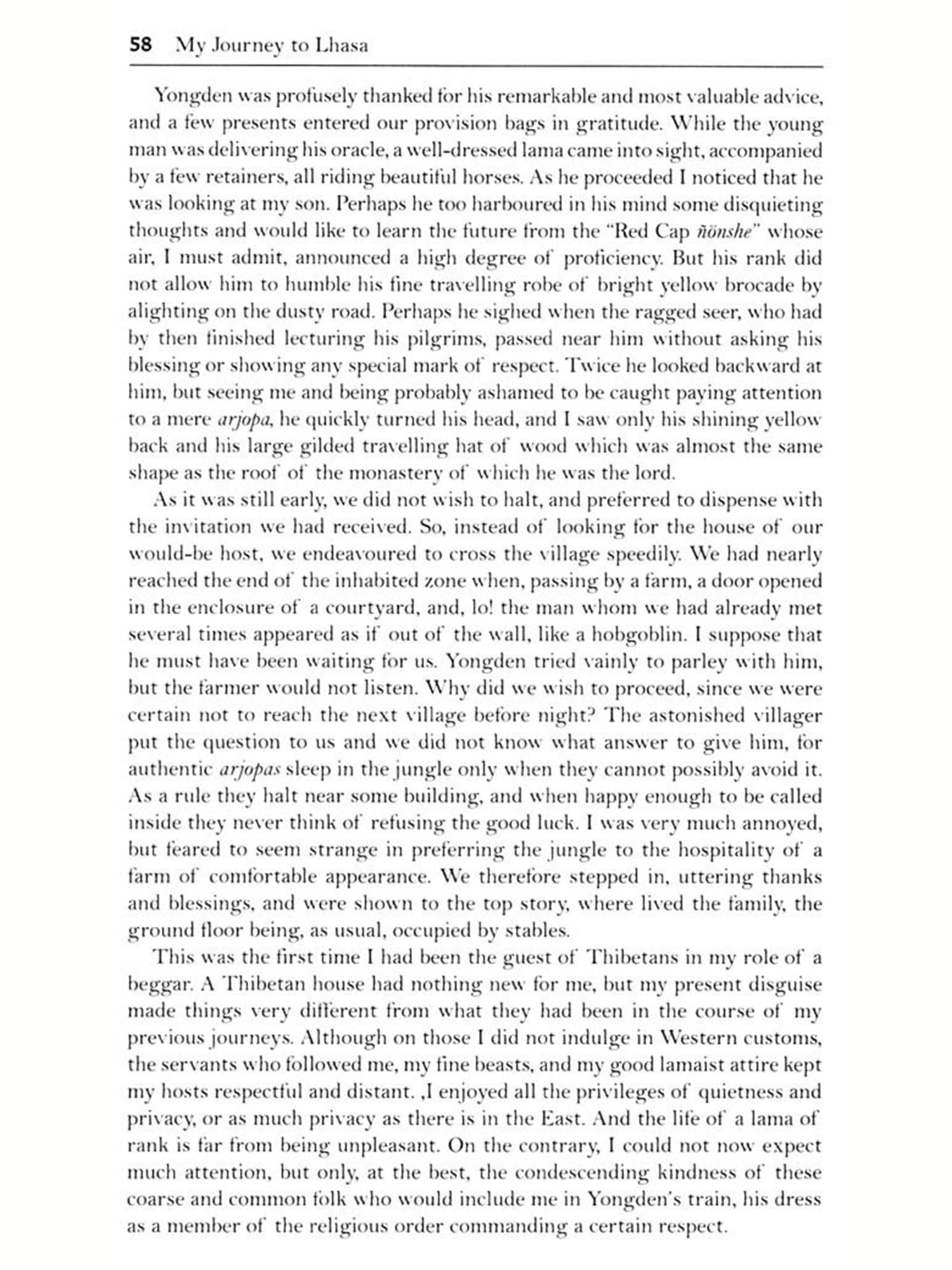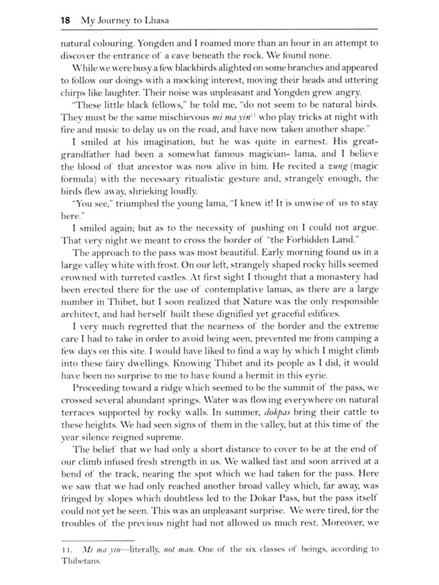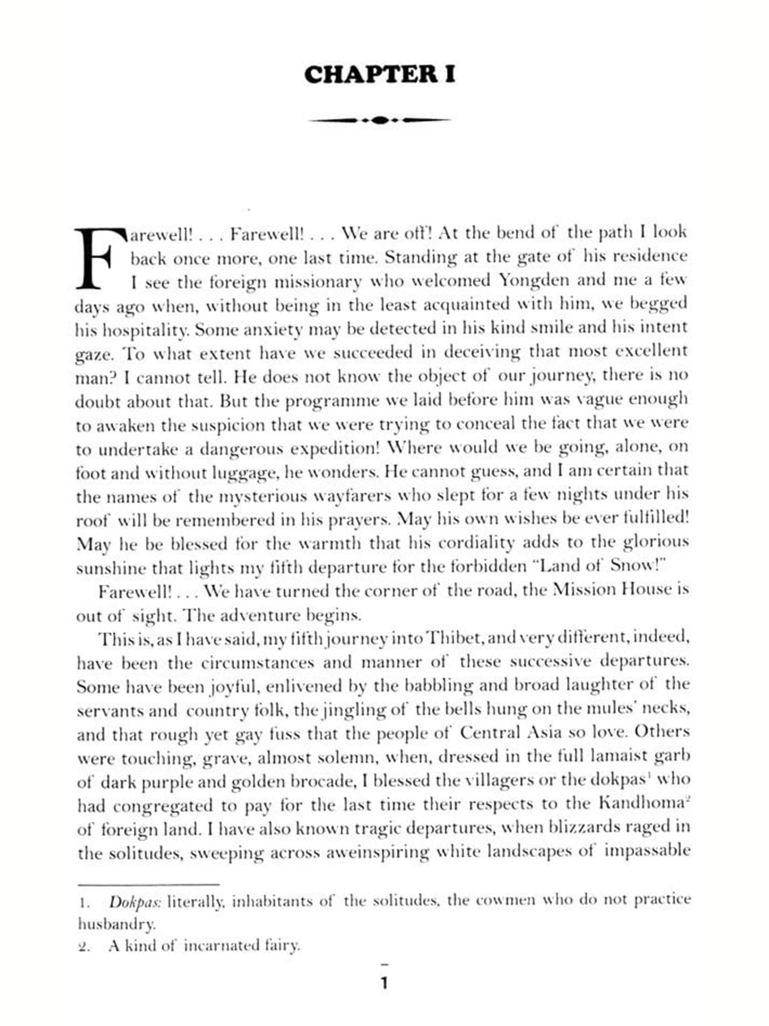 However, the very peculiar natural aspect of Thibet is not the only reason for the attraction which that country has exercised over me. Like many Oriental scholars, of whom I am but an humble colleague, I deeply regret the loss, in their Sanskrit original, of a number of Mahåyånist Buddhist Scriptures. These are more or less available in Chinese translations, but what is the extent of the Thibetan translation and what original philosophic and mystic works have been written by Thibetan authors, either in accordance with Mahayânist doctrines or contrary to them, is as much terra incognita as the land of Thibet itself. Thus, hunting after books and old manuscripts and seeking meetings with the literati of the country became my self-assigned task. Anyhow, things could not end there.