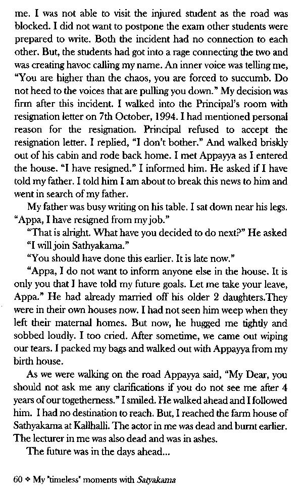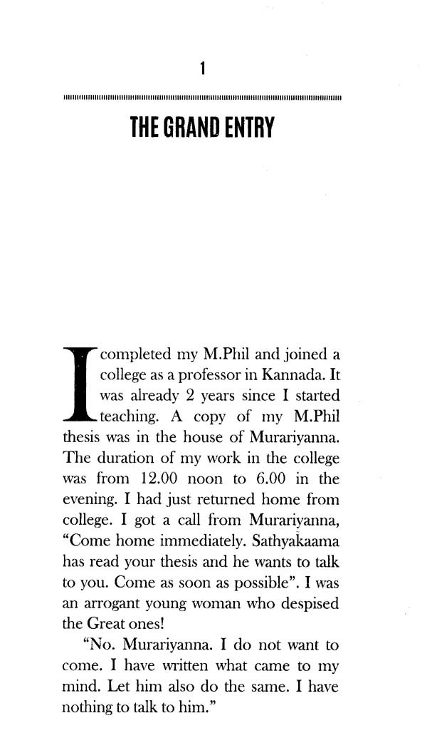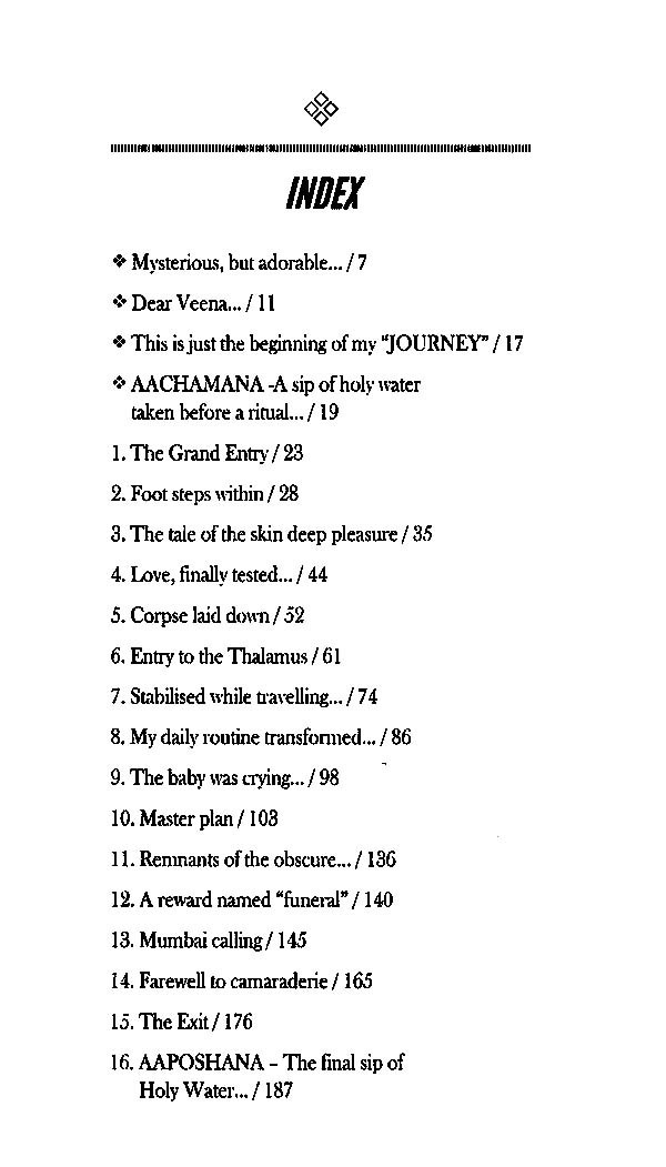 Satyakama at 70, was a laureate. A thinker. A tantric. He was deeply spiritual. He had walked his own path to understand life in his own special way. Veena at 26, came from a distinguished family background, was young and energetic, well-educated, just shaping up a career and was in love with her boyfriend. Both these stories have different connotations. Very contradicting in both its means and the end. But the old and the new met. This book in your hands is all about their journey together. There is fantasy as well as reality. There is prose as well as poetry. There is a definitive purpose as well as obscurity. There are contradictions as well as conviction. There is an unlearning as well as a learning. It is up to you to figure out what this book is all about. You get what you seek and what you can comprehend. As far as Veena is concerned, she has simply gone ahead and told her story as is. No qualms what so ever. No hiding the events behind a camouflage. No mincing of the words to make them palatable. Emotions are shared without an attempt to give them an acceptable holy attire. This absolute honesty in her writing is what I admire the most.
