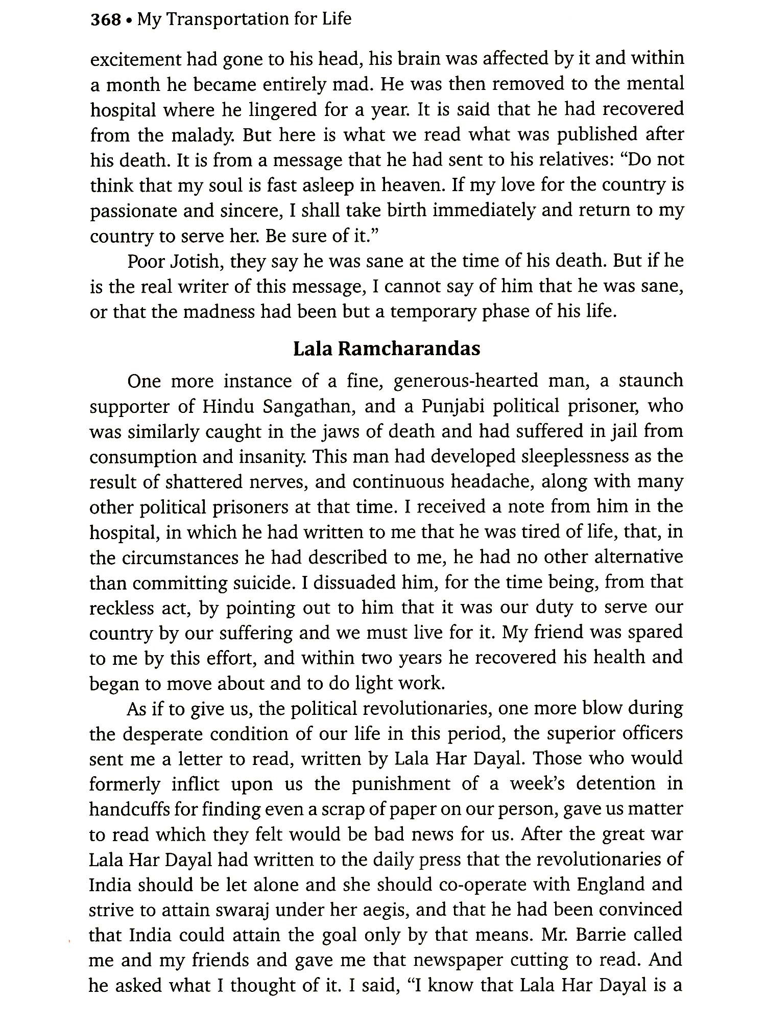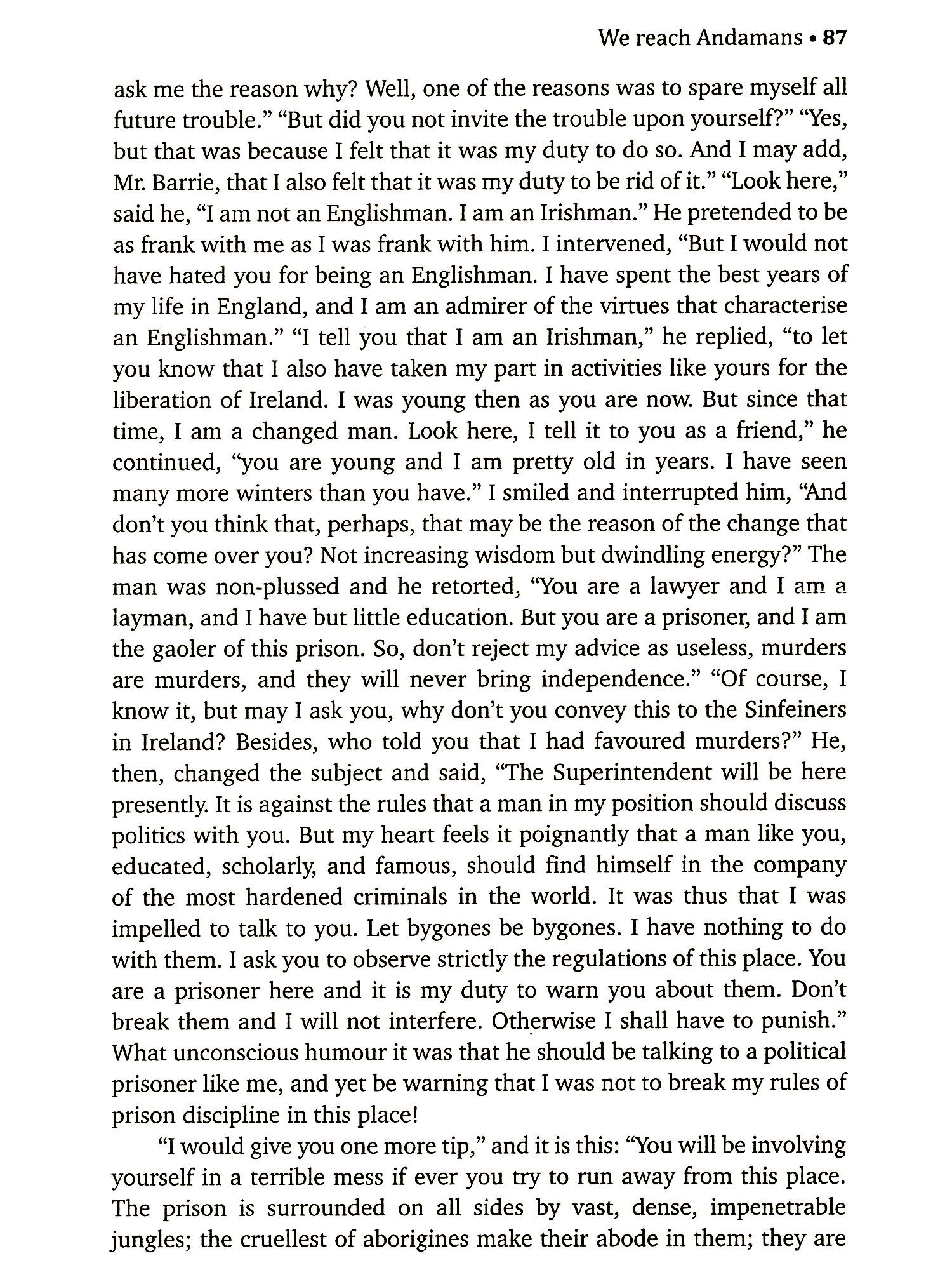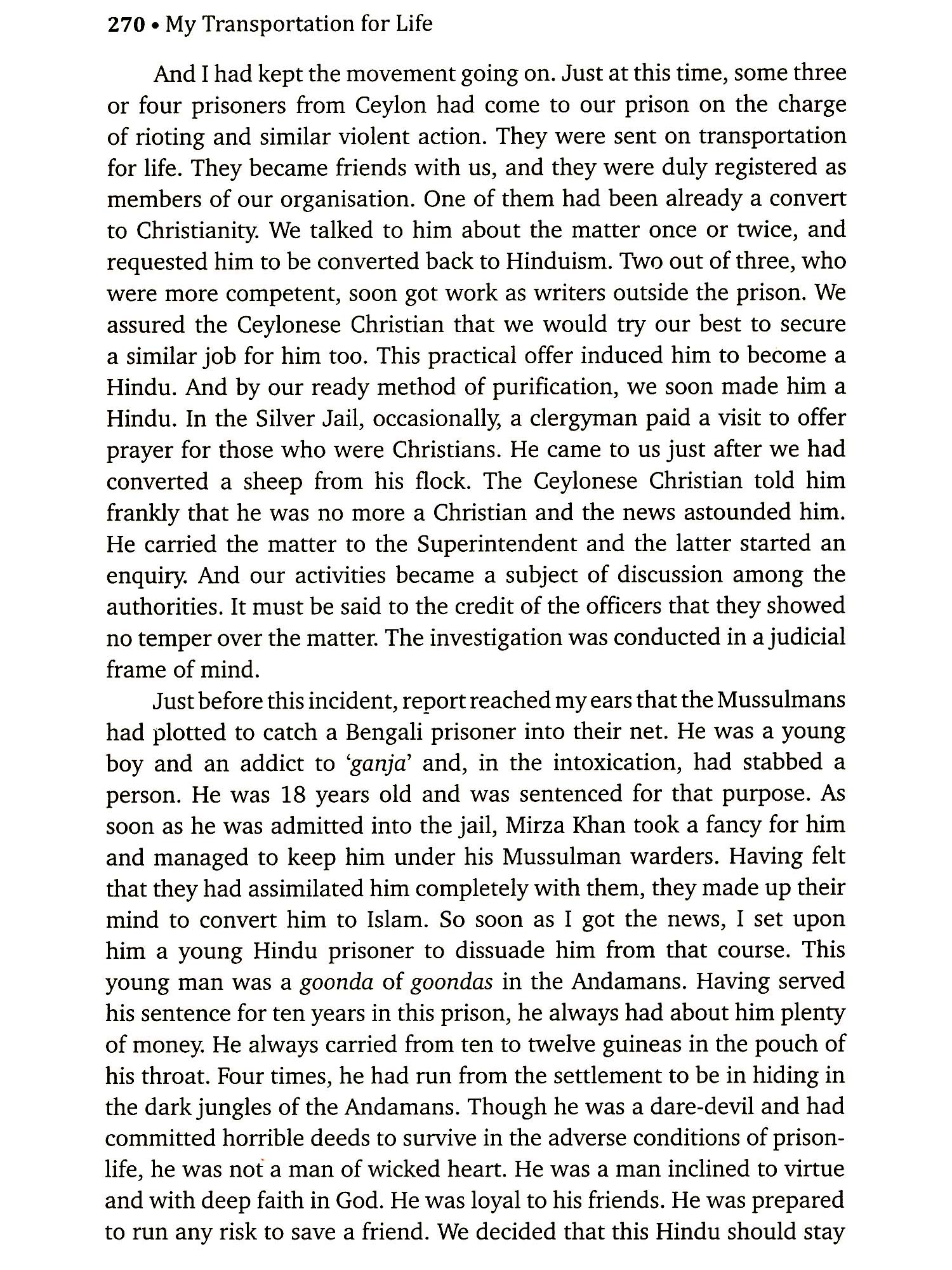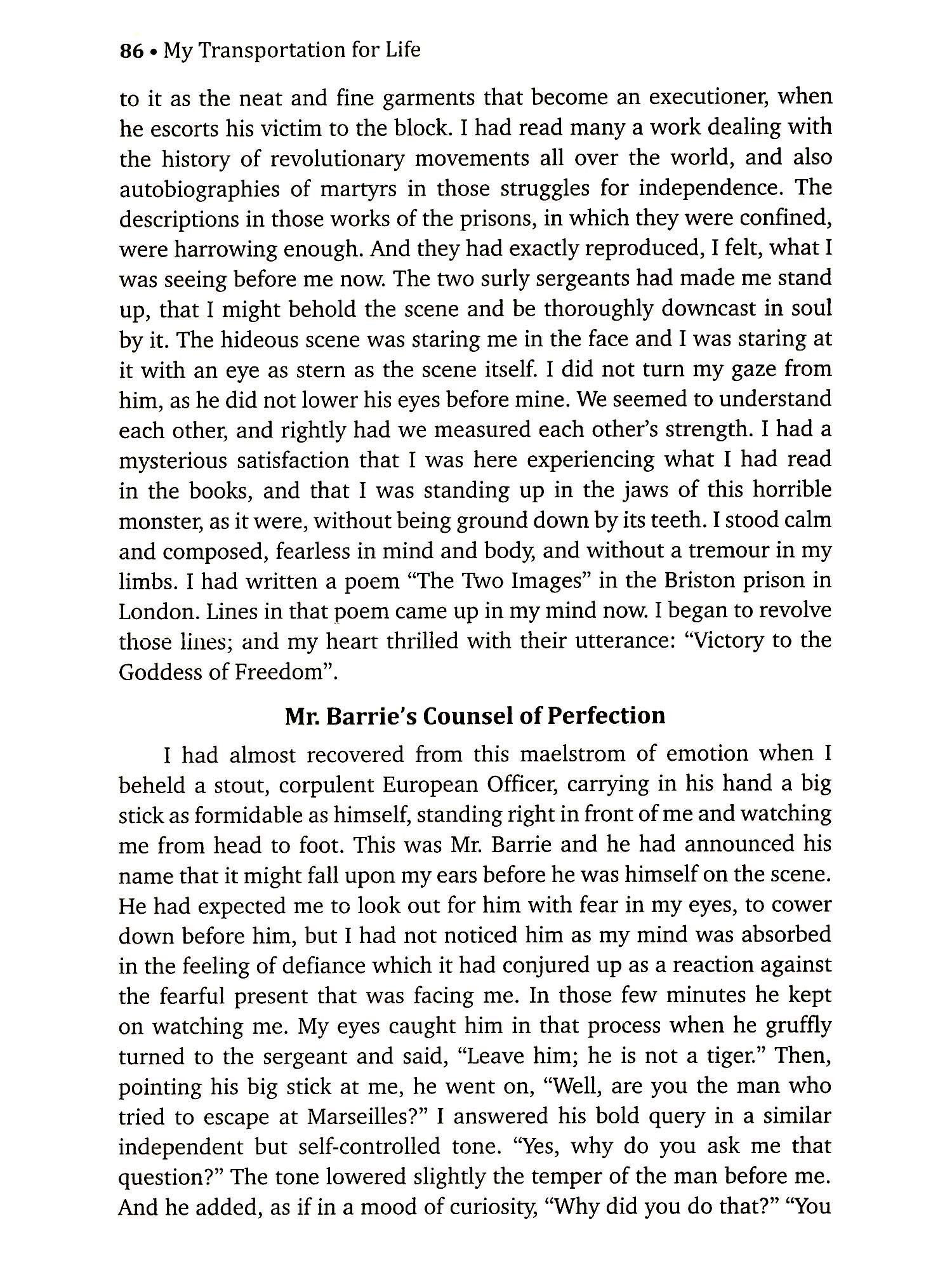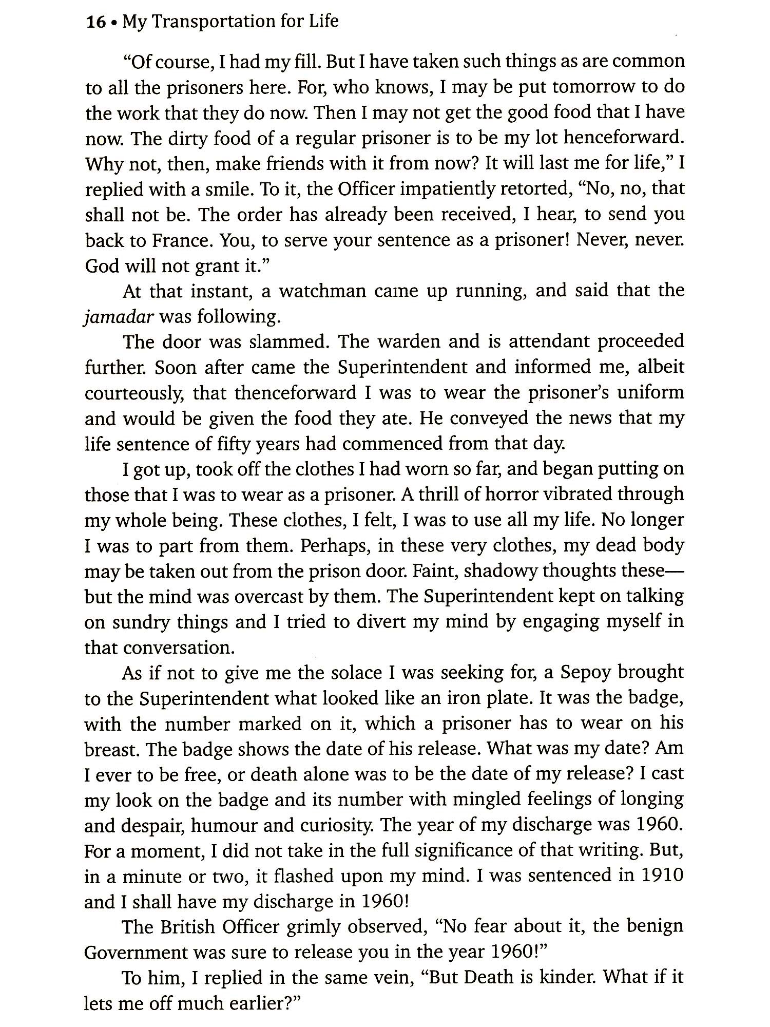 The story is told. The curtain has been brought down on it. Two life-sentences have been run. And I have brought together my recollections of them within the cover of this book. They are narrated in brief and put together within the narrowest. When I came into this world, God sent me here possibly on a sort of life-sentence. It was the span of life allotted to me by time to stay in this 'prison-house of life'. This story is but a chapter of that book of life, which is a longer story not yet ended. You can finish reading the book in a day, while I had to live it for 14 long years of transportation. And if the story is so tiresome, unendurable and disgusting to you, how much must have been the living of it for me! Every moment of those 14 years in that jail has been an agony of the soul and the body to me, and to my fellow convicts in that jail. It was not only fatiguing, unbearable and futile to us all, it was equally or more excruciating to them as to me. And it is only that you may know it and feel the fatigue, the disgust and the pain of it as we have felt it, that I have chosen to write it for you. This is the story of Swatantrayaveer Vinayak Damodar Savarkar a great revolutionary, politician, poet and seer who tried to free India from the British yoke! British policy was to torture and persecute the political prisoners/revolutionaries so that they would reveal the names of all their colleagues or go mad or commit suicide. My Transportation for Life is a firsthand story of the sufferings and humiliation of an inmate of the infamous Cellular Jail of Andamans, the legendary Kala Paani. The physical tortures inside the high walls were made all the more insufferable by the sickening attitude of the men who mattered the native leaders back home. This is a running commentary on the prevalent political conditions in India and a treatise for students of revolution. It is a burning story of all Tapasvis who were transported to Andaman.