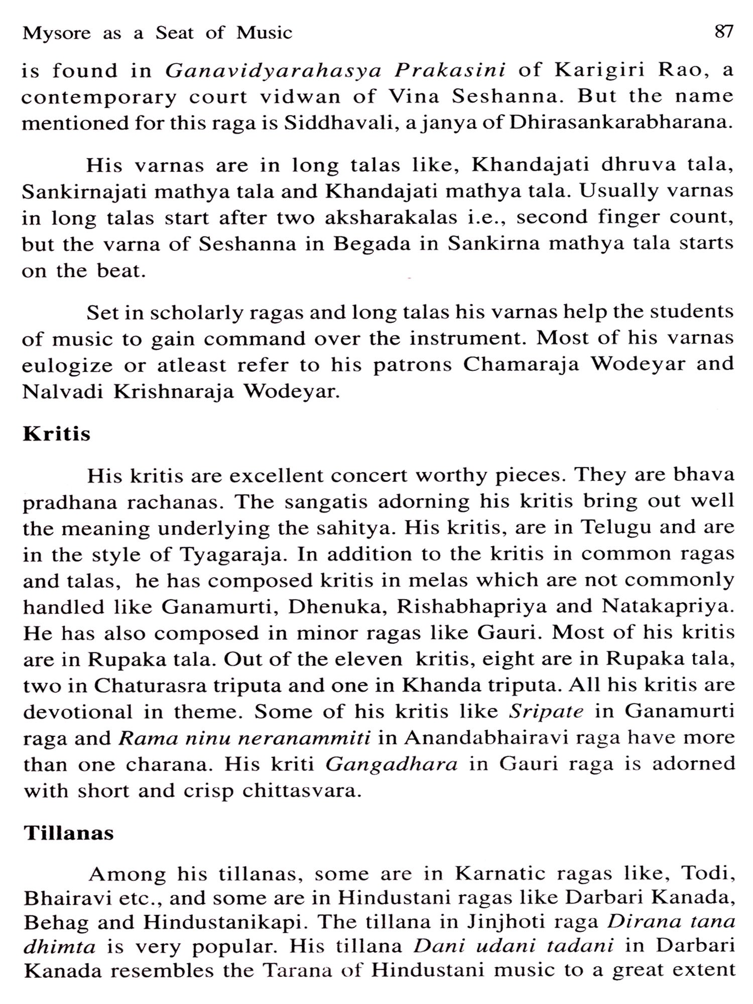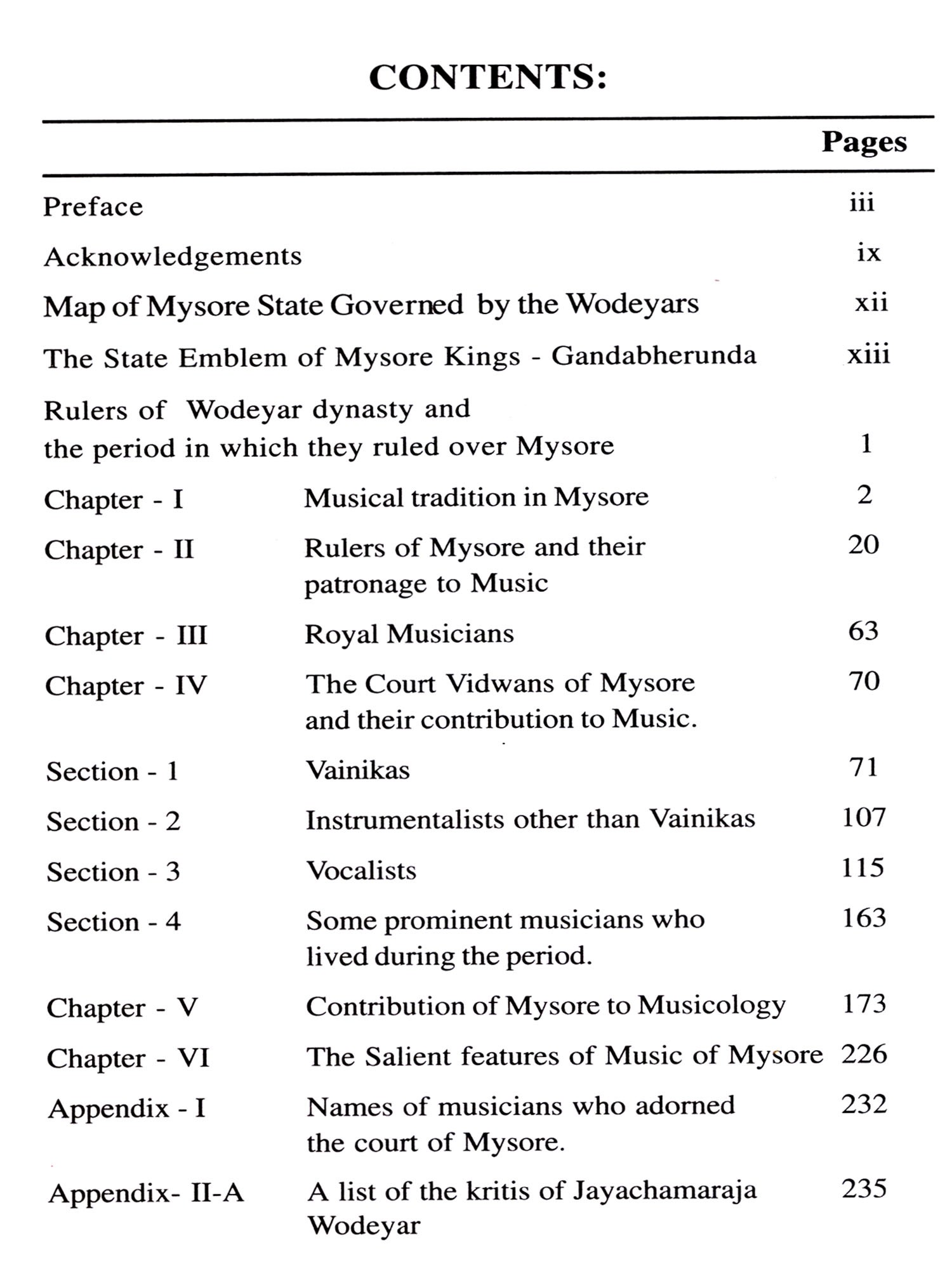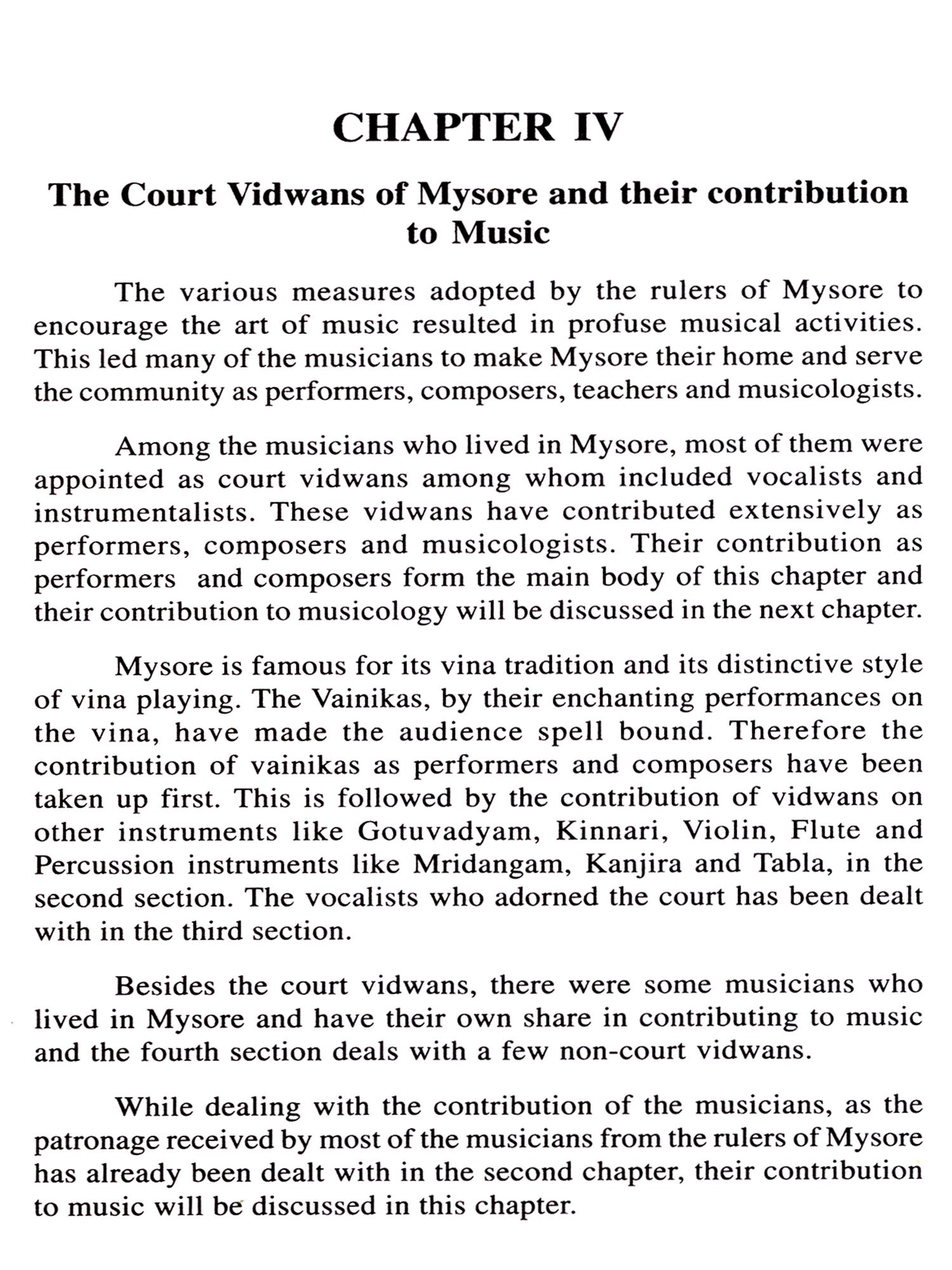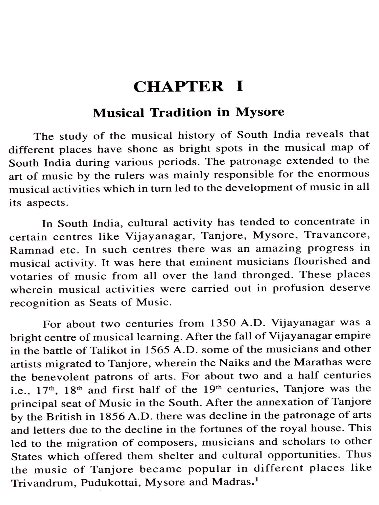 The aim of this work is ultimately to make an assessment of the contribution of Mysore to the development of classical music during the last one and a half centuries of Wodeyar rule. A few articles and books which provide some information on the composers and musicians of this period are available. As for the lakshana granthas of this period, very few articles are in print which deal with them and moreover, their scope is limited to specific topics. So far, no comprehensive study has been made of the contribution of Mysore to music, both in its theoretical and practical aspects, in the period under consideration. The information already available had to be amplified by unearthing hitherto unknown facts in order to get a complete picture of the musical activity that took place during this period. This study has revealed the existence of many composers and musicians hitherto not known and there are others whose names are known, but whose exact contribution to music has not been identified.