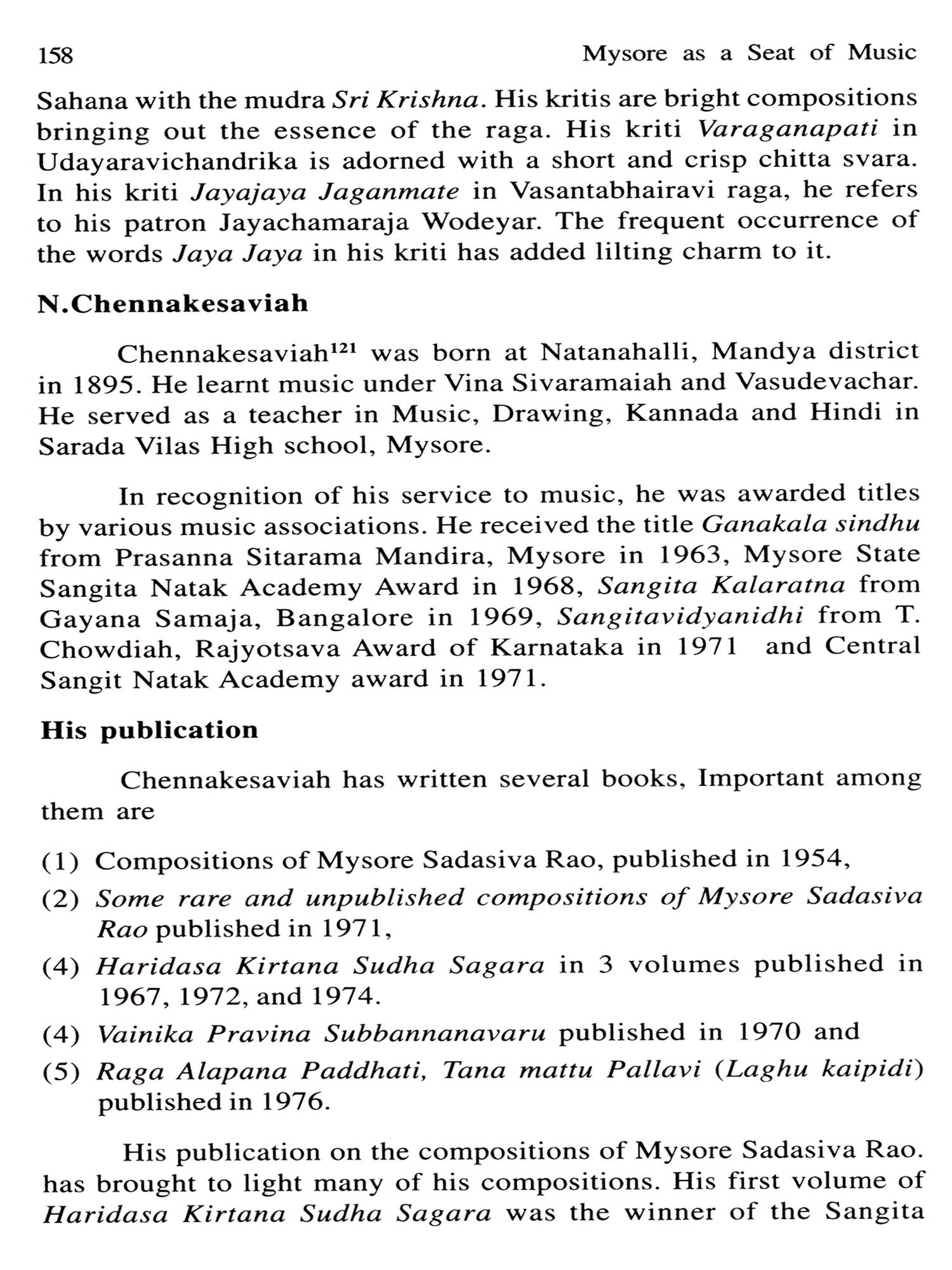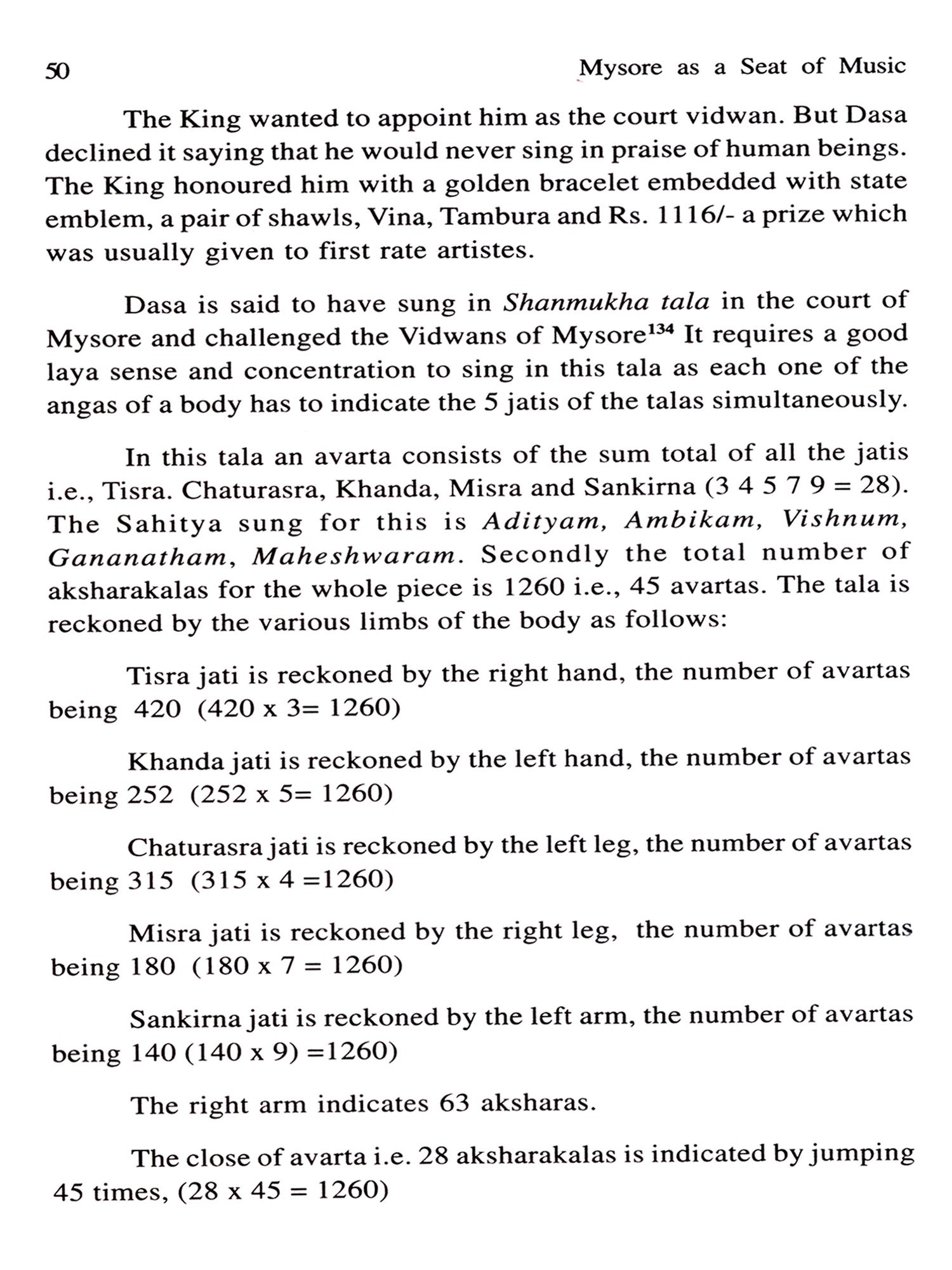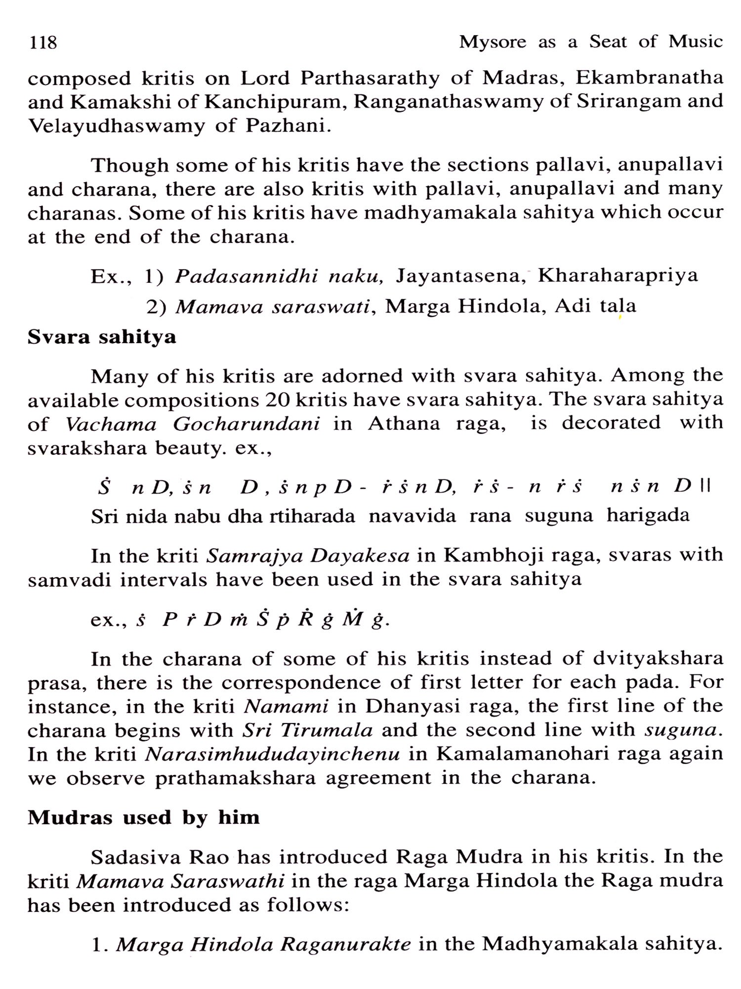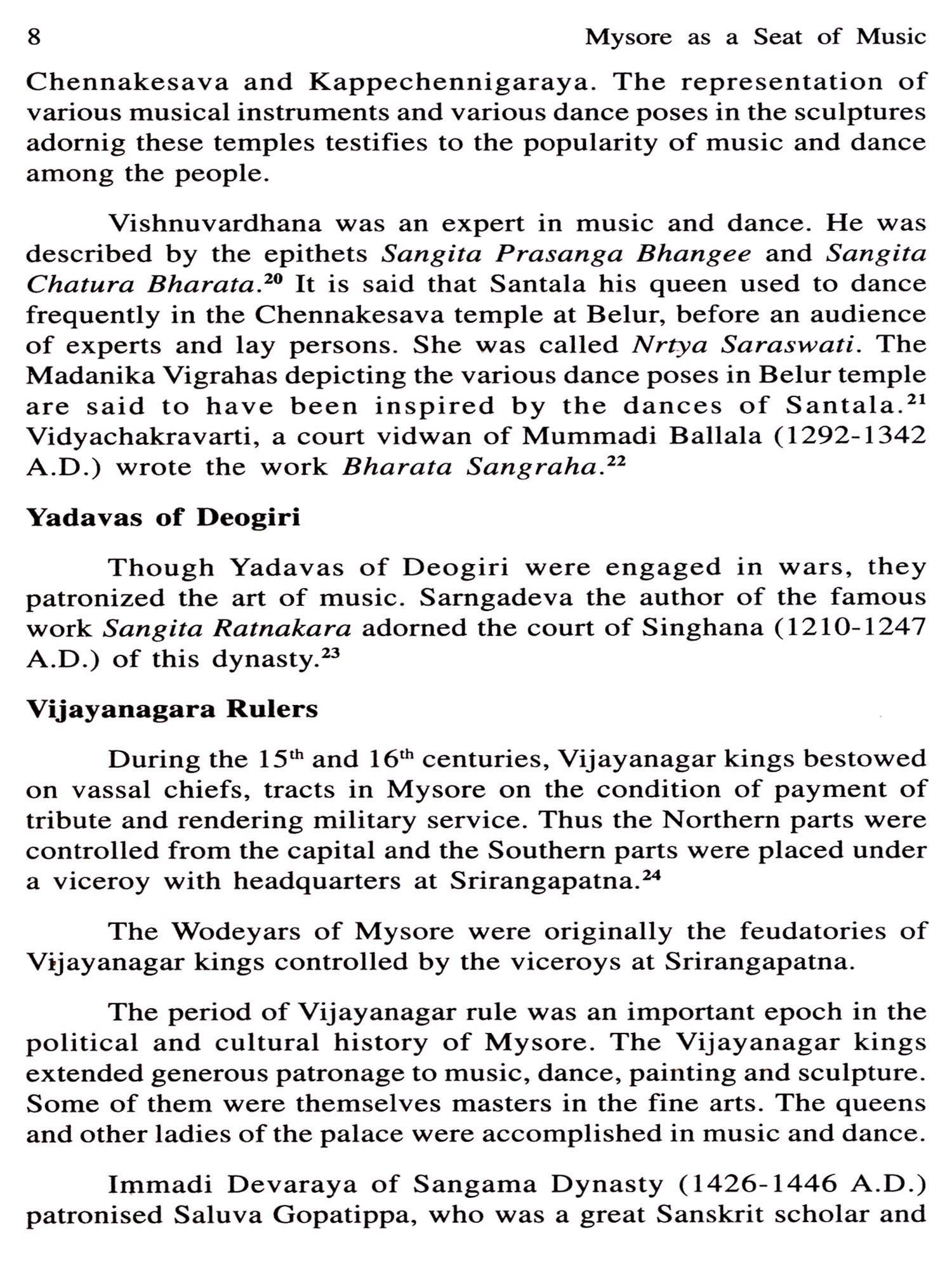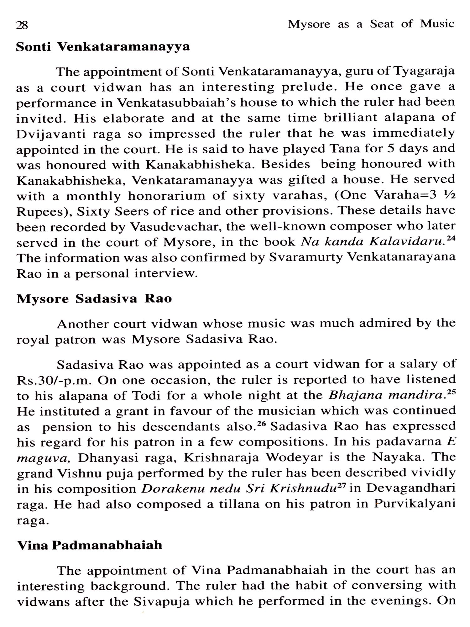 The aim of this work is ultimately to make an assessment of the contribution of Mysore to the development of classical music during the last one and a half centuries of Wodeyar rule. A few articles and books which provide some information on the composers and musicians of this period are available. As for the lakshana granthas of this period, very few articles are in print which deal with them and moreover, their scope is limited to specific topics. So far, no comprehensive study has been made of the contribution of Mysore to music, both in its theoretical and practical aspects, in the period under consideration. The information already available had to be amplified by unearthing hitherto unknown facts in order to get a complete picture of the musical activity that took place during this period. This study has revealed the existence of many composers and musicians hitherto not known and there are others whose names are known, but whose exact contribution to music has not been identified.