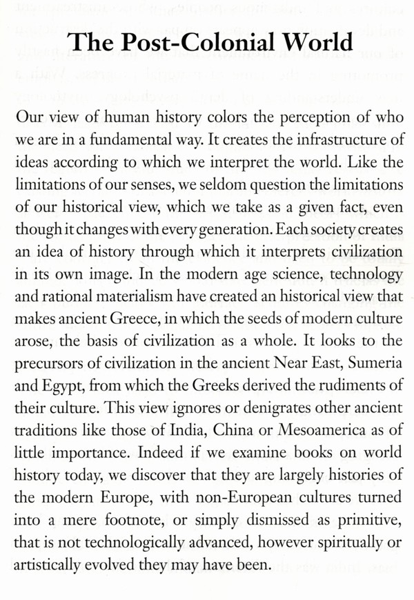 Many important new discoveries on the ancient world have occurred in recent decades, pushing back the dates of ancient peoples, cities, monuments and cultures centuries or even thousands of years in different countries and continents. The old denigration of ancient cultures is being discredited, though a new group of leftists is still trying to keep it going. The new view emerging is of rediscovered profound and advanced ancient cultures in many parts of the world whether in the Americas, Middle East or India, now respecting their monuments and the depth of their traditions and teachings.