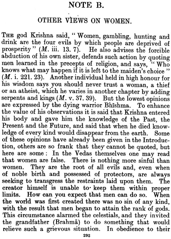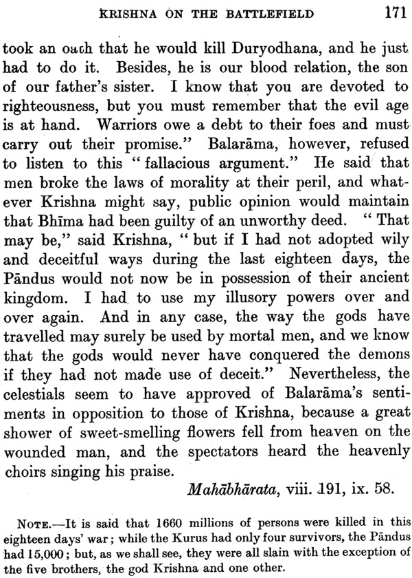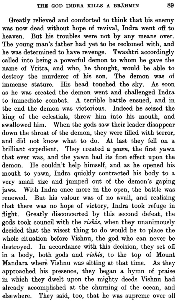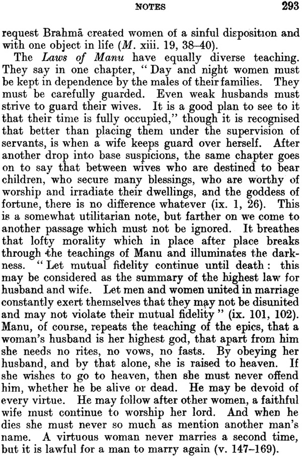 In a book such as this no purpose would be served by seeking to bridge the gulf which divides the teaching of the Vedas from the epics and the Puranas. In the notes some attempt is in de to show I ow the germs of certain legends and the sources of certain theories a practices are to be found in the earlier literature) Nor ust it be forgotten that the more ancient portions of the epics are as old as some of the Upanishads. But whil that is so, the student of both periods recognises that i passing. from the Vedas to the epics he is passing to a new world, where new gods rule and where new ideas have taken root and flourish This is specially manifest with regard to the gods " There are thirty-three god;," says the Rig-Veda ; and the Shatapath,a Brantona, which is some centuries later t la the Rig-Veda, says : " There are thirty-three gods, and Prajapati is the thirty-fourth." But in one of the oldest legends which the epics contain, while the thirty-three gods still receive lip-service, three new gods have already emerged to whom the whole future of Ili] din" belongs These are Brahma the creator, who is th e successor of Praja-pati, and Vishnu and Shiva, who were destined to push even Brahma- aside in the estimate of later w rshi pers. It is true that Vishnu was one of the thirty-three gods, and so also was Shiva under the older naive of Ru ra, but their functions and attributes are entirely different. Along with Brahma the creator, they go to for the Hindu triad, in which Vishnu plays the part of the preserver, and Shiva of the destroyer god. we shall find that these three are reckoned as manifestations of Brahin the universal Spirit As he reads the earlier legends the reader may be disposed to doubt that statement. Brahma,in particular seems to play an important part. He appears constantly as the court of appeal to whom ods and men hasten in Two legends, " A Ala unusual length in the Bra hmana8. To been placed in the text alongside the sSacrifice " and " The Flood," are given at how the contrast, they have e legends taken from the epics.
