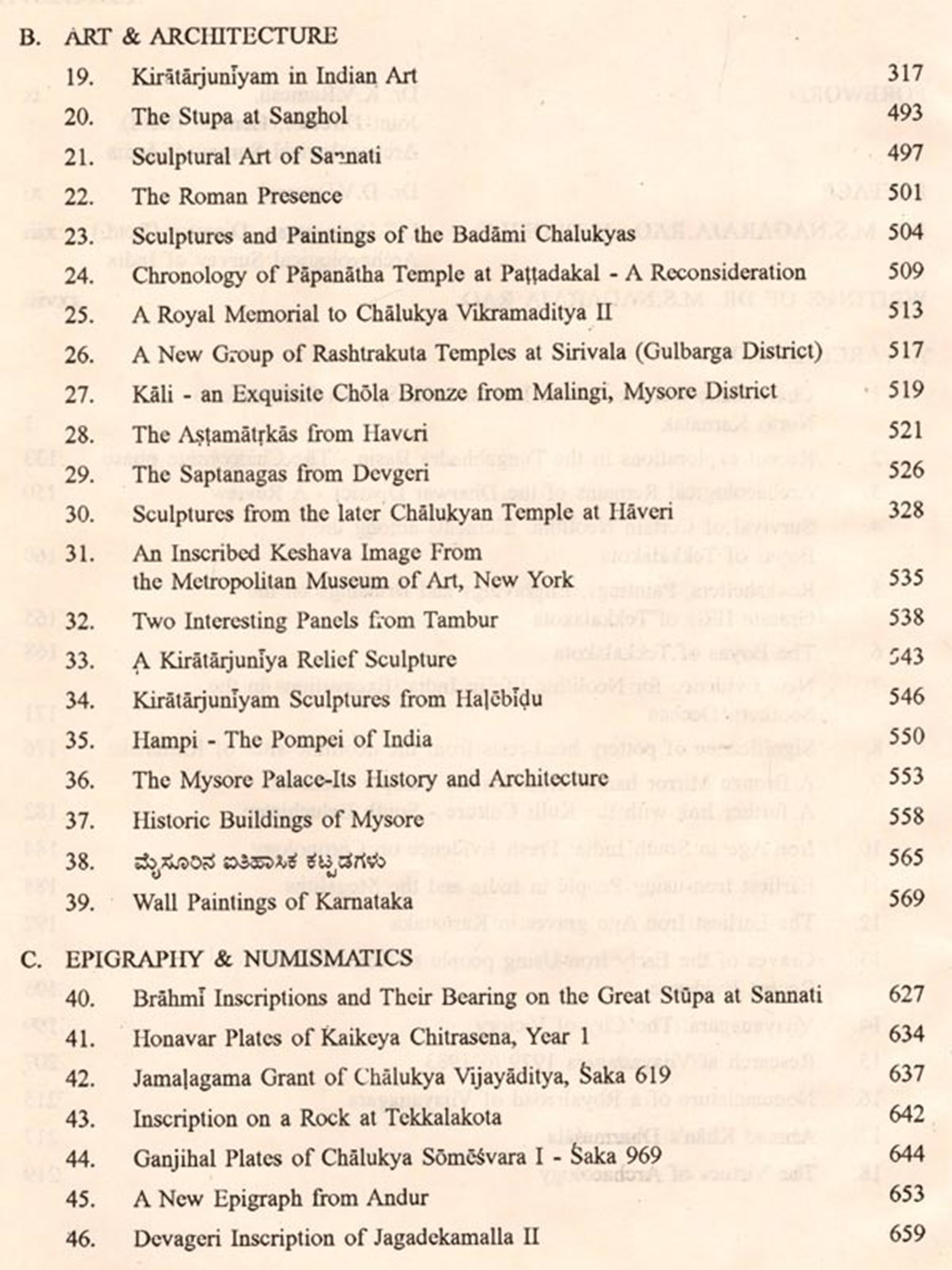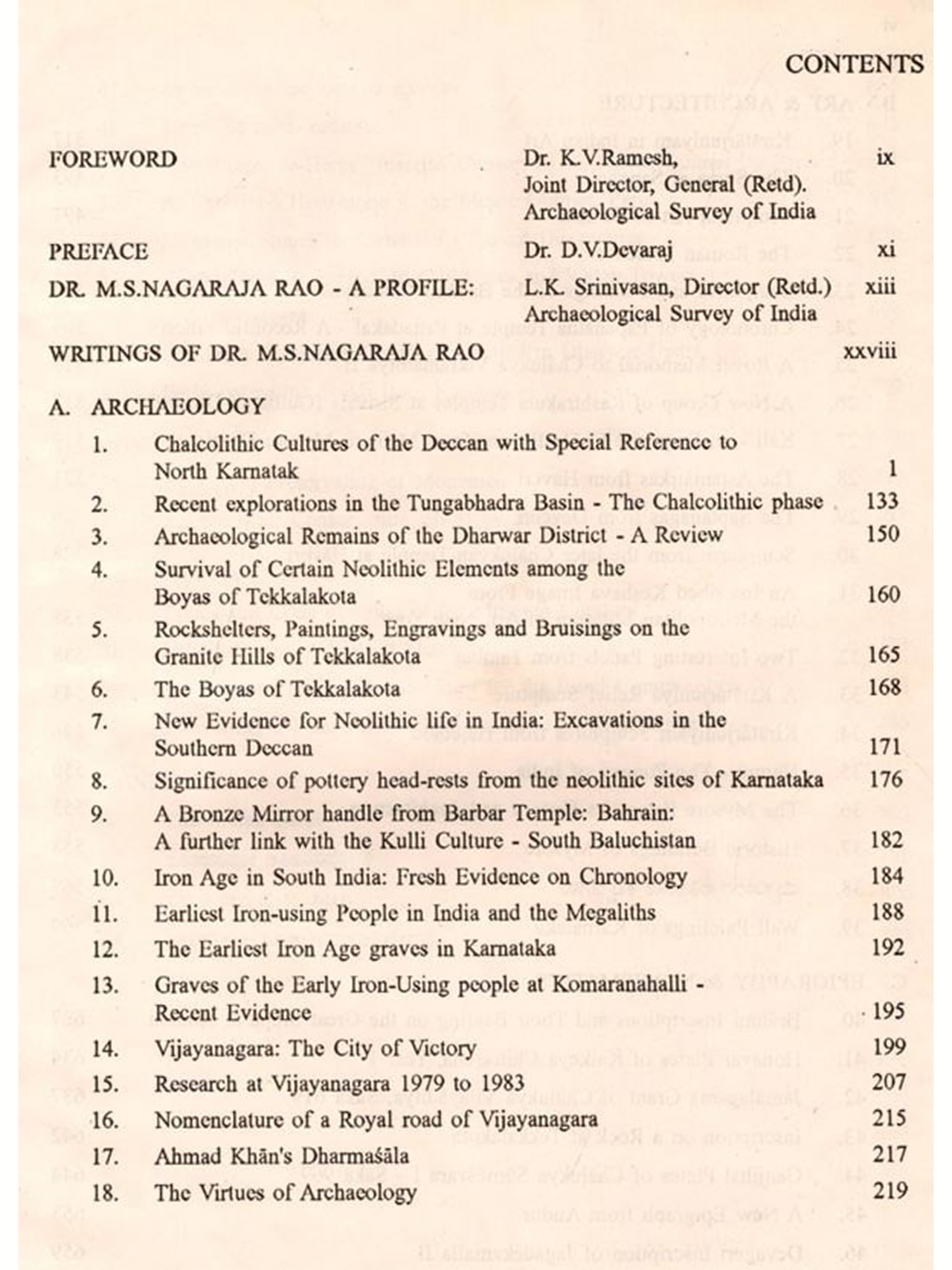 The present volume represents a part collection of the writings of Dr. M.S.Nagaraja Rao on archacology and allied subjects. Archaeologists the world over know only too well the extremely busy and work-oriented schedule of programmes which Dr. Rao had set for himself both during his long tenure as Director of Archacology and Museums in the State of Karnataka as well as during the three momentous years (1984-1987) when he effectively presided over the archacological affairs of the whole of India as Director General, Archaeological Survey of India. Those who know Dr. Rao well and intimately also know that his lasting contributions and achievements as an archacological policy-maker and executor would by themselves be enough for establishing his claims to greatness as an archaeologist. Hence, his learned writings on different aspects of the subject constitute a welcome bonus to the world of scholars. It is indeed surprising that, in the midst of implementing all the hectic programmes he had thoughtfully formulated for the betterment of the archaeological scenario in Karnataka and, even more importantly, in the whole of India, and in some neighbouring countries to boot, he found time to write, and write so well at that, on many different subjects of archaeology.