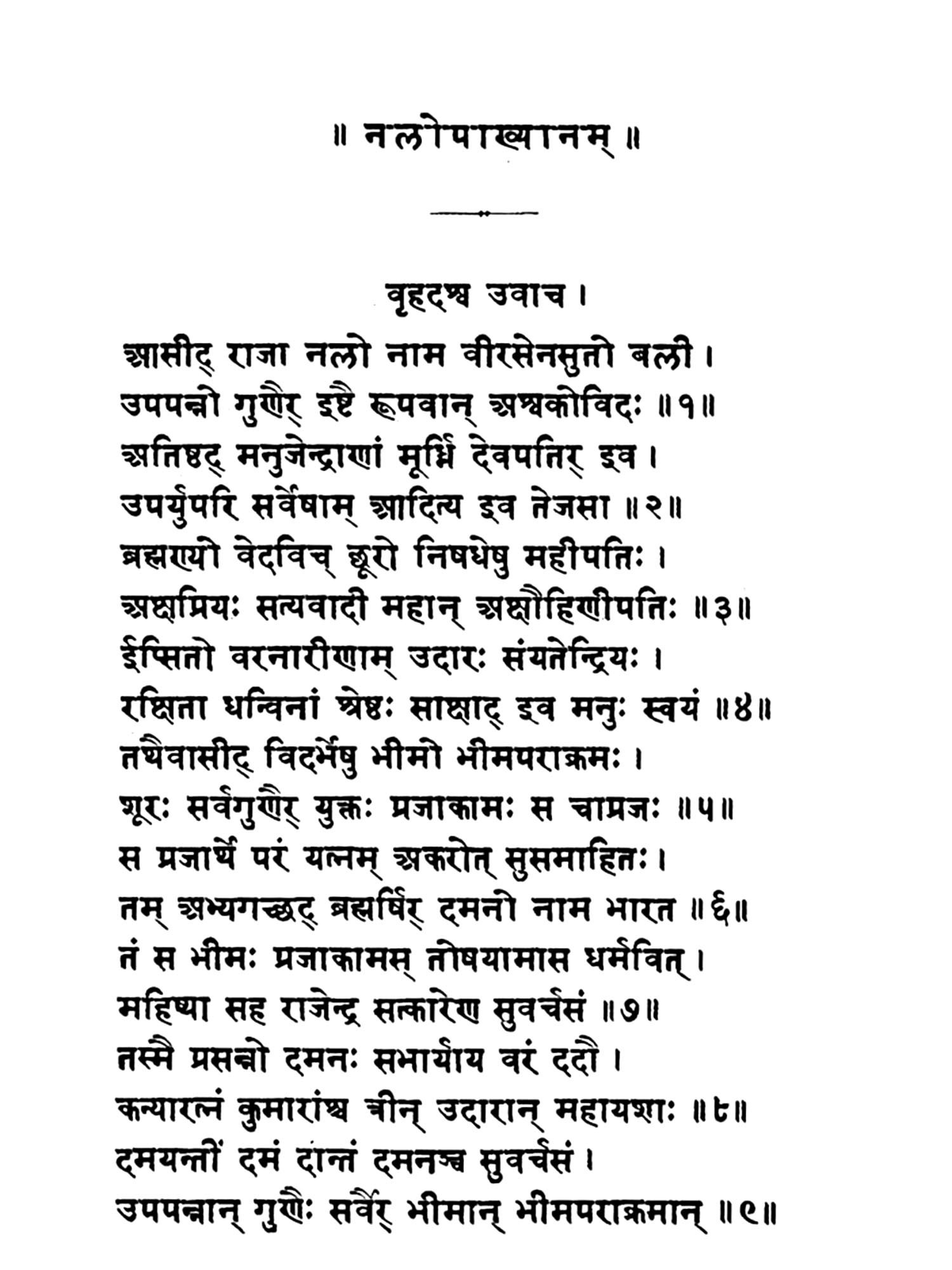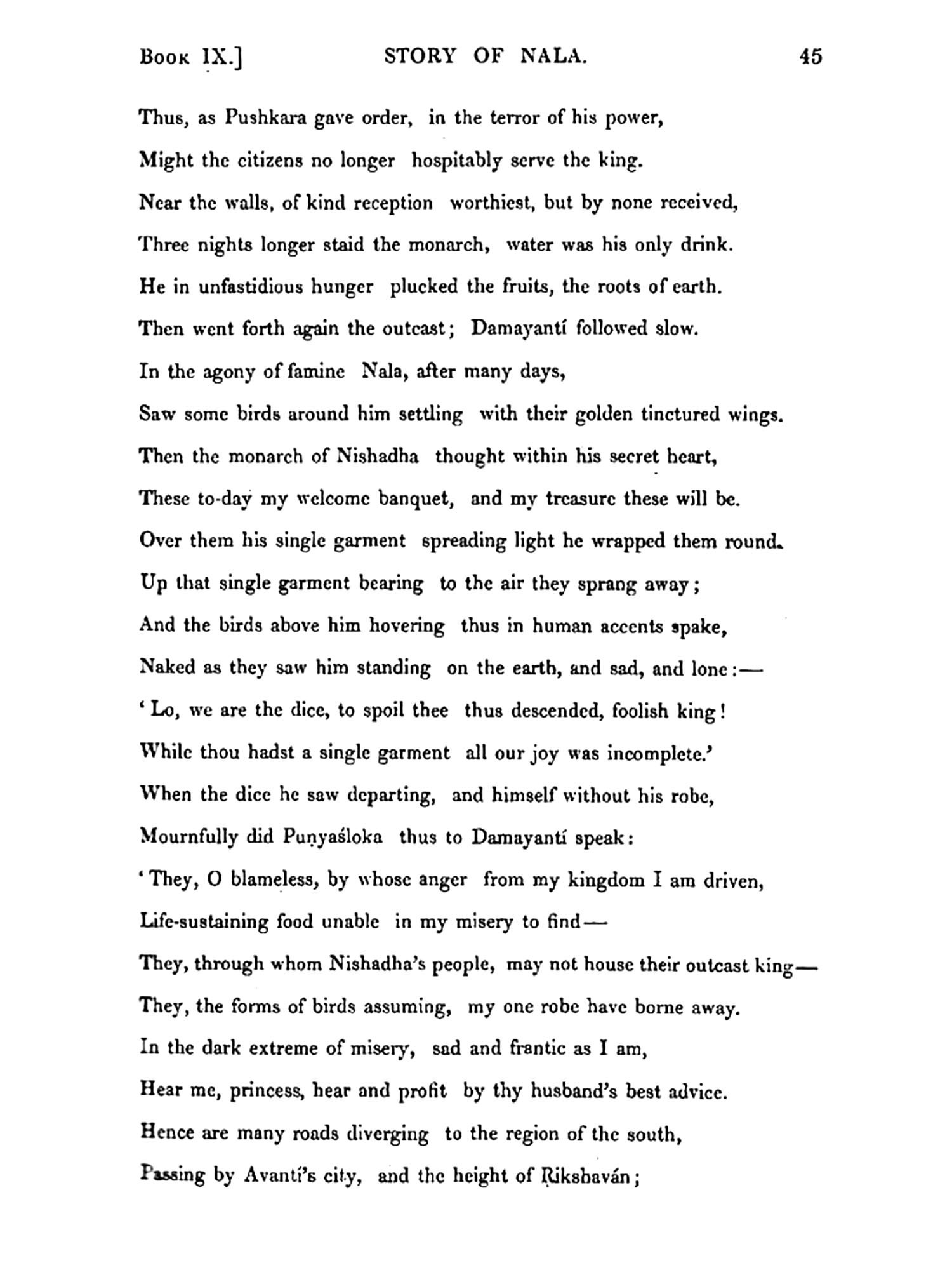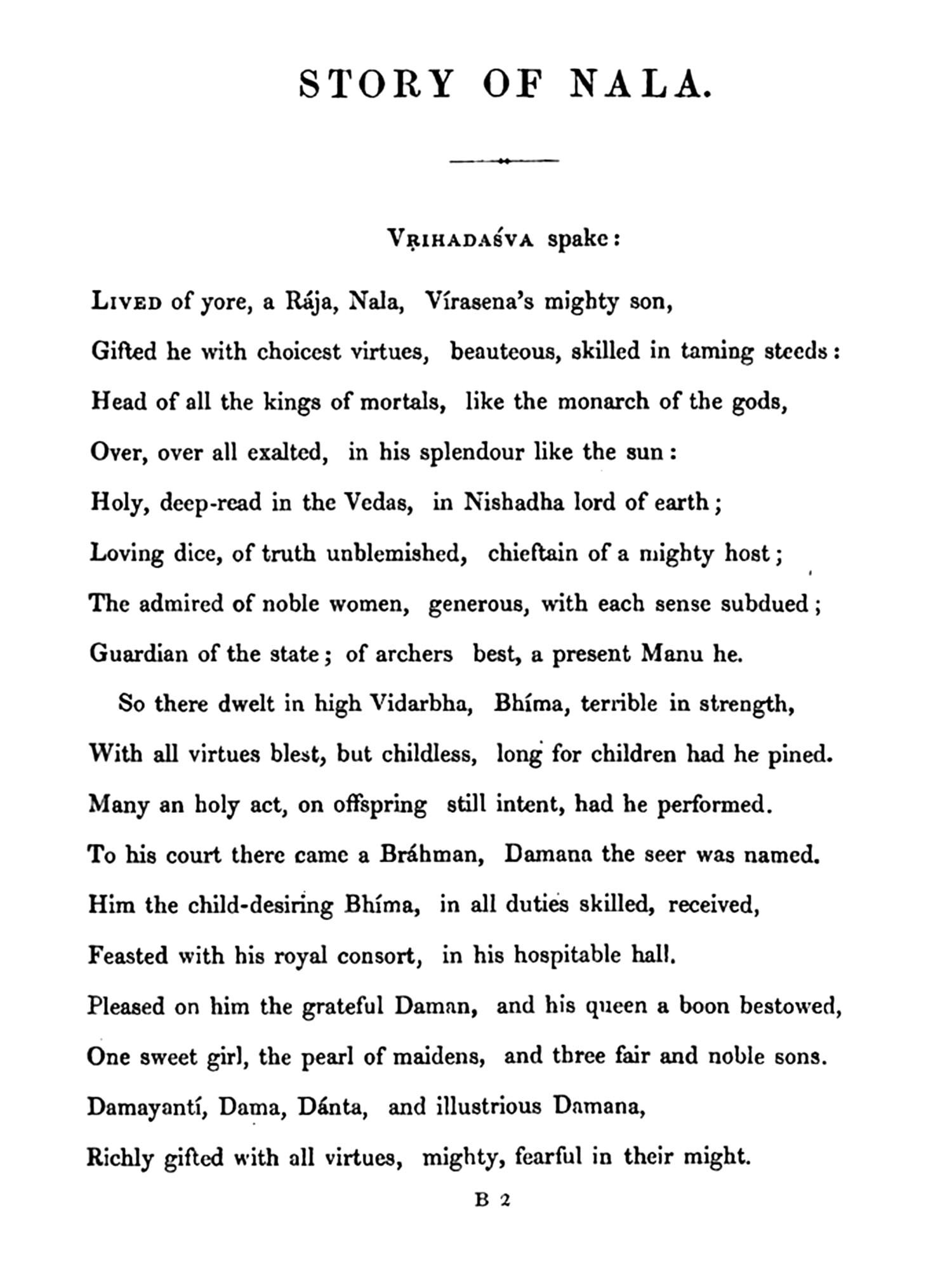 THE Story of Nala, as told in the following pages, is an episode of the Mahabharata, one of the two great Epic poems of the Hindus, containing no less than 107,389 slokas or stanzas. It is extracted from the sixth chapter (fifty-third section) of the third Book or Vanaparvan. Like the rest of the Mahabharata, its authorship is attributed to Krishna-Dvaipayana, who is called Vyasa, because he arranged the Vedas. It is not to be supposed, however, that the Vedas and Mahabharata are really the work of the same author. The Vedas are many centuries older than the great Epic poem, and each is the composition of several authors. Probably an interval of several centuries separates the more ancient hymns of the Veda from the more modern; and a similar or perhaps greater separation may be observed between the older parts of the Mahabharata and the more modern interpolations.