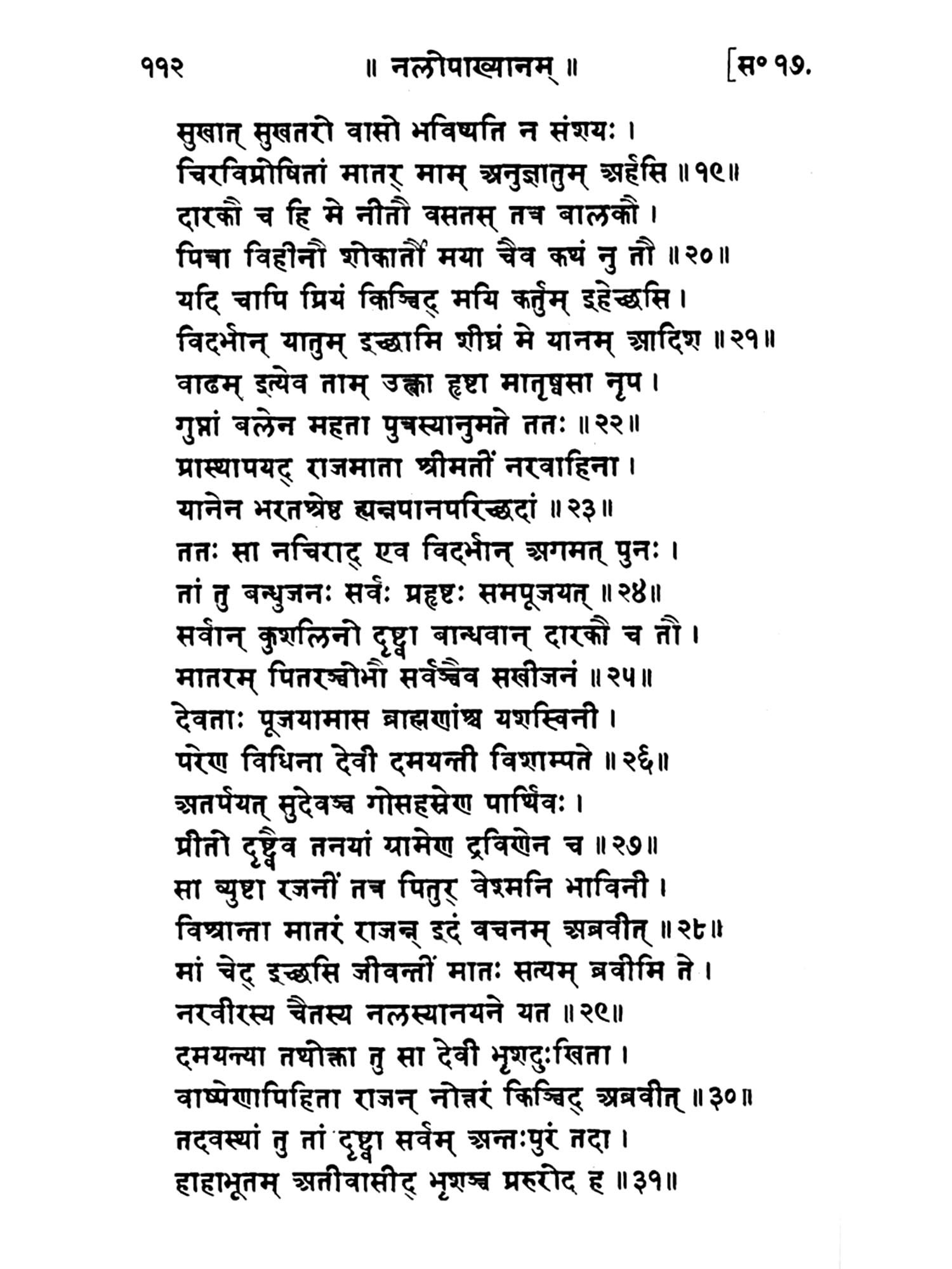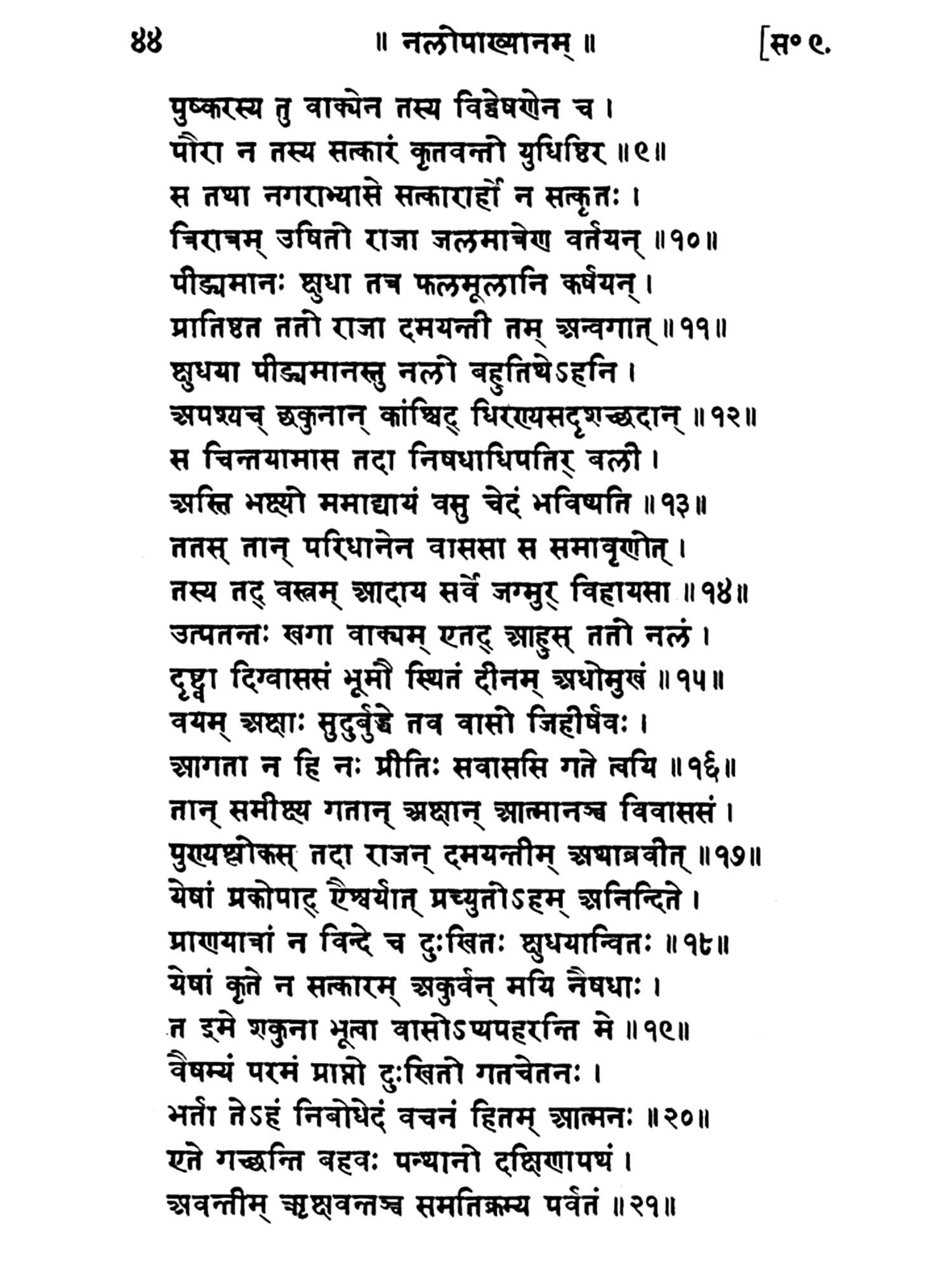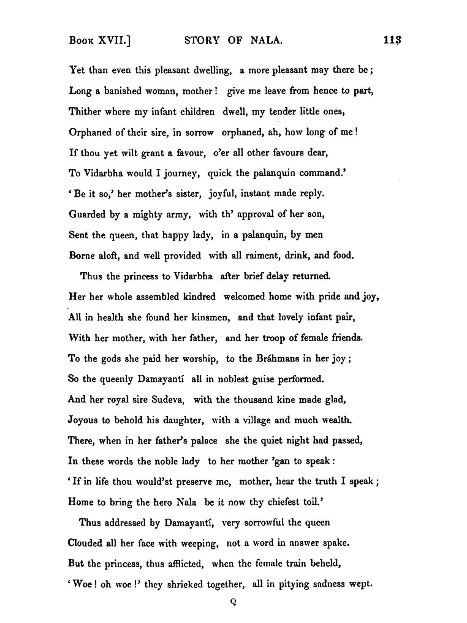 THE Story of Nala, as told in the following pages, is an episode of the Mahabharata, one of the two great Epic poems of the Hindus, containing no less than 107,389 slokas or stanzas. It is extracted from the sixth chapter (fifty-third section) of the third Book or Vanaparvan. Like the rest of the Mahabharata, its authorship is attributed to Krishna-Dvaipayana, who is called Vyasa, because he arranged the Vedas. It is not to be supposed, however, that the Vedas and Mahabharata are really the work of the same author. The Vedas are many centuries older than the great Epic poem, and each is the composition of several authors. Probably an interval of several centuries separates the more ancient hymns of the Veda from the more modern; and a similar or perhaps greater separation may be observed between the older parts of the Mahabharata and the more modern interpolations.