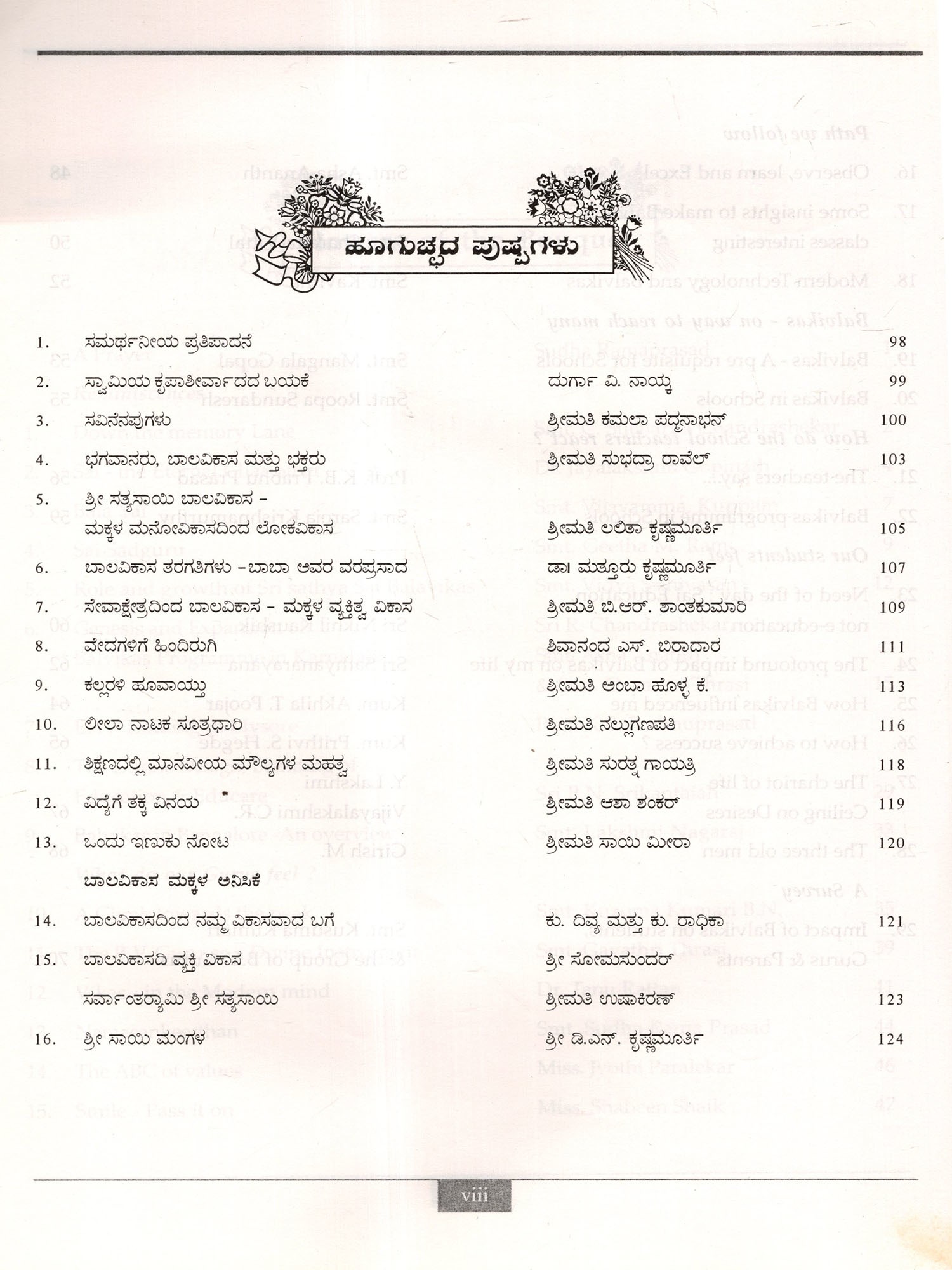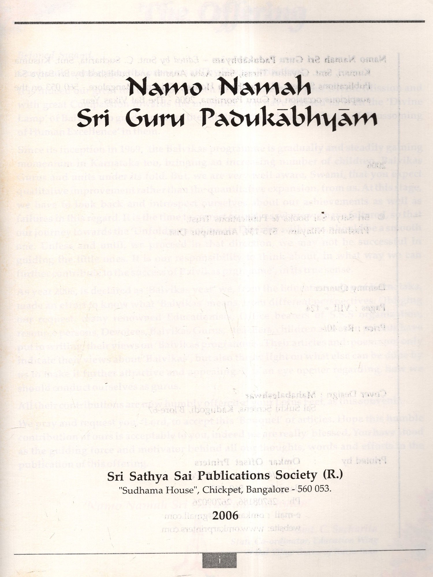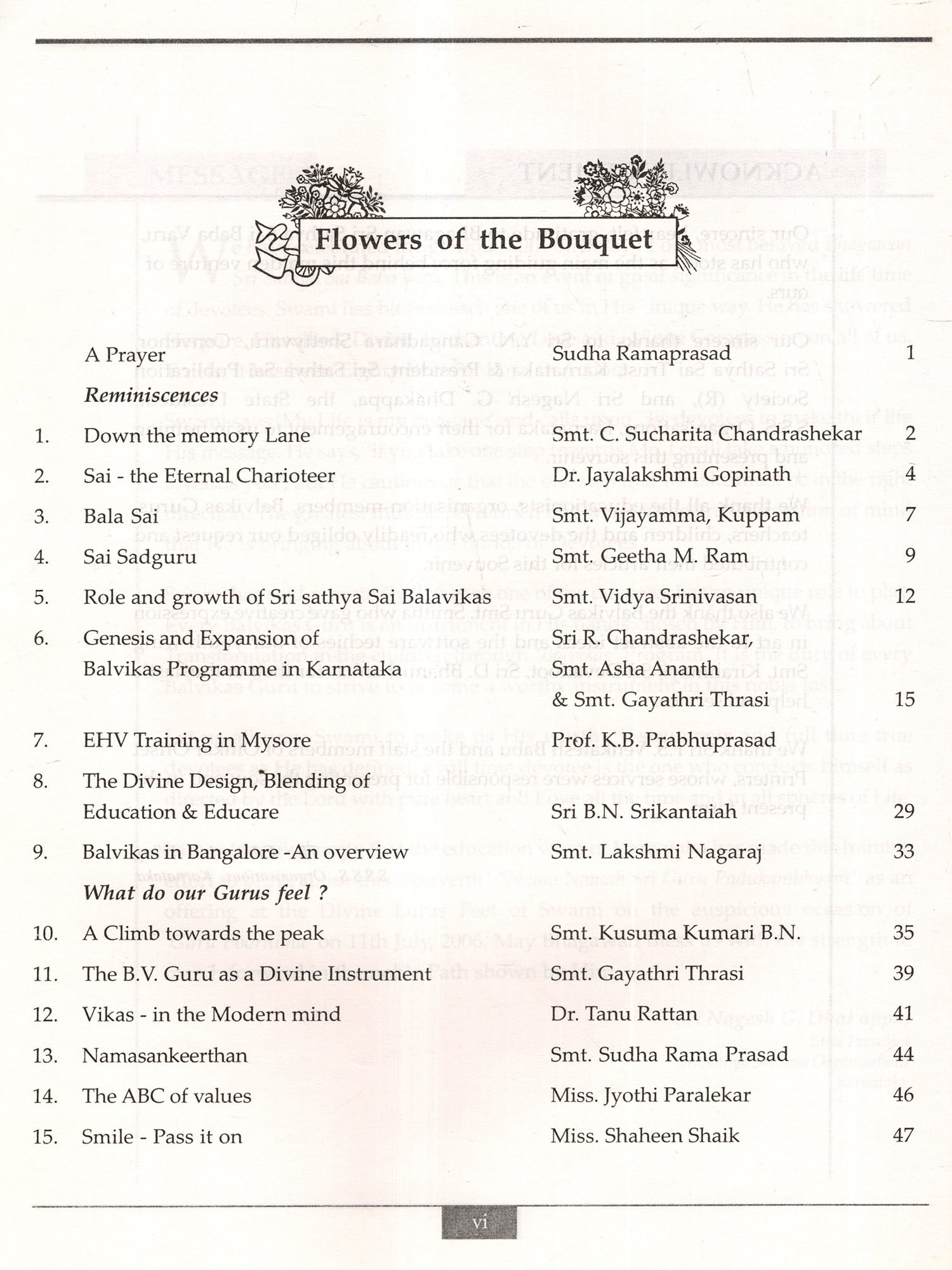 The year 2006, being the Bal Vikas year, it is a nice thought to participate in a year long programme. It is indeed befitting that the Bal Vikas Gurus of Karnataka are presenting a bouquet of their heartfelt expressions at the Lotus Feet of the Divine Guru, Bhagwan Sri Sathya Sai Baba, on the auspicious occasion of Guru Poornima.