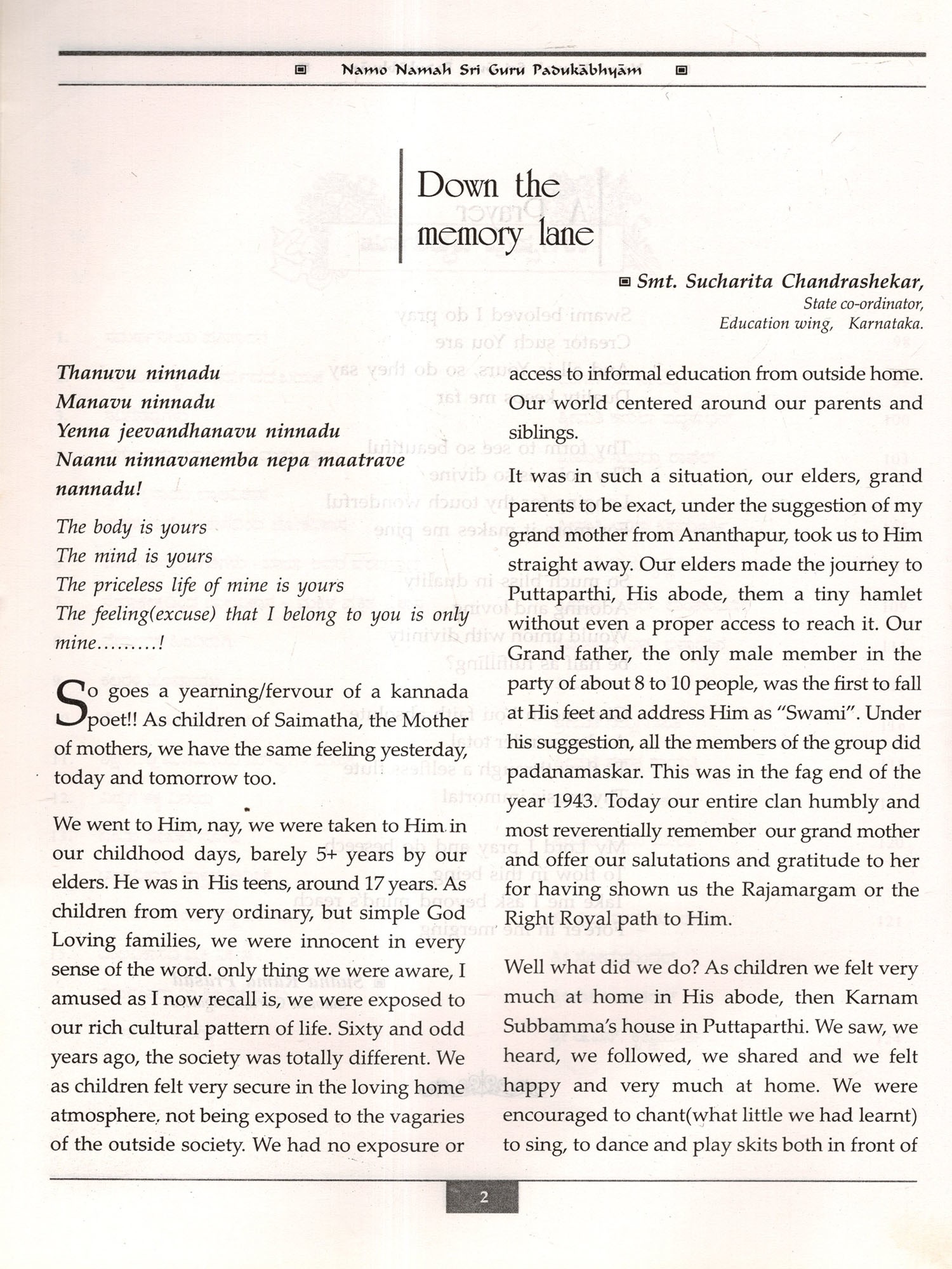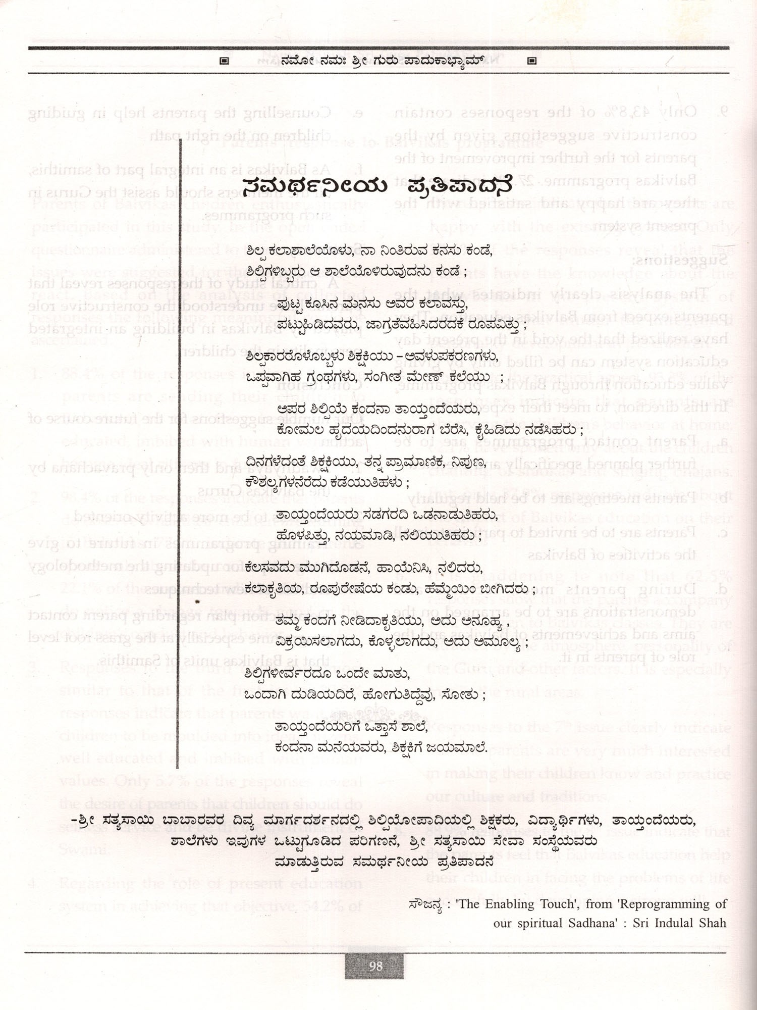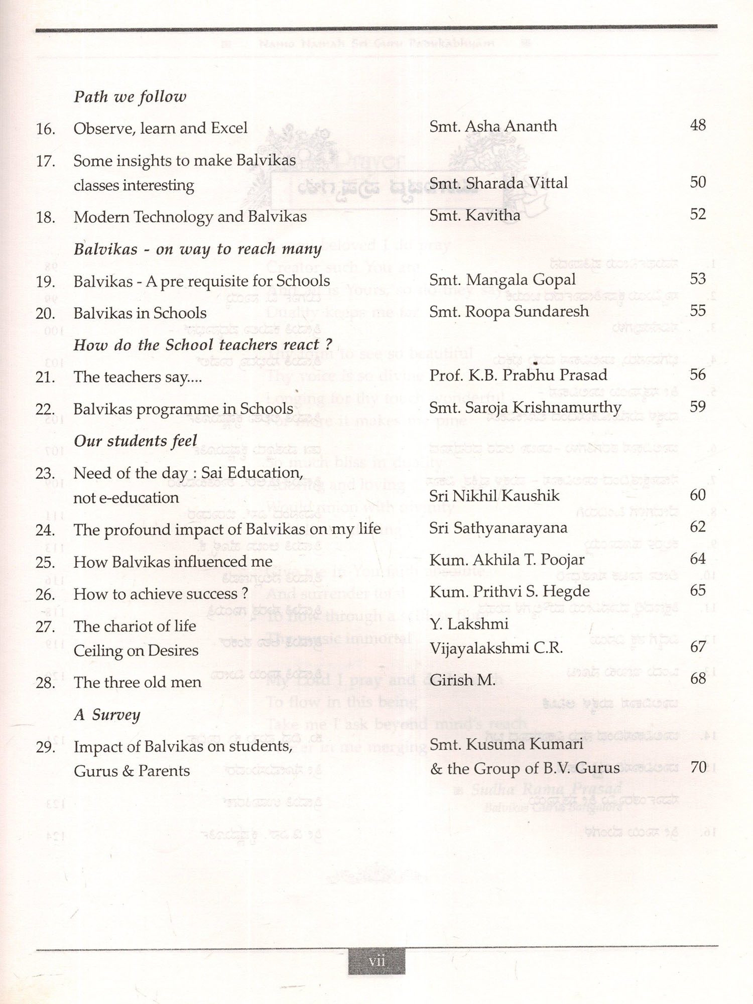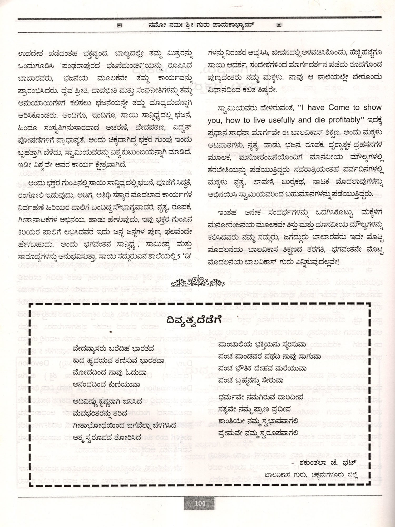 The year 2006, being the Bal Vikas year, it is a nice thought to participate in a year long programme. It is indeed befitting that the Bal Vikas Gurus of Karnataka are presenting a bouquet of their heartfelt expressions at the Lotus Feet of the Divine Guru, Bhagwan Sri Sathya Sai Baba, on the auspicious occasion of Guru Poornima.