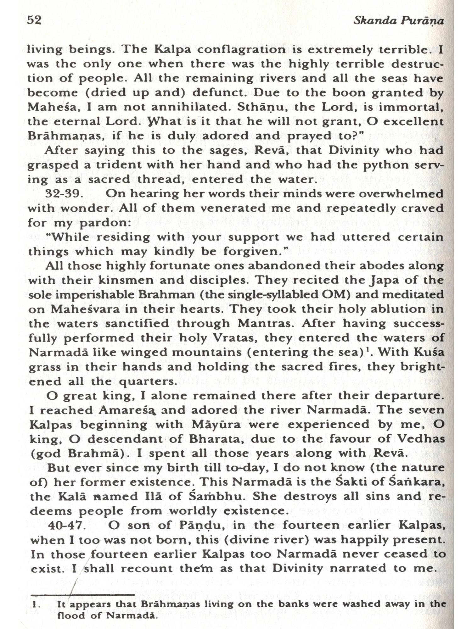 Five For countless ages, the sacred Narmada, flowing in her river form, has served as a wellspring of deep spiritual encounters; individuals from all walks of life, including sages, have journeyed to her waters in search of the spiritual growth she bestows upon her devotees. This phenomenon is not exclusive to humans; the scriptures illustrate numerous instances where various animals have formed a connection with her. While Narmada unfolds across numerous pages, the contributions of Swami Jayramdas in this book, which compellingly consolidates many traditional offerings into a single volume, are indeed timely and much needed. Before delving into the original material of the book, I would like to explore the river's current condition and the status it has been accorded in various Hindu shastras.