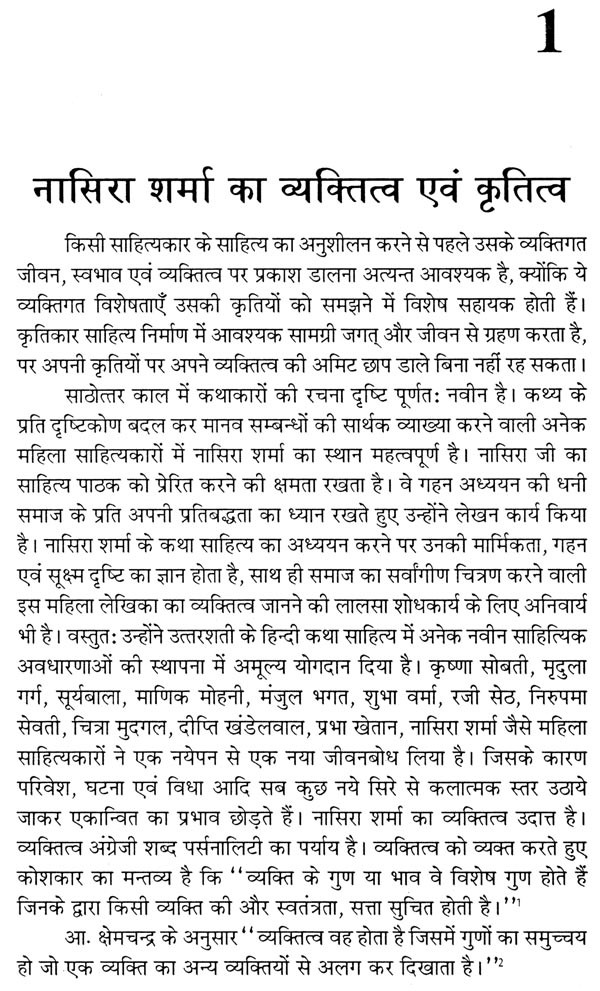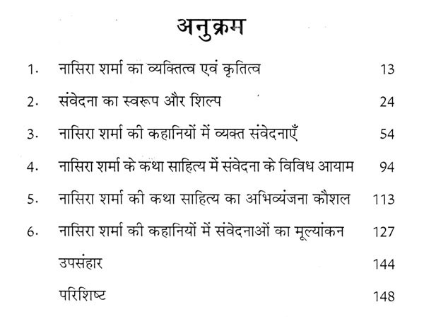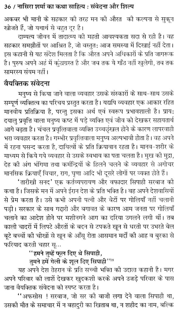 अर्थात् मेरी कर्मभूमि ने मुझे केवल हिंदी साहित्य की ओर आकर्षित ही नहीं किया बल्कि अनुसंधान का एक नया आयाम खोल दिया। साहित्य के किसी भी विधा या विषय को कैसे किस दृष्टि से समझना चाहिए? कैसे उसका विश्लेषण करना चाहिए? कैसे उसकी मूल संवेदना का आस्वाद लें? कैसे विवेचन करें ? कैसे व्याख्यायित करें ? आदि का सूक्ष्म एवं स्थूल अध्ययन मैंने पुणे विश्वविद्यालय से एम.फिल. करते समय किया था। हिंदी साहित्य में चित्रित स्त्री-विमर्श मुझे इंगित करता रहा और मैं उसकी ओर आकर्षित होती रही। मेरे सौभाग्य से प्राचार्य डॉ. शहाबुद्दीन शेख के सुझाव और मार्गदर्शन से अस्सी के दशक की उद्योन्मुख स्त्री लेखिका नासिरा शर्मा की कहानियों को पढ़कर समझकर अपने अनुसंधान कार्य हेतु इस विषय को चुना। ' नासिरा शर्मा का कथा साहित्य संवेदना और शिल्प' अनुसंधान हेतु अध्ययन की सुविधा की दृष्टि से शोधसामग्री को पाँच अध्यायों में विभक्त किया है- प्रथम अध्याय में नासिरा शर्मा का व्यक्तित्व एवं कृतित्व, द्वितीय अध्याय में संवेदना का स्वरूप एवं शिल्प, तृतीय अध्याय में नासिरा शर्मा के कहानी संग्रह में व्यक्त संवेदनाएँ, चतुर्थ अध्याय में नासिरा शर्मा के कथा साहित्य में संवेदना के विविध आयाम और पंचम अध्याय में नासिरा शर्मा के कथा साहित्य का अभिव्यंजना कौशल है।