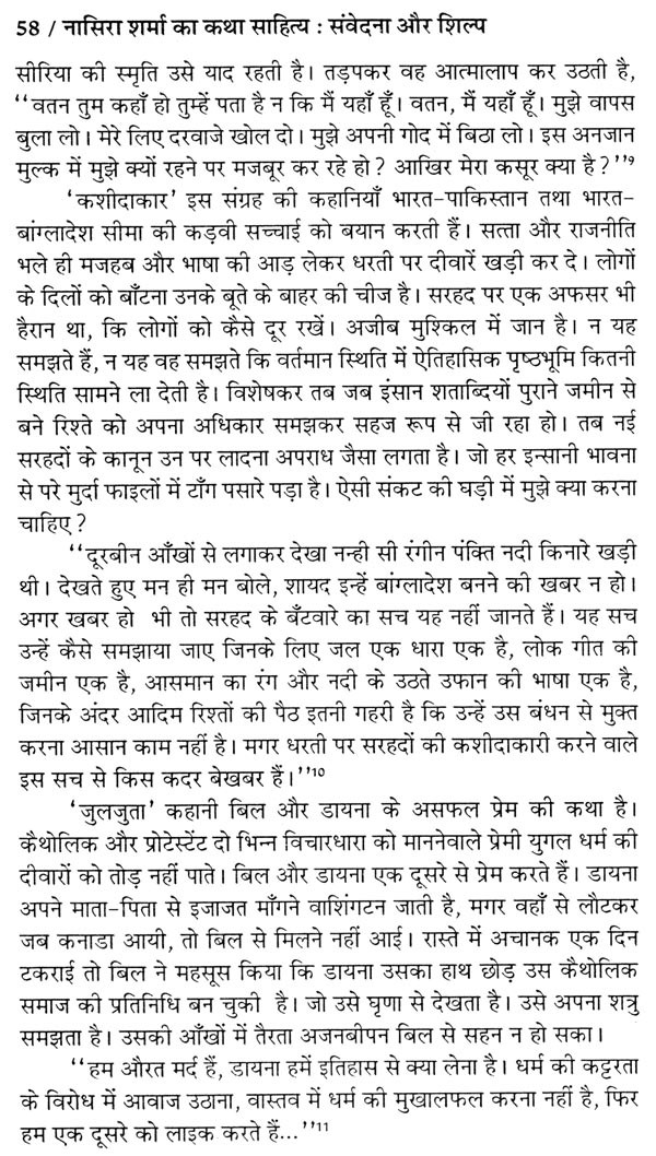 समस्त विश्व में सांप्रदायिकता का विष सांझी संस्कृक्ति के निर्माण को नष्ट करती है। यह बिखरा हुआ विश्व या देश जब एकता, समता के सूत्र में पिरोये जायेंगे, तब वह दिन इन्सानी नस्ल का दिन होगा। यही नासिरा शर्मा के कहानियों में संवेदना है, इन संवेदनाओं को पूरा करने हेतु अभी बहुत करना बाकी है, बहुत कुछ मिटाना बाकी है, बहुत कुछ बनना बाकी है, हमारे भारत देश को आज़ाद करने वाले, सभी देशभक्तों, समाज-सेवकों एवं हित चिंतकों की यही विचारधारा थी कि सब एक हों, समान हों परंतु समय की धूसरता से समाज में यह विचार कहीं बेअसर होने लगते हैं। नासिरा जी का यह एक प्रयास मुझे यह किताब लिखने की प्रेरणा प्रदान करता है कि सर्वधर्मसमभाव एवं वसुधैवकुटुंबकम् की भावना जो खासकर स्त्रियों के लिए सबसे जरूरी है, यहाँ मुझे दुष्यंतकुमार की वह गजल की पंक्तियाँ स्मरण आती हैं-
