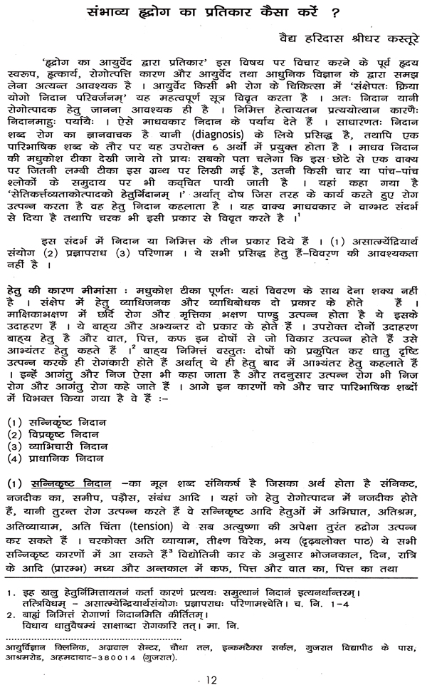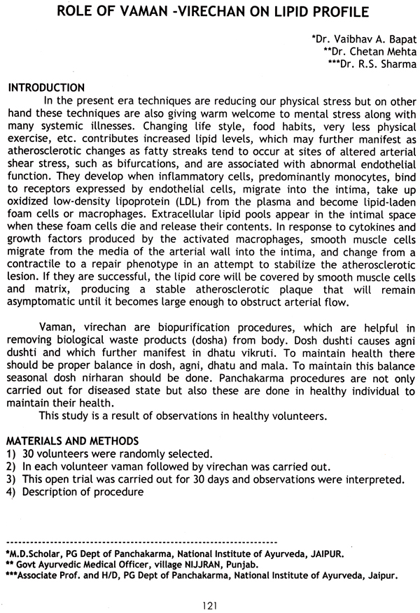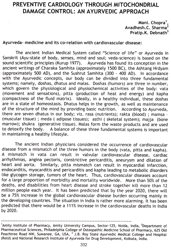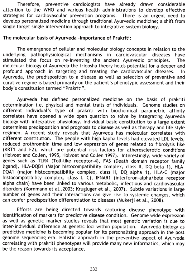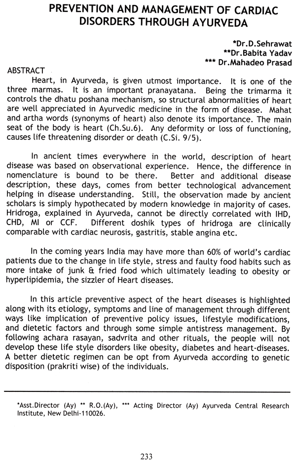 Several risk factors have been identified and their control by preventive interventions is the goal in modern medicine. Preventive cardiology is one of the fields where Ayurveda can accept the challenge and come out with the flying colors, if Ayurvedic principles of maintenance of health and prevention of diseases are applied in their true sense. The realization of preventive cardiology has set in after concerted and sustained sincere efforts in this direction by scientists in several fields including cardiologists, geneticists, dietetics, pharmacists etc. This unique Ayurvedic concept, which was once frowned at is now guru mantra for a healthy life.