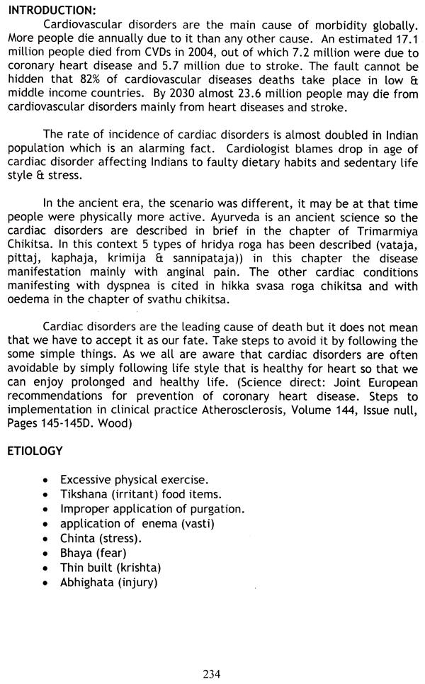 Cardiac disorders were considered fatal in ancient days and are so even today. The incidence of rate and fatality due to these appear to be increased because of increase in risk factors. Psychological factors including stress and fear were considered the causative factors thousands of years ago and are so even today. However, in stead of obesity it was karshana which led to the cardiac pathology. Similarly excessive exercise was a major cause of hridroga in those days. Today the improved financial status of people has changed the etiological scenario on the extreme side of the graph in these two aspects; as a result, lack of exercise and obesity are leading risk factors for preventable cardiac disorders.